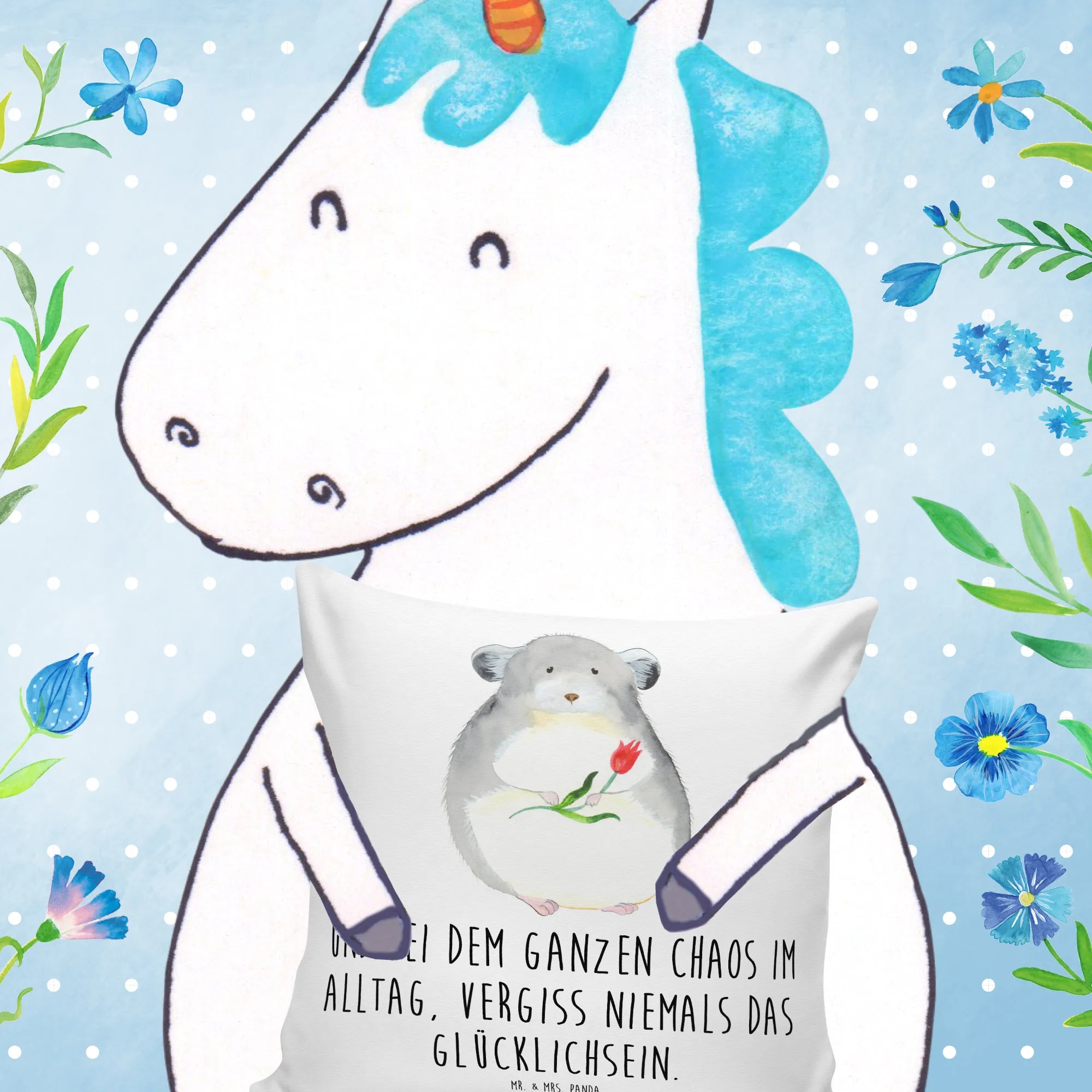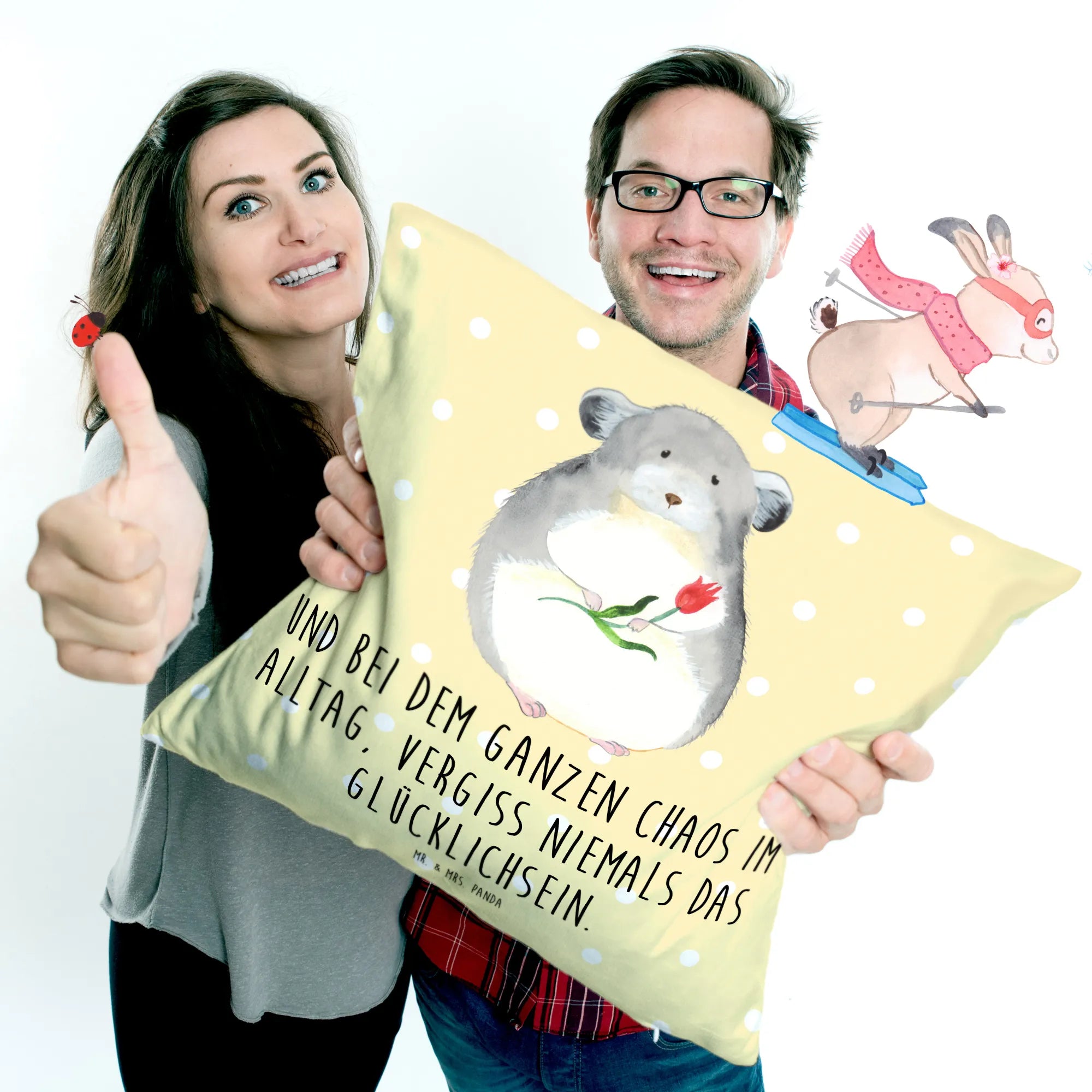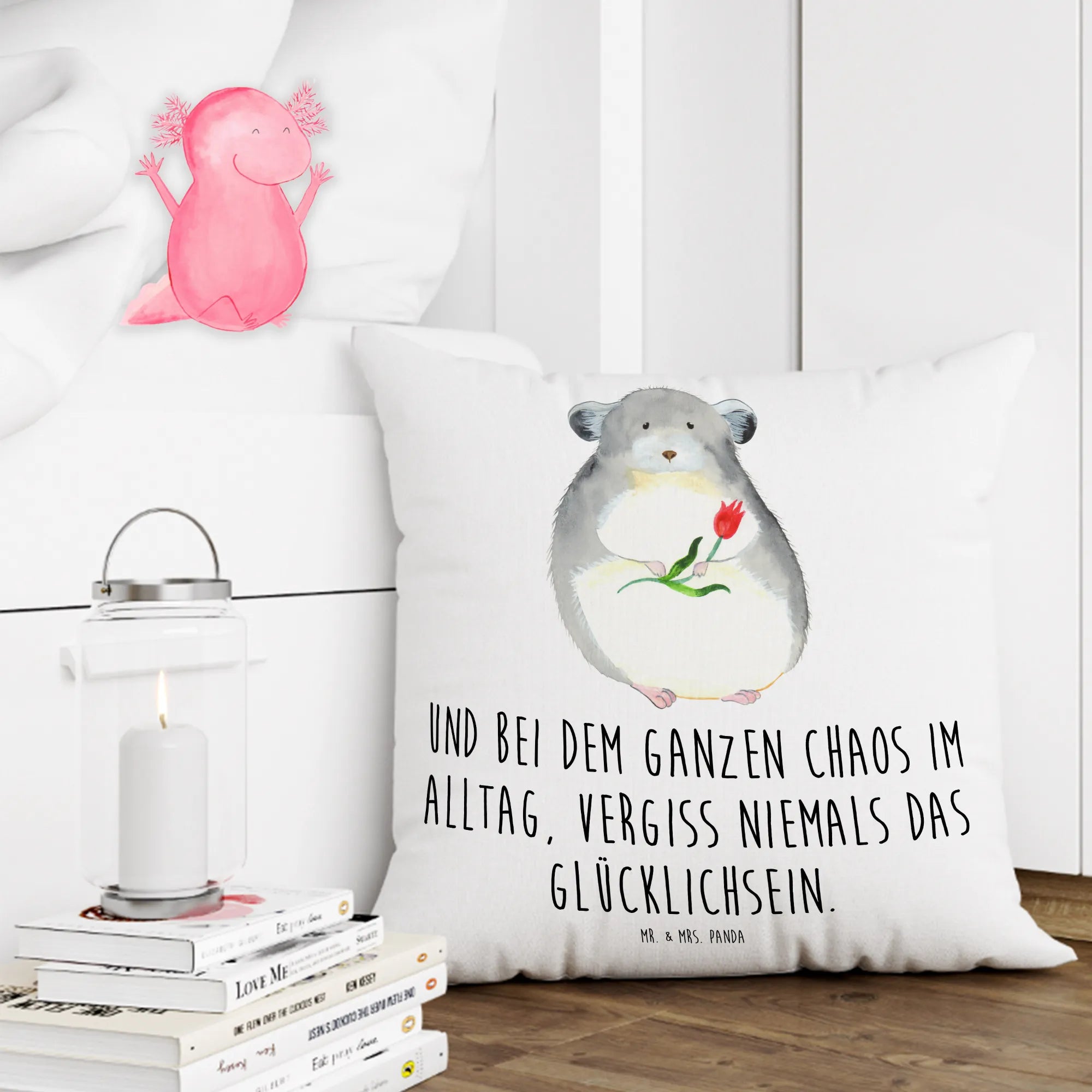 Ein kleines Glück für jeden Tag: Dieses 40x40 Kissen aus der Small World Kollektion von Mr. & Mrs. Panda bringt Dir mit dem Motiv „Chinchilla mit Blume“ ein Lächeln in Alltag und Büro. Das flauschige Chinchilla hält einen Blumenstrauß in der Hand und blickt Dich mit großen Augen an. Der integrierte Spruch „Und bei dem ganzen Chaos im Alltag, vergiss niemals das Glücklichsein.“ erinnert Dich liebevoll daran, das Positive nicht zu vergessen. 🌸