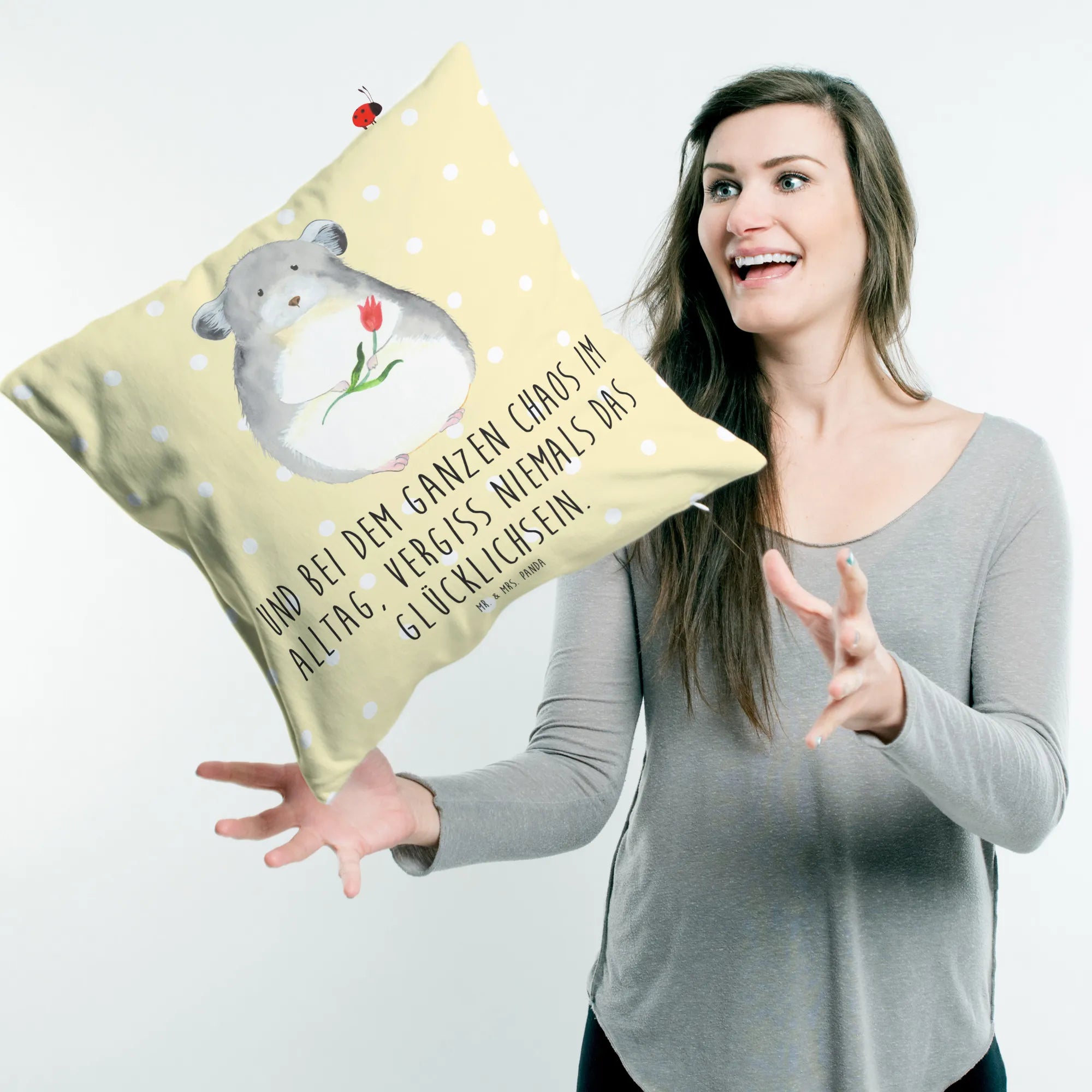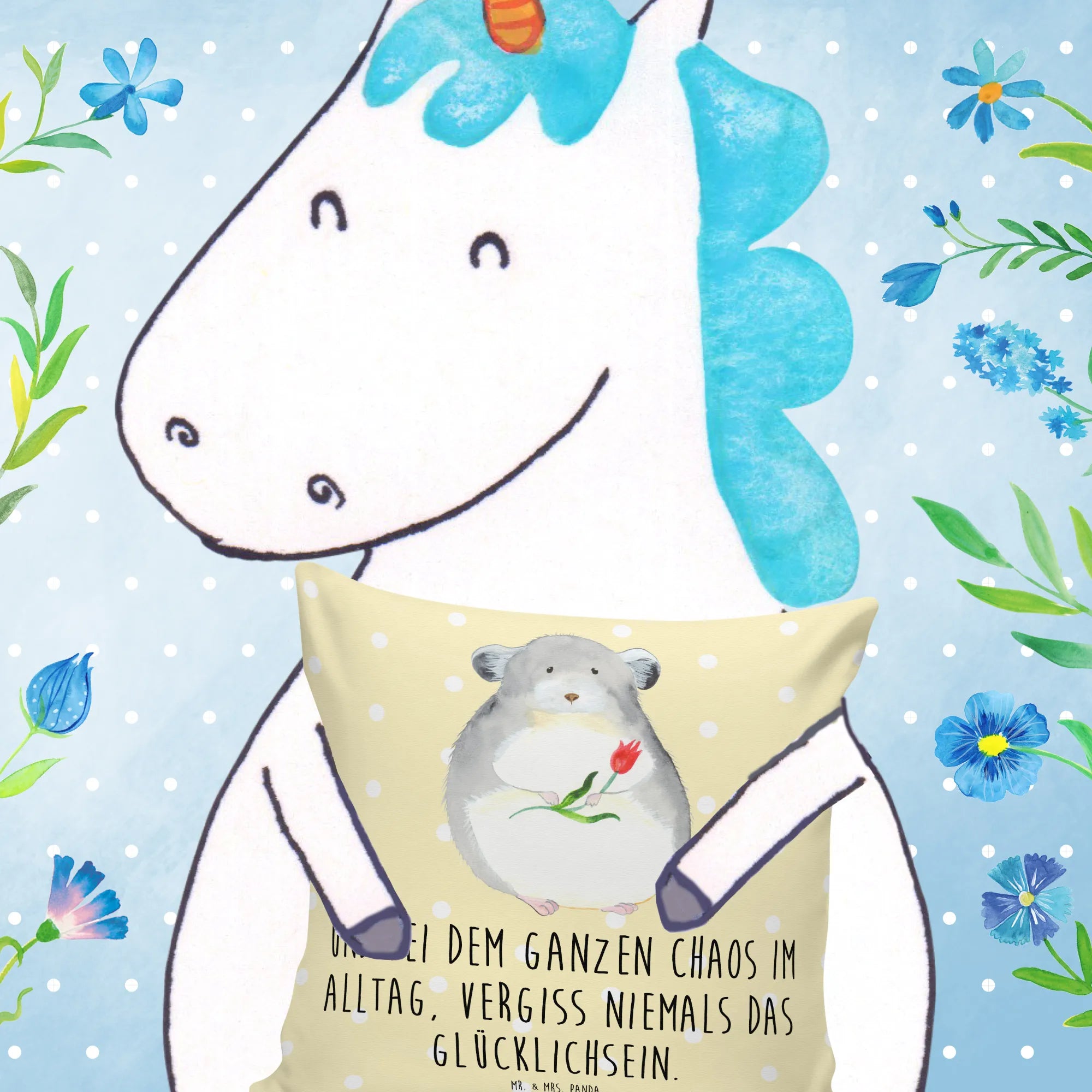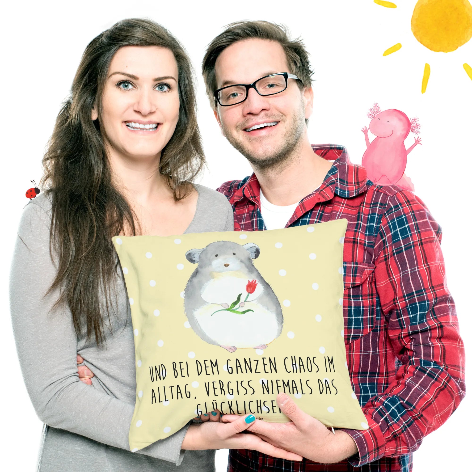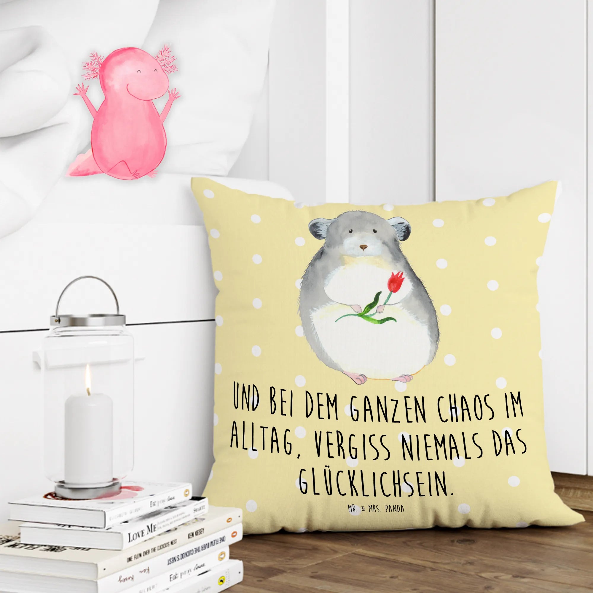 Ein kleines Glück für jeden Tag: Dieses 40x40 Kissen aus der Small World Kollektion von Mr. & Mrs. Panda bringt Dir mit dem Motiv „Chinchilla mit Blume“ ein Lächeln in Alltag und Büro. Das flauschige Chinchilla hält einen Blumenstrauß in der Hand und blickt Dich mit großen Augen an. Der integrierte Spruch „Und bei dem ganzen Chaos im Alltag, vergiss niemals das Glücklichsein.“ erinnert Dich liebevoll daran, das Positive nicht zu vergessen. 🌸
