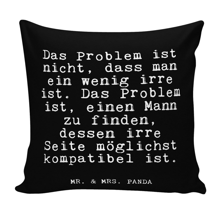 Entdecke die perfekte Kissenhülle von Mr. & Mrs. Panda mit dem charmanten Spruch: "Das Problem ist nicht, dass man ein wenig irre ist. Das Problem ist, einen Mann zu finden, dessen irre Seite möglichst kompatibel ist." Dieses 40x40 cm große Dekokissen bringt nicht nur Farbe und Gemütlichkeit in dein Zuhause, sondern auch eine Portion Humor, die perfekt in jede Einrichtung passt!