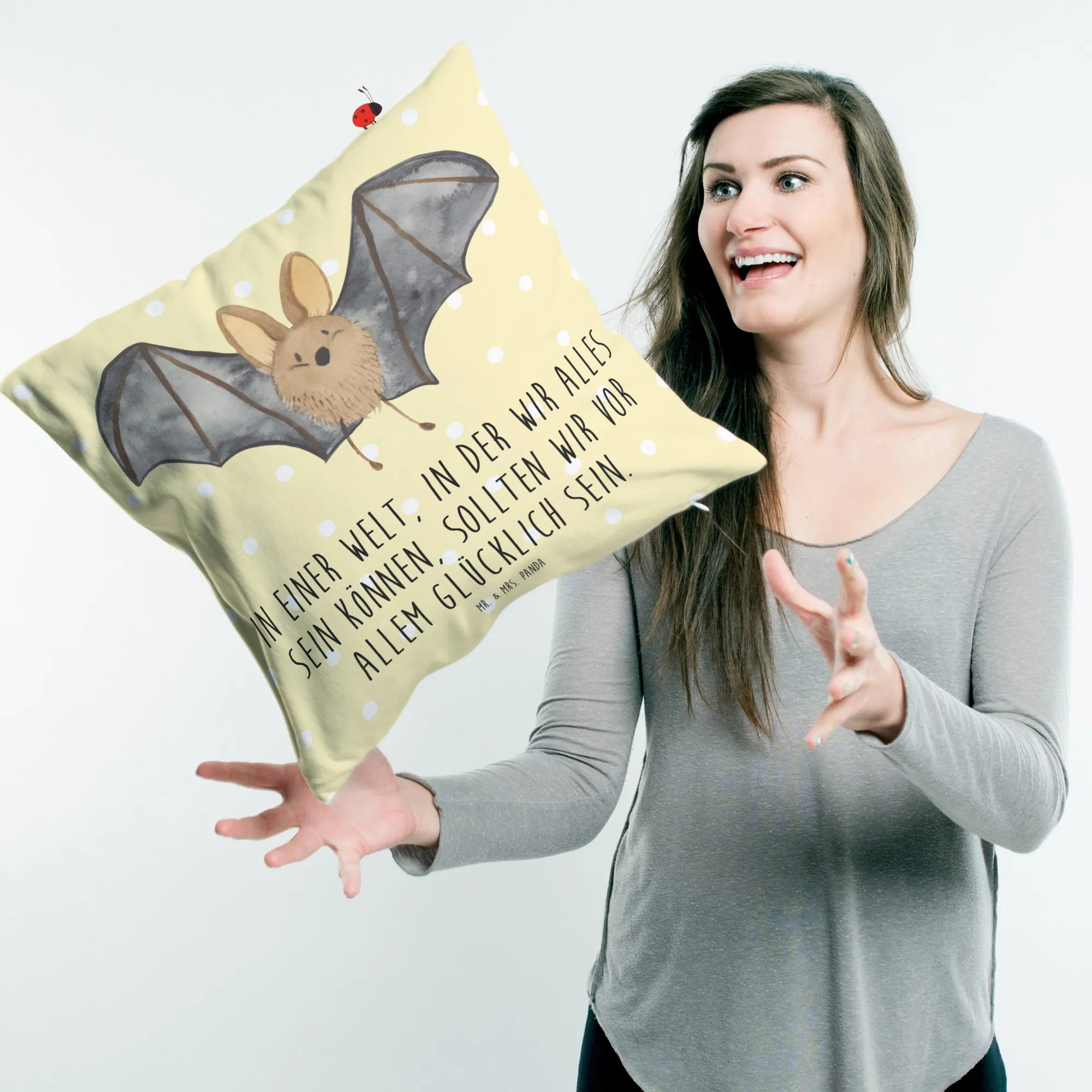 Lass die Flügelschläge dieser niedlichen Fledermaus deine Fantasie anregen und genieße den Moment! In einer Welt, in der wir alles sein können, sollten wir vor allem glücklich sein – und mit diesem Kissen wird das auf jeden Fall gelingen!