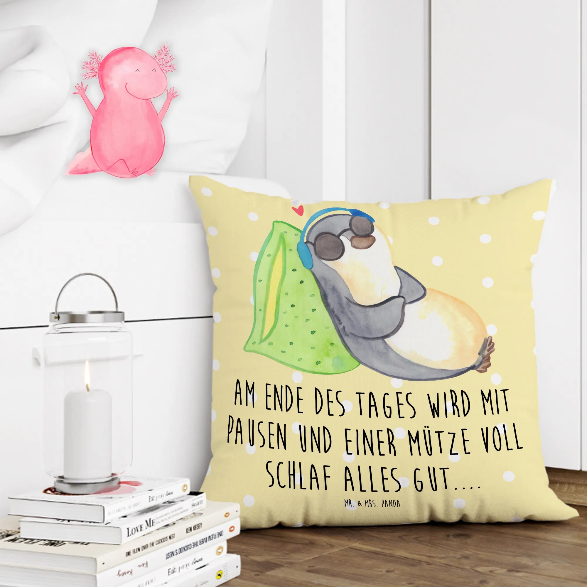 Der Pinguin entspannt sich auf einem Kissen mit Sonnenbrille und Kopfhörern – genau das richtige Bild für all diejenigen, die eine Pause vom Alltag brauchen. Es ist mehr als nur ein Dekokissen; es ist ein Zeichen für die besonderen Fähigkeiten, die in jedem von uns schlummern, egal ob wir mit körperlichen oder psychischen Herausforderungen leben.