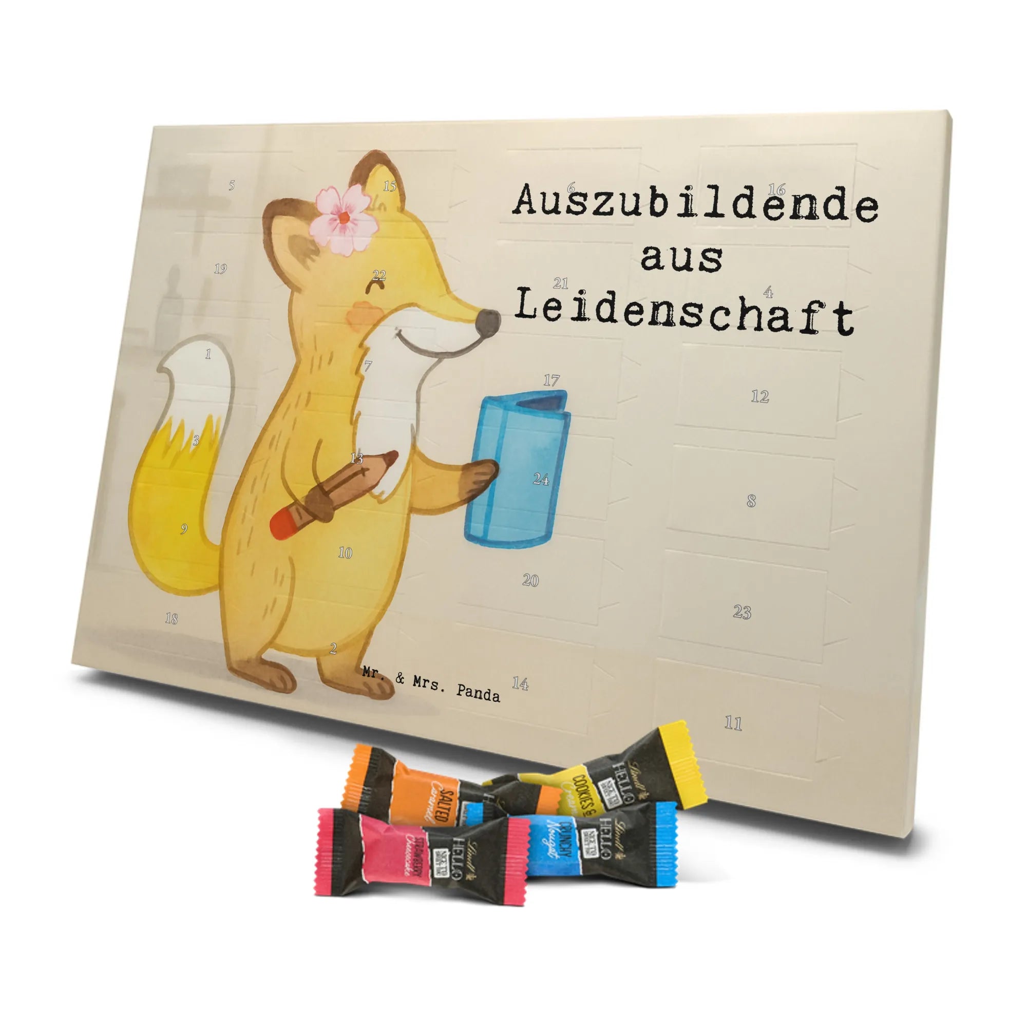 Wunderschöner Schoko Adventskalender von Mr. & Mrs. Panda – perfekt, wenn du dir oder deinen Liebsten die Adventszeit mit süßen Überraschungen versüßen willst. Unser liebevoll gestalteter Schokoladen Adventskalender ist bedruckt mit bezaubernden Motiven und frechen Sprüchen von Mr. & Mrs. Panda und sorgt jeden Tag für ein Lächeln. Der Kalender ist nicht personalisierbar, dafür aber in brillanter Druckqualität mit seidenmatter Oberflächenveredelung gefertigt. Auch die Seitenflächen sind vollständig bedruckt, was dem Design noch mehr Tiefe verleiht. Maße: 325 mm x 225 mm x 27 mm. Besonders praktisch: Der Kalender kann aufgehängt oder aufgestellt werden – so findest du immer den idealen Platz bei dir zu Hause. Gefüllt mit Lindt Hello Schokolade: 24 einzeln verpackte Schokoladen Mini Sticks in vier verschiedenen Sorten – Karamell-Schokoladenkuchen, Kekse, Knuspriger Nougat und Erdbeer-Cheesecake. Zutaten und Allergene findest du auf der Verpackung; wichtige Hinweise: enthält Milcheiweiß, Milchzucker, Soja, Weizen und Haselnüsse, kann Mandeln und andere Schalenfrüchte enthalten. Dieser Adventskalender ist eine liebevolle Geschenkidee für Freunde, Familie und alle Schoko-Fans, die jeden Tag bis Weihnachten mit feinem Schoko-Genuss feiern möchten.