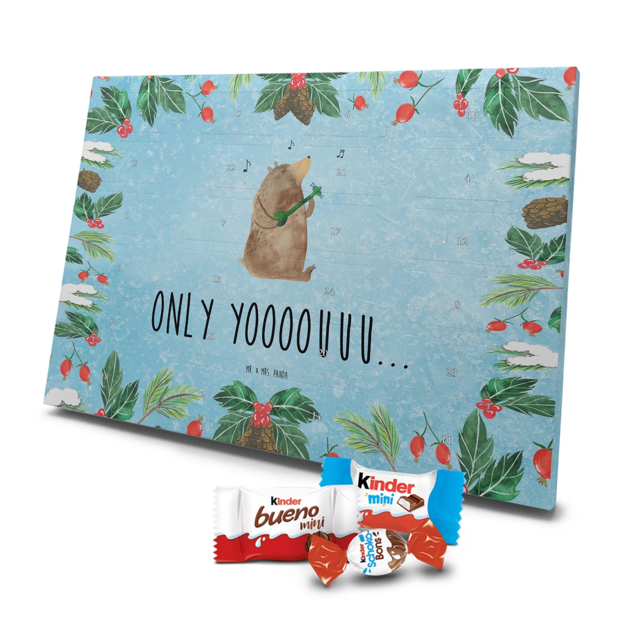 Wunderschöner Schoko Adventskalender von Mr. & Mrs. Panda – perfekt, wenn du die Vorweihnachtszeit mit einem liebevoll gestalteten Kalender versüßen möchtest. Unser Kalender ist bedruckt mit wunderschönen Motiven & Sprüchen von Mr. & Mrs. Panda und eignet sich hervorragend als Geschenk für Freunde, Familie oder einfach für dich selbst. Er ist nicht personalisierbar, dafür aber mit viel Liebe zum Detail gestaltet. Die brillante Druckqualität mit seidenmatter Oberflächenveredelung sorgt für edles Aussehen, und die bedruckten Seitenflächen geben dem Kalender einen wertigen Gesamteindruck. Maße: 355 mm x 245 mm x 11 mm. Besonderheit: kann aufgehängt oder aufgestellt werden – so findest du immer den perfekten Platz bei dir zuhause. Gefüllt mit Markenname Schokolade: Adventskalender gefüllt mit kinder® Schokolade. Inhalt: kinder® Schoko-Bons, kinder® Bueno mini und kinder® Schokolade mini. Der Kalender bietet 24 Türchen mit kleinen Überraschungen, die Kinderherzen höherschlagen lassen und Erwachsene schmunzeln. Er ist robust verarbeitet und ideal für den täglichen Genuss in der Adventszeit. Ob dekorativ auf der Kommode oder an der Wand aufgehängt – er bringt Freude und süße Momente in die Vorweihnachtszeit. Bestelle jetzt und mach dir oder deinen Lieben die Adventszeit ein bisschen süßer!