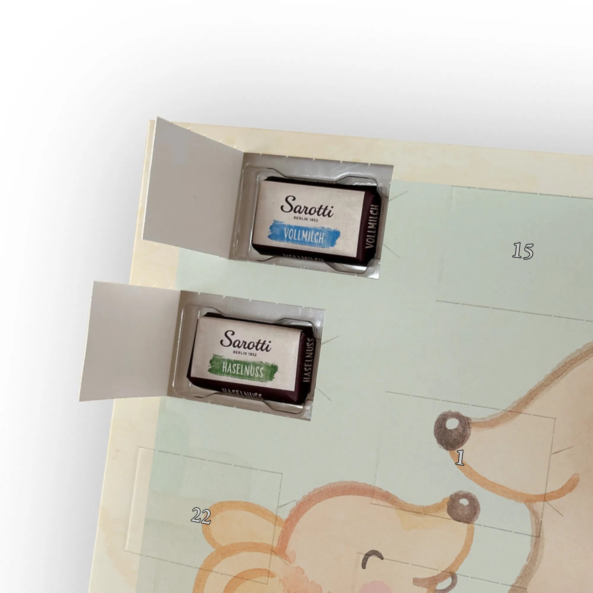 🐼 ADVENTSKALENDER MIT SCHOKOLADE: Liebevolle Illustrationen, seidenmatter Druck, 325×225×27 mm.