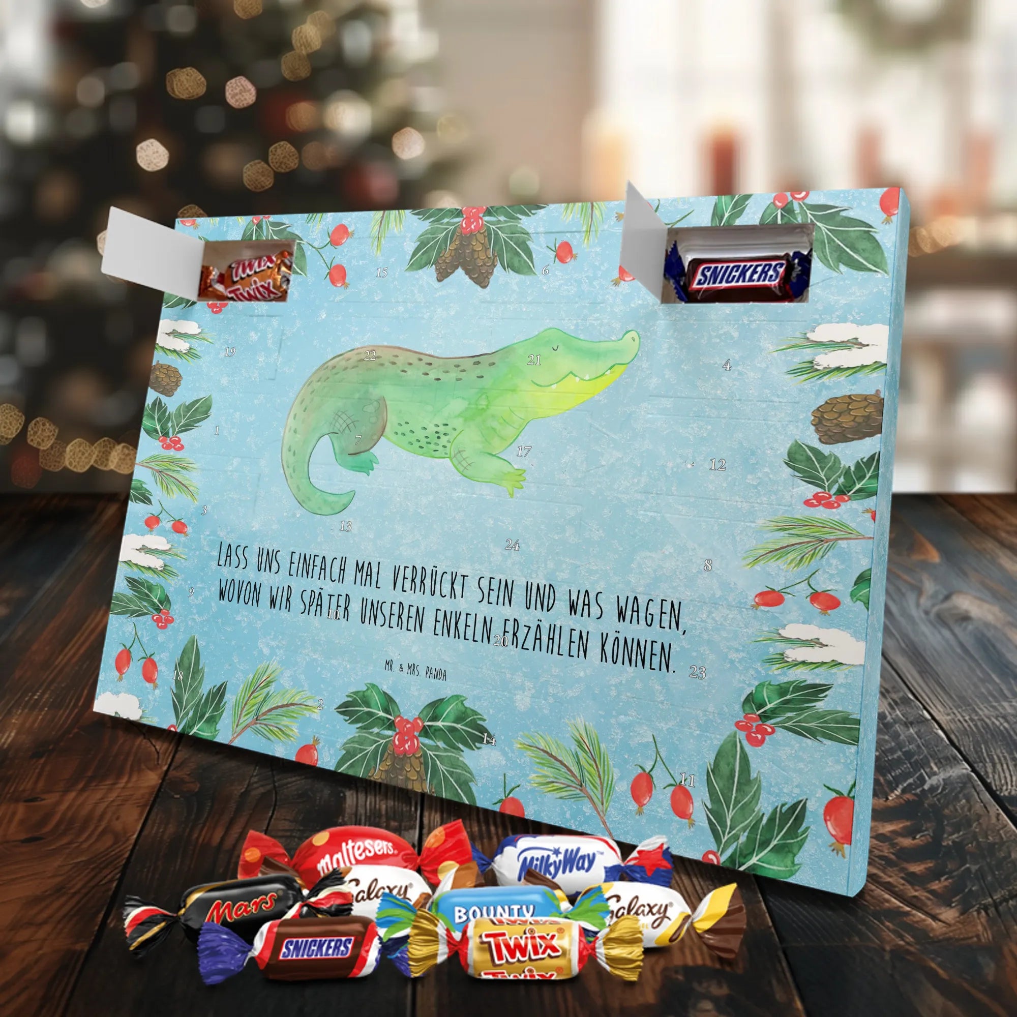 Dieser liebevoll gestaltete Schokoladen Adventskalender ist das ideale Geschenk für Deine Freundin, Deine beste Freundin oder Deinen Lieblingsmenschen, der das Meer und spontane Abenteuer liebt. Das entspannte Krokodil-Motiv in sanften Grün- und Blautönen strahlt Wärme und Lebensfreude aus. Der eingedruckte Spruch „Lass uns einfach mal verrückt sein und was wagen, wovon wir später unseren Enkeln erzählen können.“ macht den Kalender zu einer kleinen Mutmach-Geschichte für jeden Tag.