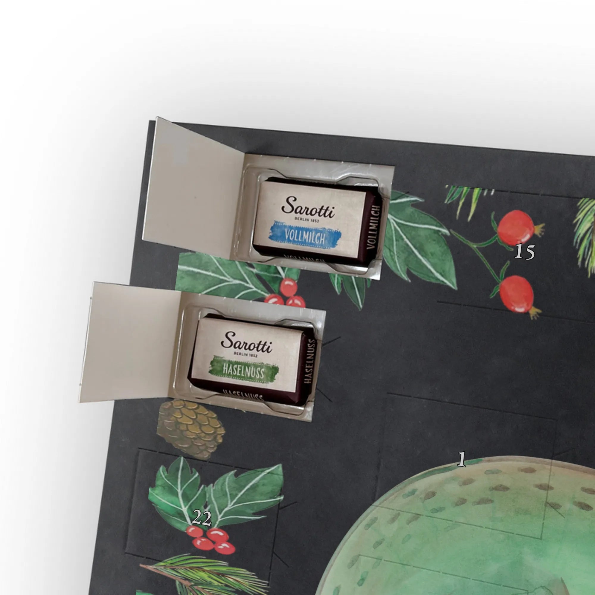 Schon unser Schoko-Adventskalender von Mr. & Mrs. Panda gesehen? Ein liebevoll gestalteter Kalender, bedruckt mit wunderschönen Motiven & Sprüchen, der deine Adventszeit versüßt. Der Kalender ist nicht personalisierbar, überzeugt aber durch brillante Druckqualität mit seidenmatter Oberflächenveredelung und bedruckte Seitenflächen für ein rundum schönes Erscheinungsbild. Maße: 325 mm x 225 mm x 27 mm. Du kannst ihn aufhängen oder aufstellen – ganz wie es dir gefällt. Gefüllt mit Ritter Sport Schokowürfeln in köstlichen Sorten: Mousse au Chocolat, Schoko Crisp, Voll-Nuss in Nougatcreme, Karamell Duo, Joghurt und Erdbeer-Joghurt. Bitte beachten: Es handelt sich um einen Kalender gefüllt mit Ritter Sport Schokolade, nicht um einen Kalender der Marke Ritter Sport. Ob als Geschenk oder für dich selbst – dieser Schoko-Adventskalender bringt täglich kleine Glücksmomente und süße Überraschungen.