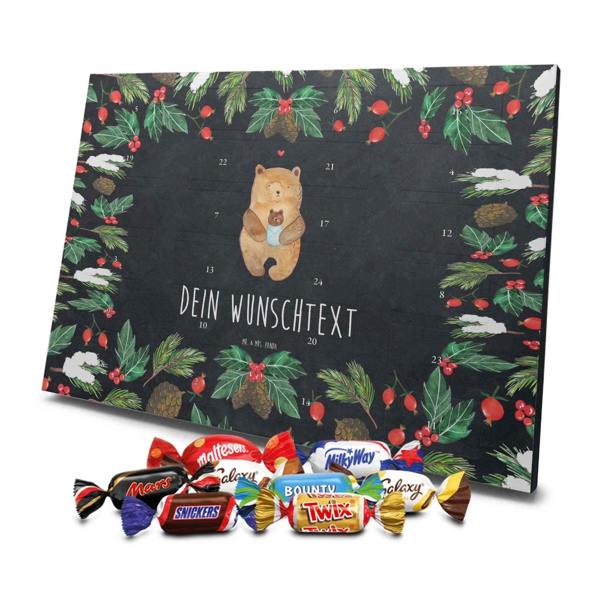 Adventskalender mit deinem Namen – individuell, süß und mit ganz viel Mr. & Mrs. Panda Charme! Dieser personalisierbare Schoko Adventskalender wird mit liebevollen Motiven & frechen Sprüchen bedruckt und lässt sich mit deinem Wunschnamen oder Wunschtext individualisieren. Durch die brillante Druckqualität und die seidenmatte Oberflächenveredelung wirken die Farben besonders intensiv und hochwertig. Auch die Seitenflächen sind bedruckt, sodass das Gesamtbild stimmig ist. Du hast die Wahl: Häng den Kalender auf oder stell ihn auf – beides funktioniert super. Der Kalender ist gefüllt mit Celebrations und enthält 24 hochwertige Füllungen in 8 verschiedenen Sorten, darunter Maltesers, Mars, Snickers, Twix, Milky Way, Bounty, Galaxy und Galaxy Caramel, die dir jeden Tag im Dezember ein Lächeln schenken. Maße: 325 mm x 225 mm x 27 mm – ideal dimensioniert für schöne Türchen-Überraschungen. Verschenke persönliche Vorfreude an Freunde, Familie oder gönn dir selbst diese zuckersüße Adventsüberraschung von Mr. & Mrs. Panda.