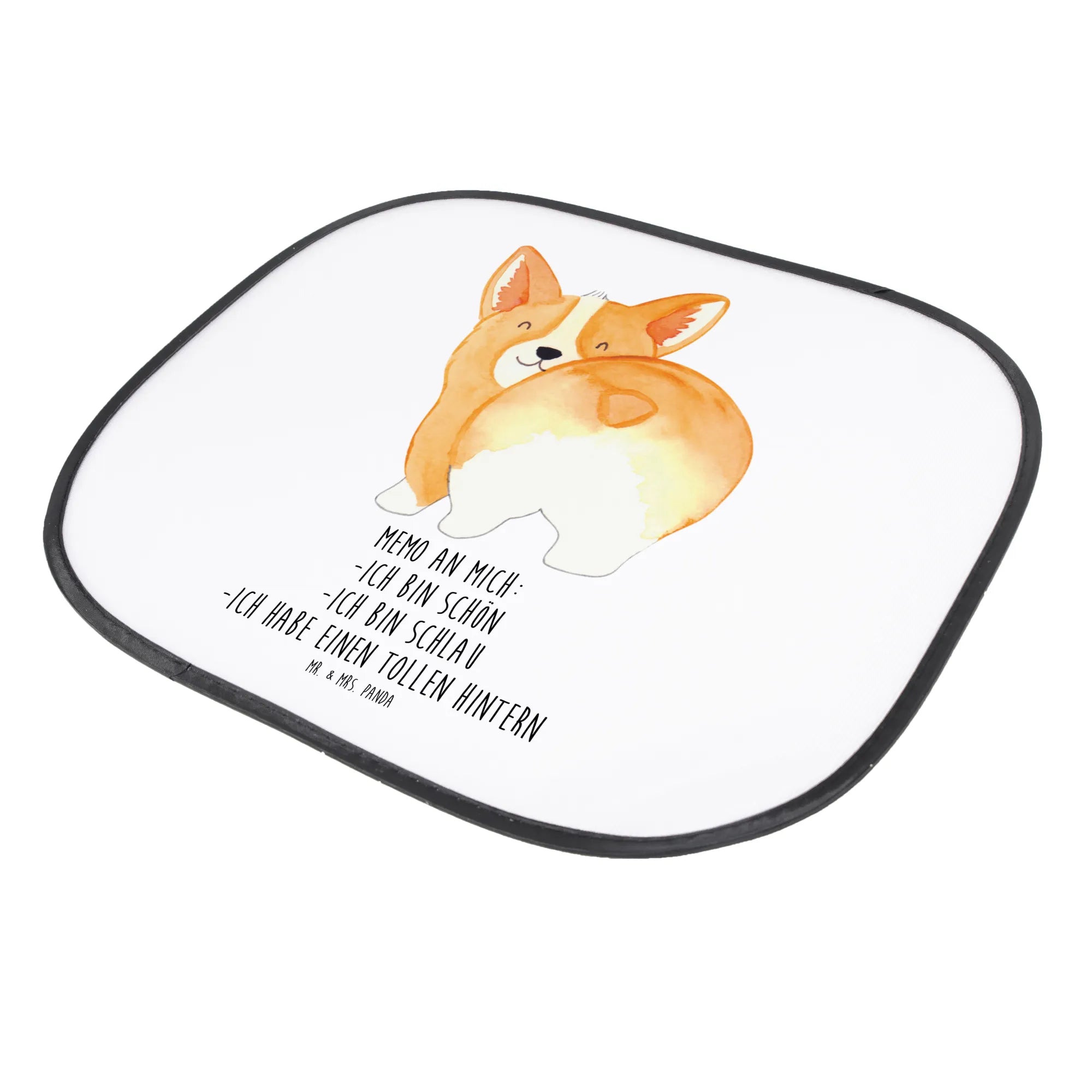 Der niedliche Corgi, der fröhlich seinen Po in die Kamera hält, zaubert jedem ein Lächeln ins Gesicht. Die darauf gedruckte Botschaft ‘Memo an mich: - ich bin schön - ich bin schlau - ich habe einen tollen Hintern’ vermittelt nicht nur ein positives Lebensgefühl, sondern macht aus dem Sonnenschutz ein tolles Accessoire für jedes Auto.