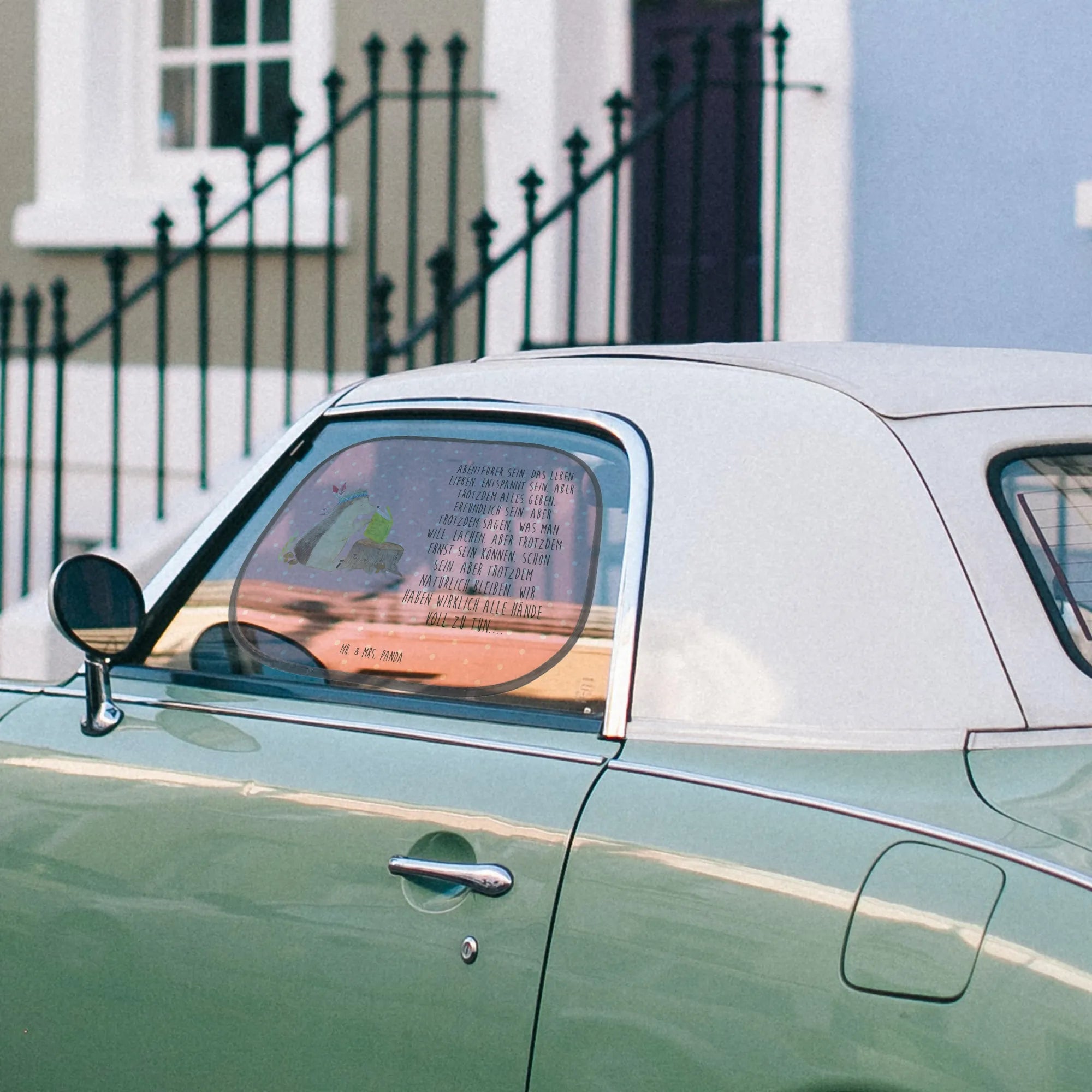 Ein wunderschöner Sonnenschutz fürs Auto von Mr. & Mrs. Panda – liebevoll gestaltet mit dem Igel Indianer aus unserer Waldtiere-Kollektion. Du willst dein Auto vor starker Sonneneinstrahlung schützen und gleichzeitig ein fröhliches Accessoire haben? Dieser seitliche Sonnenschutz ist genau das Richtige für dich. 🌞