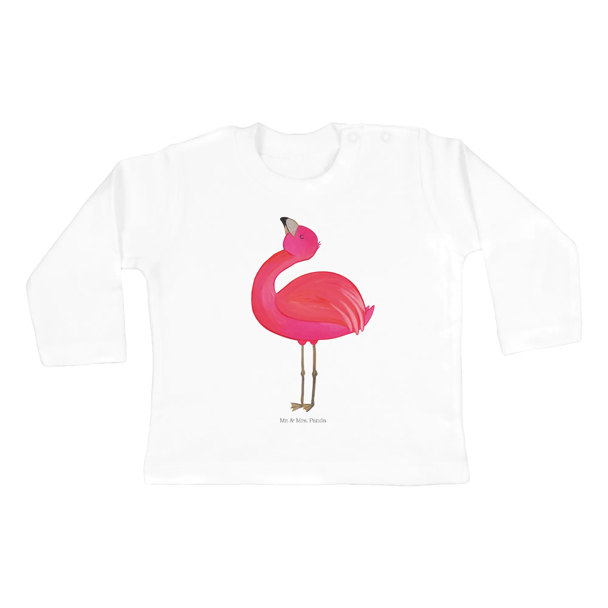 Das süße langärmelige Oberteil für Babys im Alter von 3-6 Monaten strahlt mit seinem bezaubernden Flamingo-Motiv stolz und Freude aus. Das Flamingo stolz Design verkörpert Eleganz und Selbstakzeptanz und wird nicht nur die kleinen Herzen erfreuen, sondern auch die Herzen von Mamas, Papas, Schwestern und besten Freundinnen erobern. Der Flamingo, liebevoll von Mrs. Panda handgezeichnet, zeigt seine prachtvollen Pinselstriche in sanften Rosatönen. Die langen, dünnen Beine und die stolze Pose des Flamingos verleihen diesem langeärmigen Shirt einen ganz besonderen Charme.
