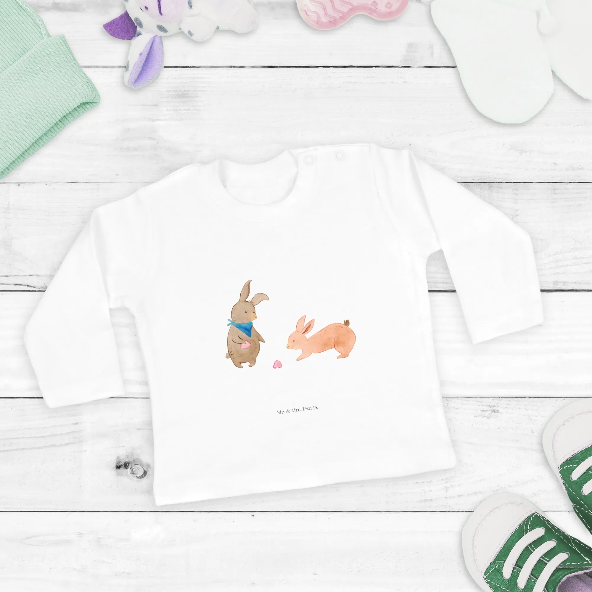 Lass dein Baby in einem hochwertigen Shirt strahlen, während die süßen Hasen und die Muschel ihn auf all seinen Abenteuern begleiten. Hochwertige Kleidung, die nicht nur gut aussieht, sondern auch gut für unseren Planeten ist. Mit dem 3-6 Monate Baby Longsleeve schenkst du nicht nur Freude, sondern auch ein Stück Liebe. Schenke mit Herz und Stil - mit Mr. & Mrs. Panda.