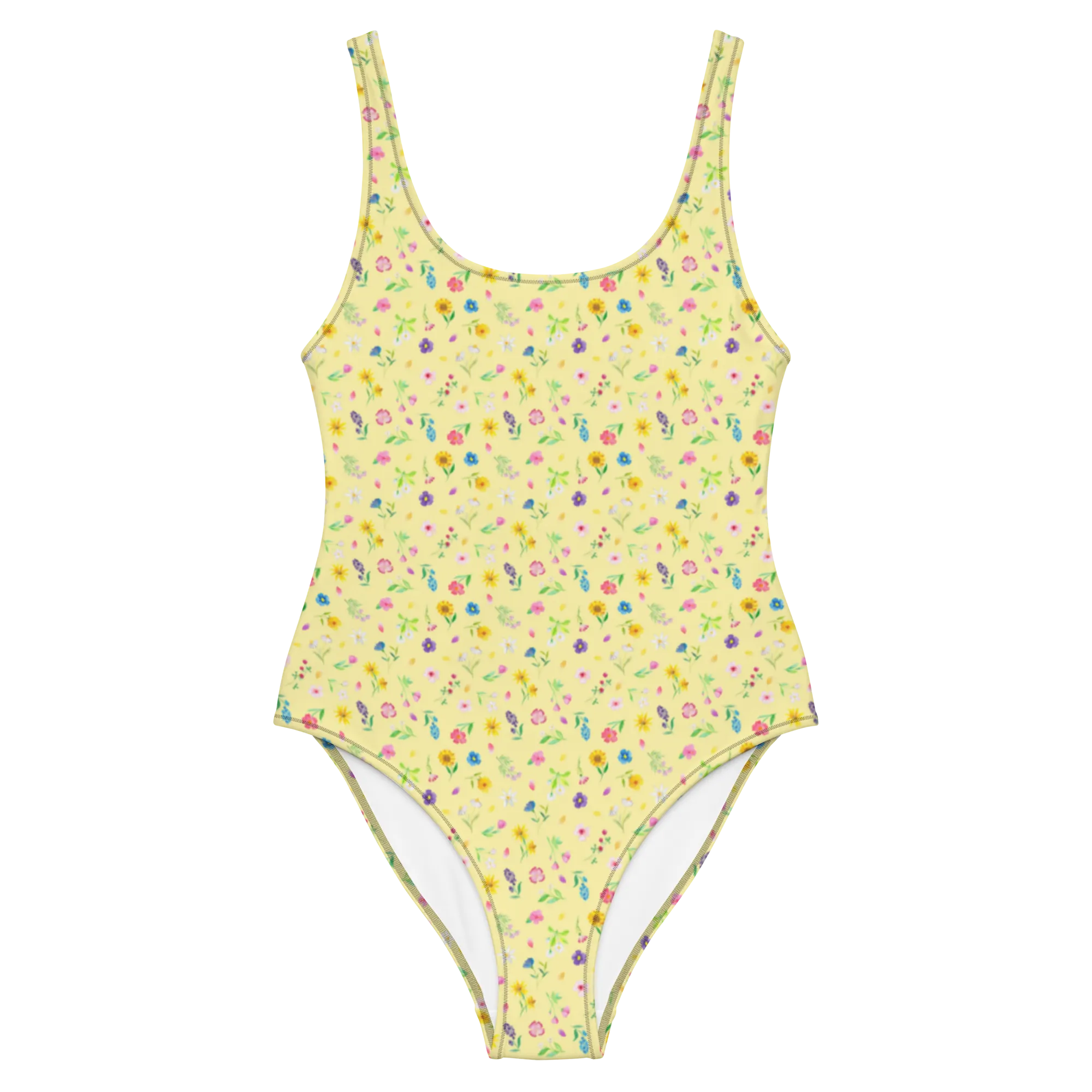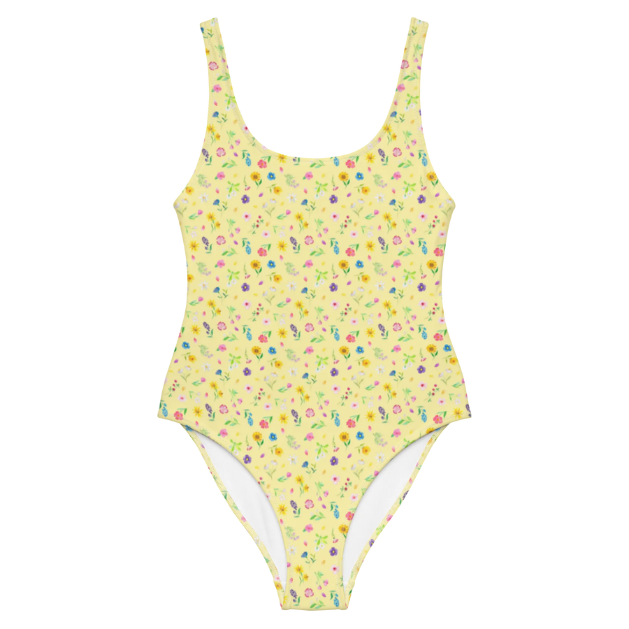 Die gelbe Hintergrundfarbe hebt die Farben der Blumen hervor und sorgt für eine fröhliche Ausstrahlung. Zögere nicht länger! Erlebe die Schönheit einer bunten Blumenwiese und mache es dir mit diesem bezaubernden Badeanzug bequem.