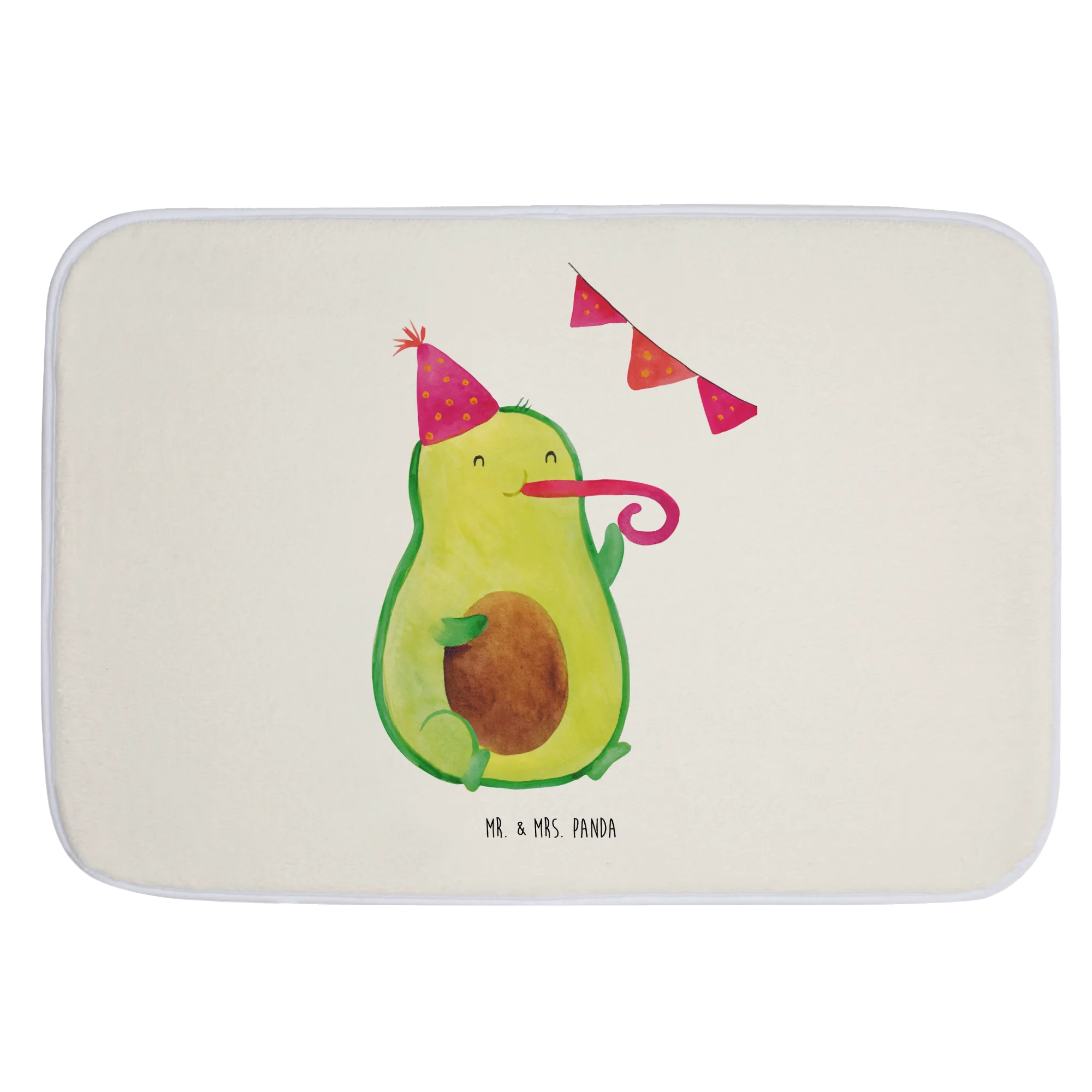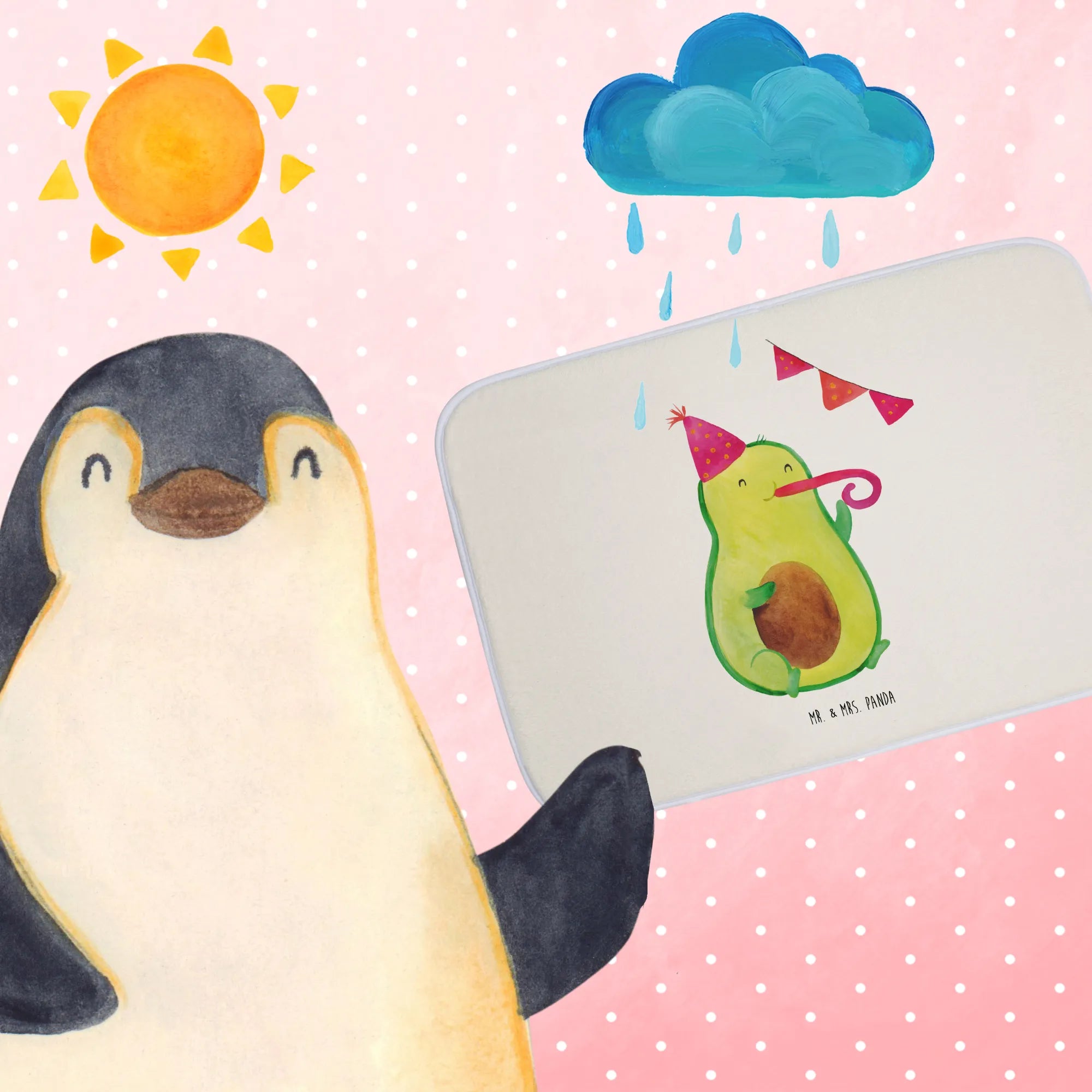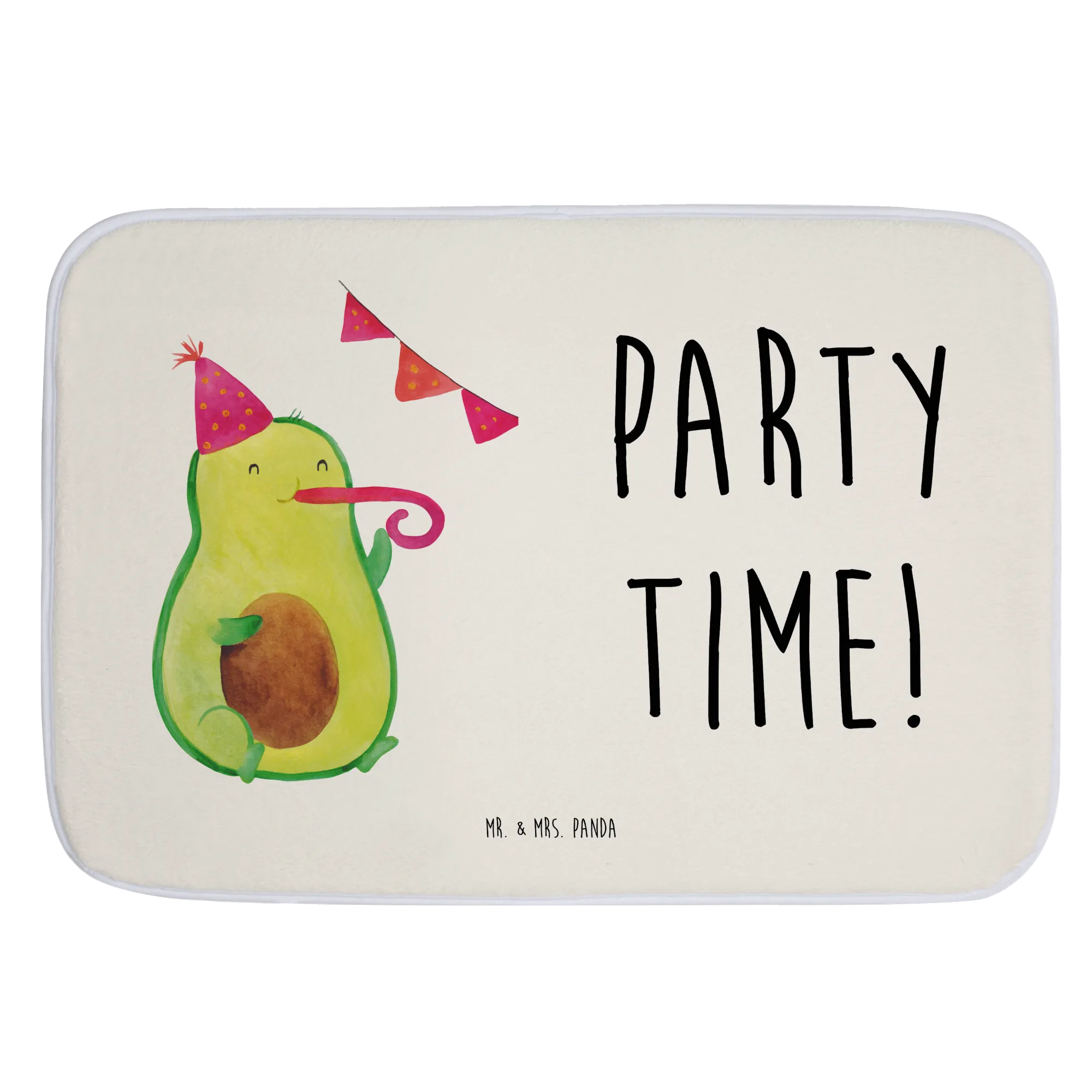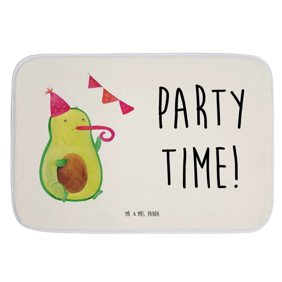 Der Badvorleger "Avocado Party Time" von Mr. & Mrs. Panda ist der perfekte Begleiter für dein Badezimmer. Mit seinem charmanten Design einer süßen Avocado, die einen bunten Partyhut trägt und fröhlich in eine Partypfeife pustet, bringt er sofort gute Laune in jeden Raum.