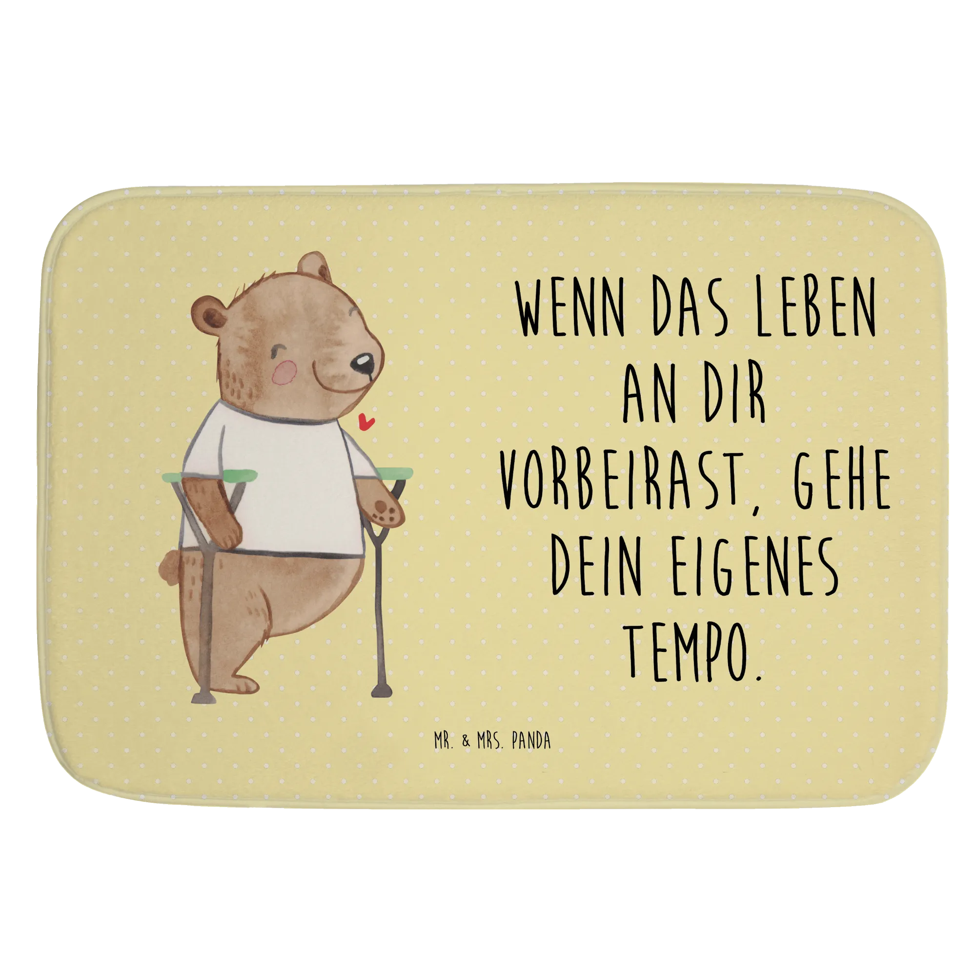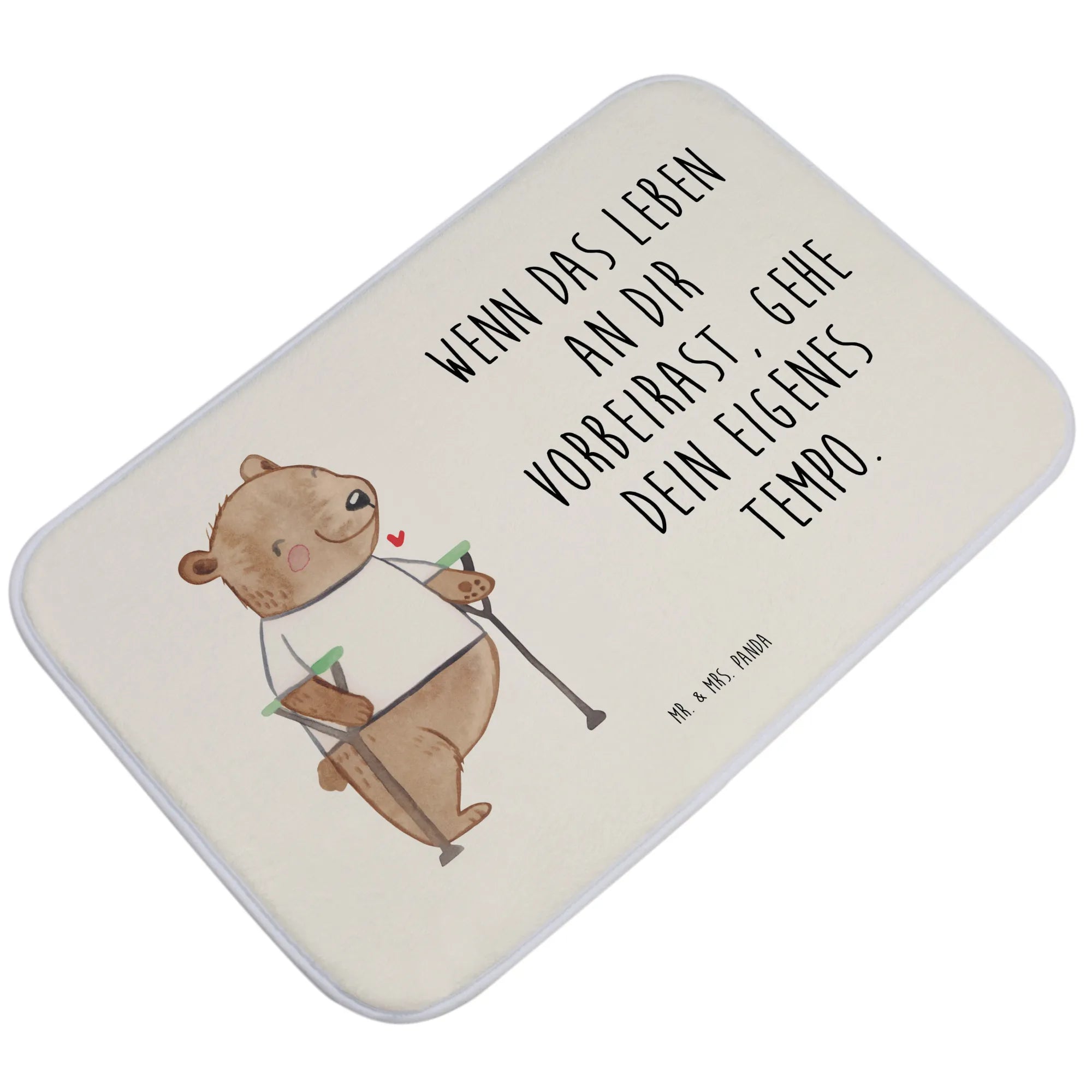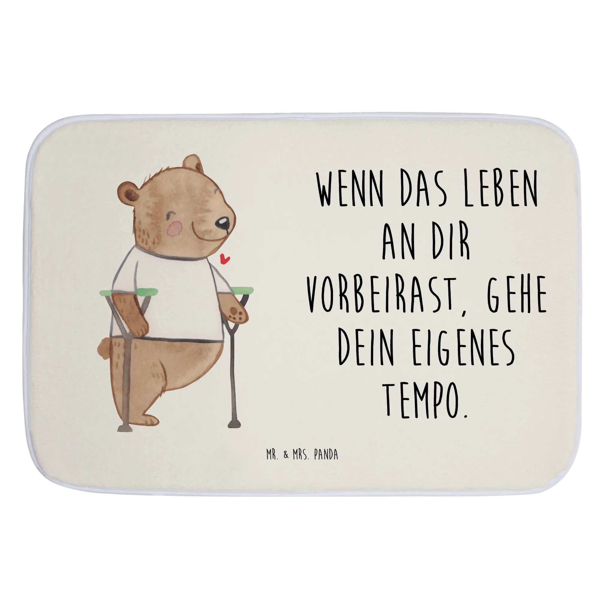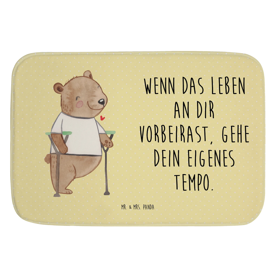 Der Badvorleger mit dem süßen Bärenmotiv "Beinamputation" aus der Kollektion "Tiere mit Superkräften" von Mr. & Mrs. Panda ist das ideale Geschenk für Menschen, die ihren Alltag mit einer Behinderung meistern. Dieser Badteppich verkörpert das Motto: "Wenn das Leben an dir vorbeirast, gehe dein eigenes Tempo." Er steht nicht nur für ein fröhliches Badezimmer, sondern auch für eine wichtige Botschaft: Menschen sind so viel mehr als ihre Defizite.