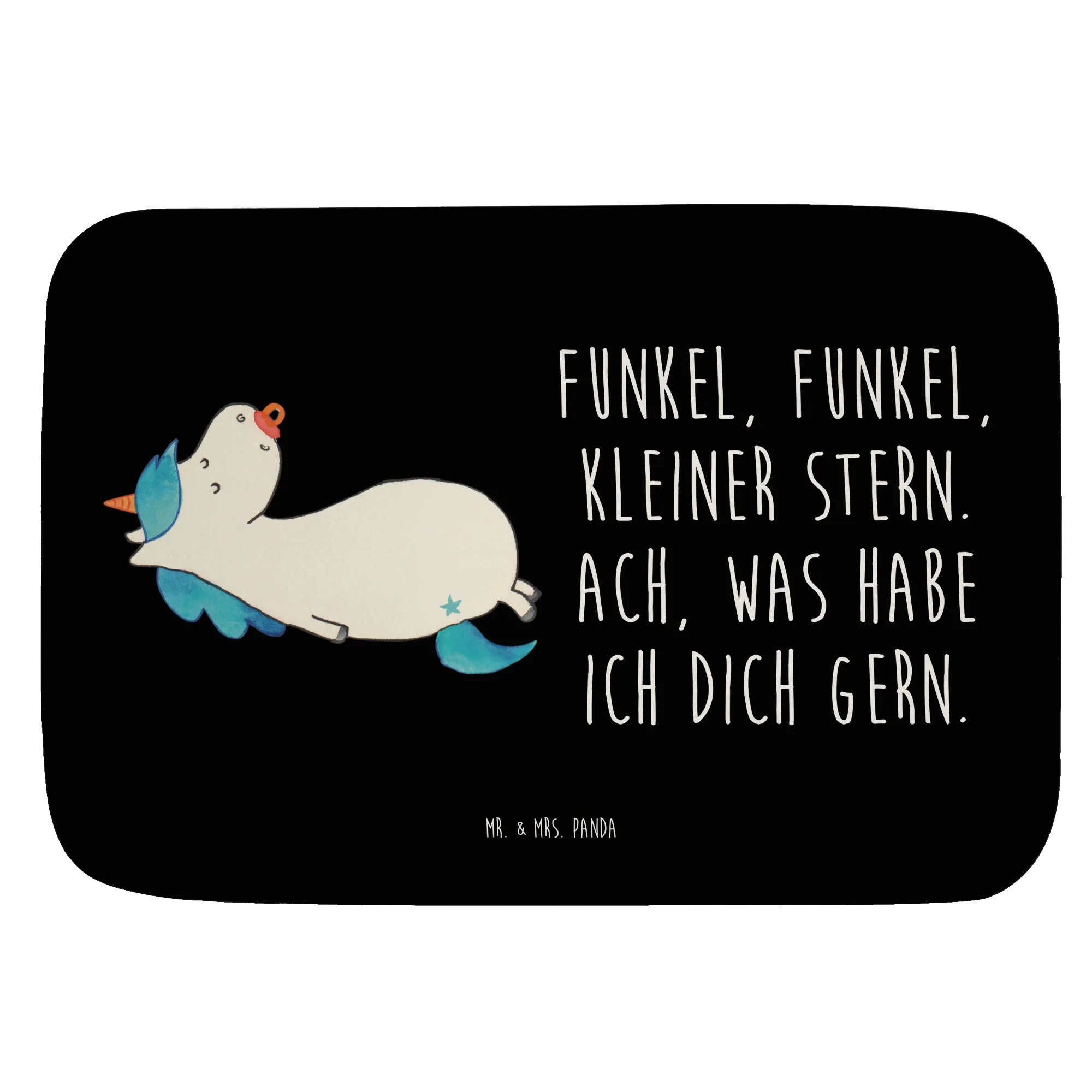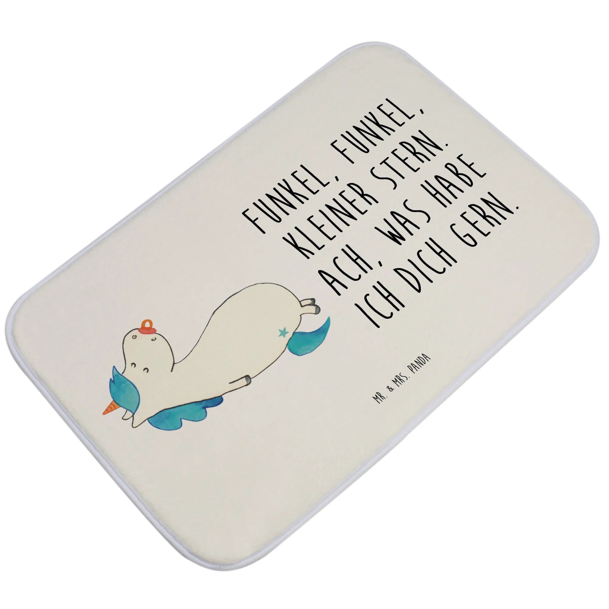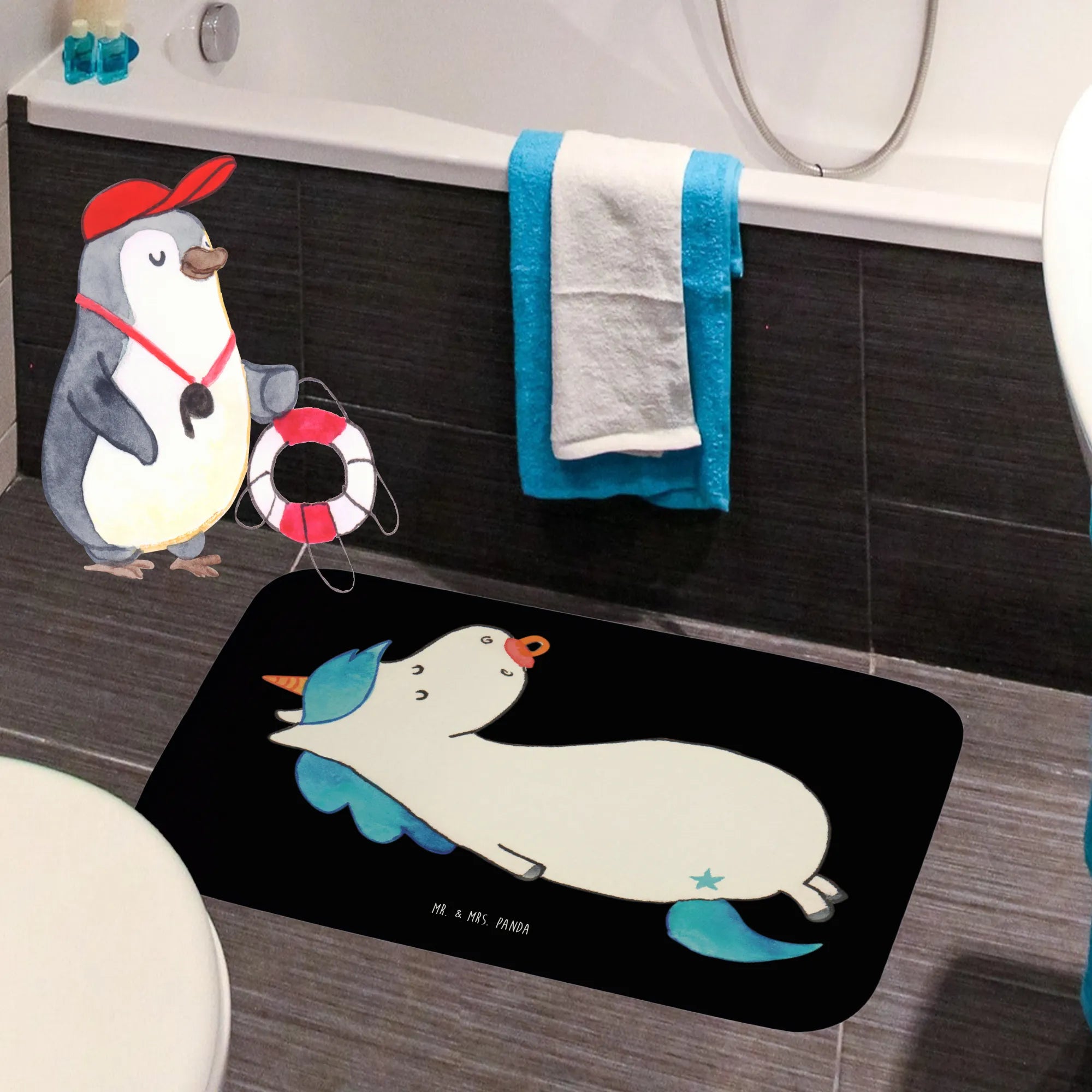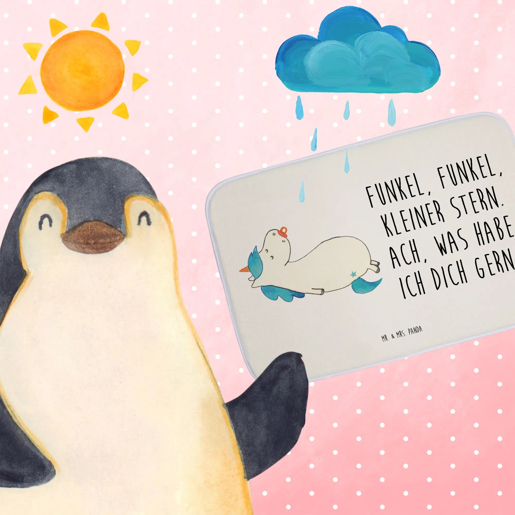 Entdecke den perfekten Badvorleger "Einhorn Schnullie" von Mr. & Mrs. Panda! Mit einem liebevoll handgezeichneten Motiv eines süßen Einhorns, das zufrieden mit einem Schnuller schläft, bringt dieser Badteppich zauberhafte Stimmung in jedes Badezimmer.