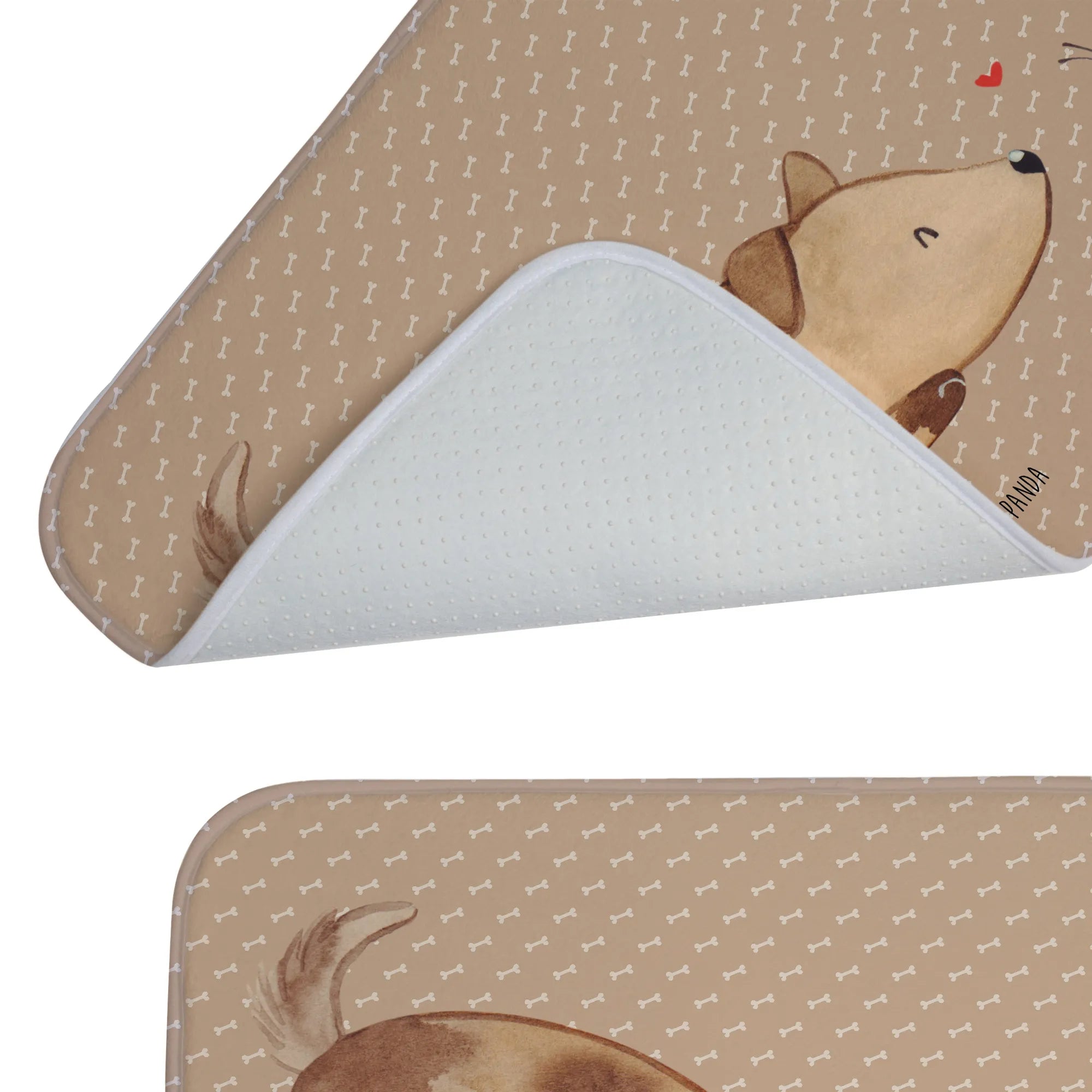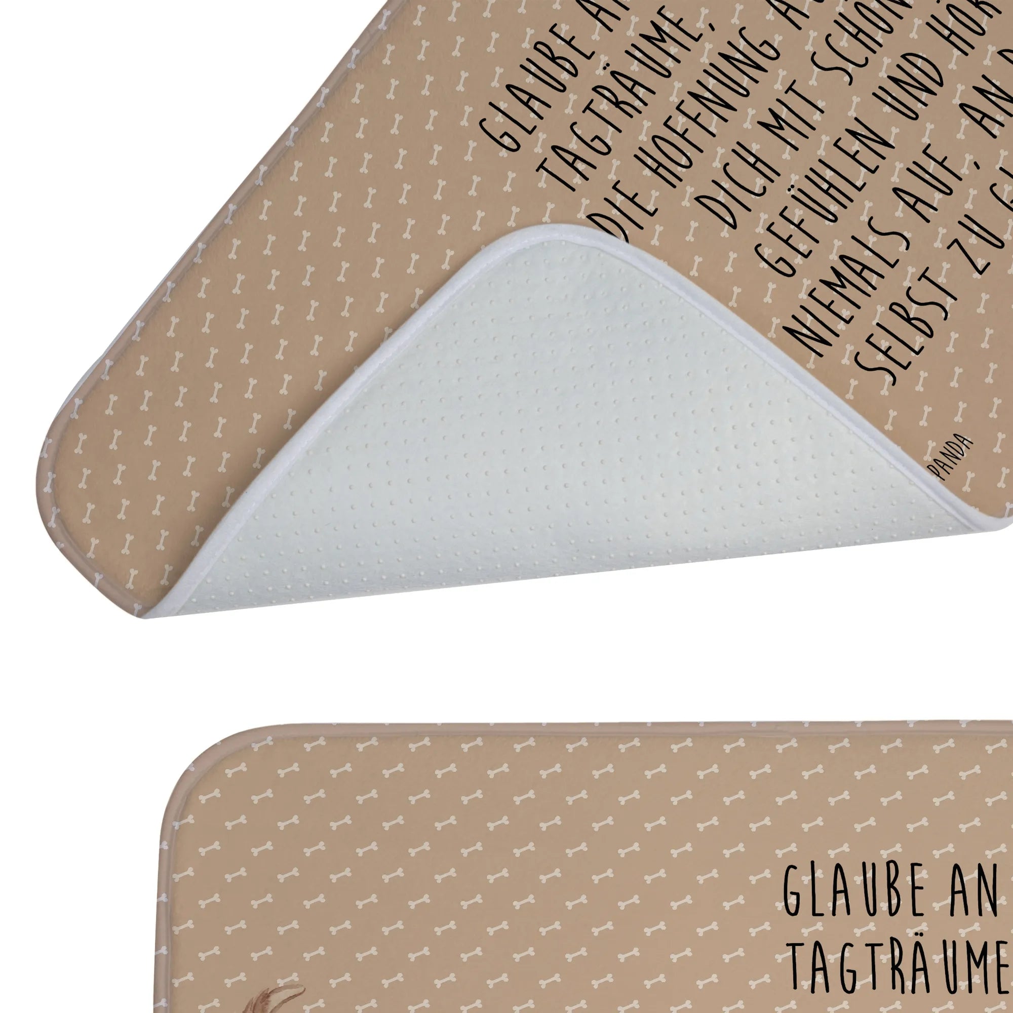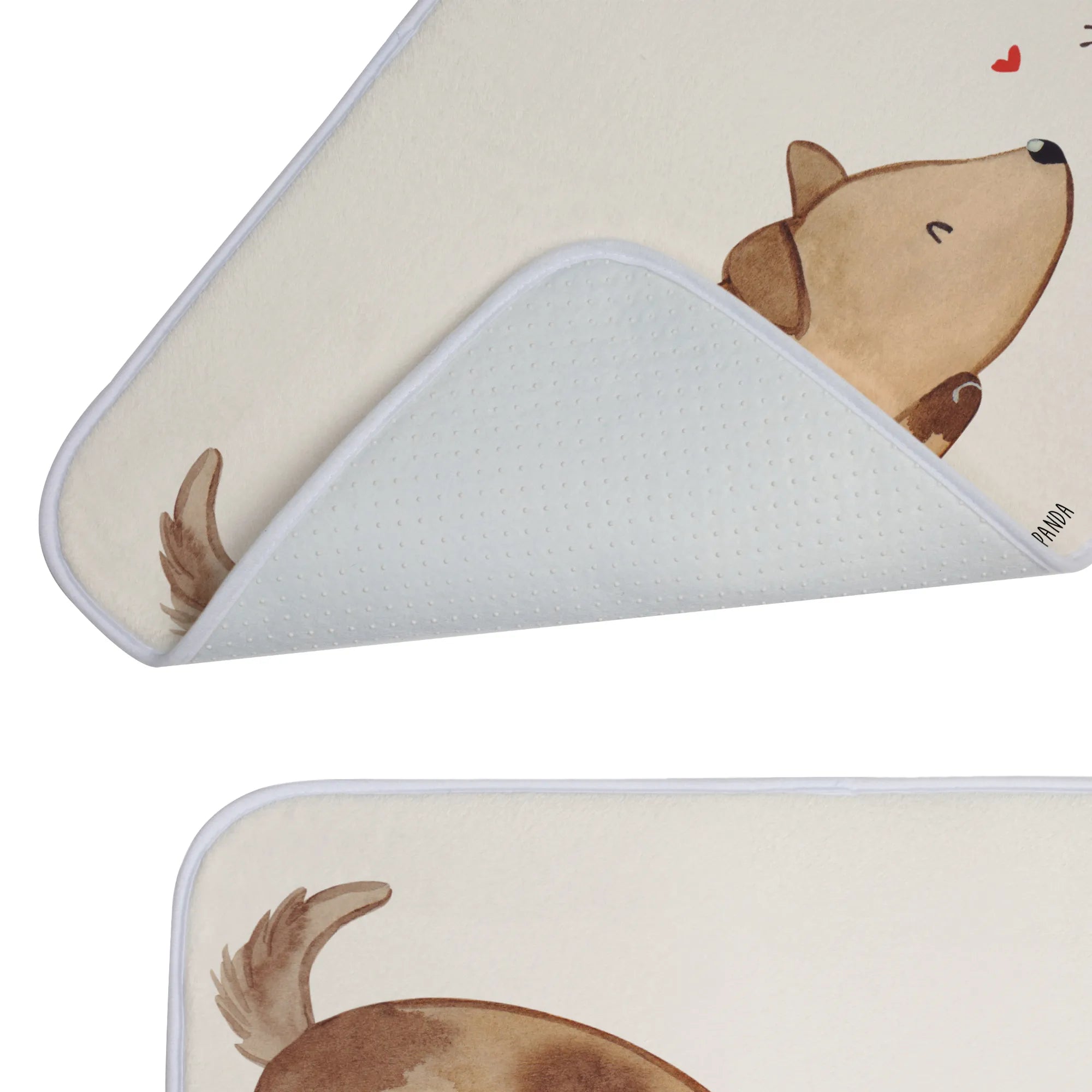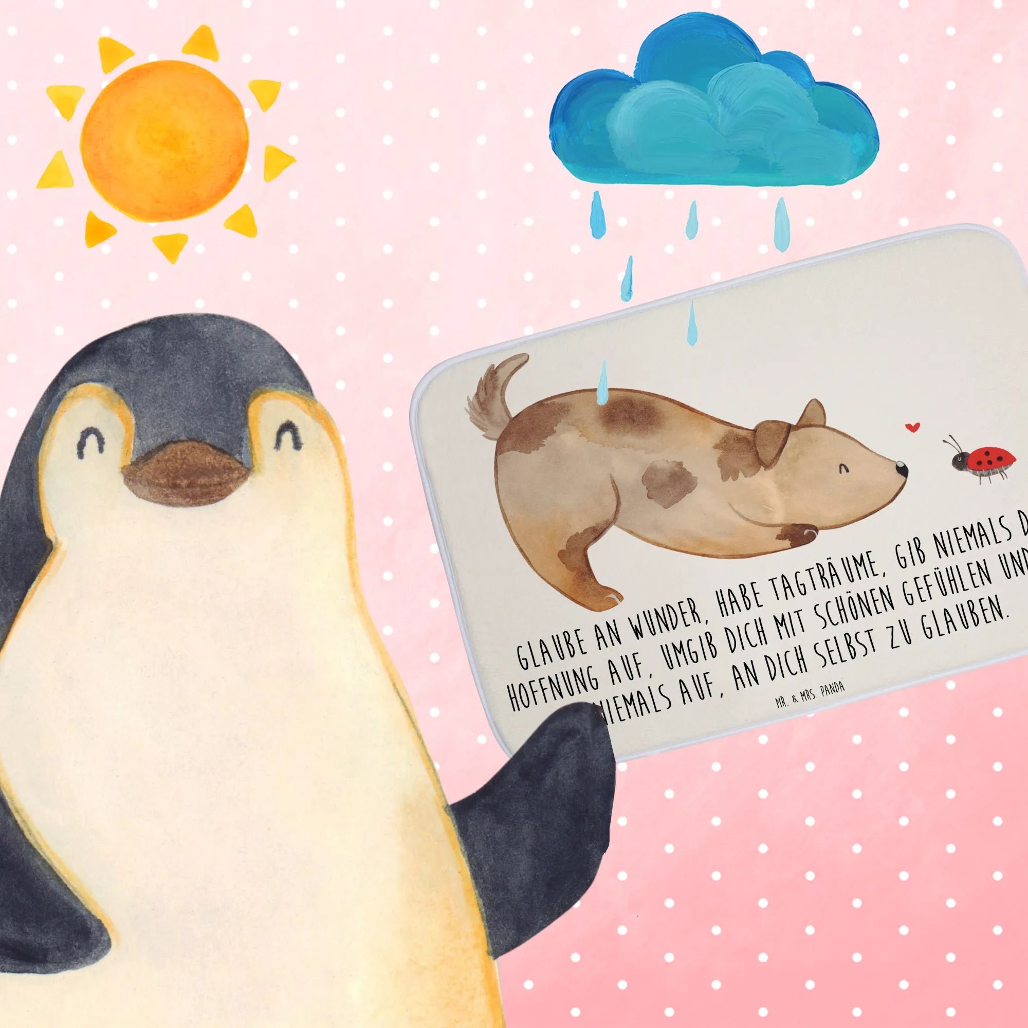 Entdecke den niedlichen Badvorleger mit dem Motiv eines Hundes und einem Marienkäfer – das perfekte Accessoire für jedes Badezimmer! Unsere Badematte von Mr. & Mrs. Panda sorgt nicht nur für eine tolle Optik, sondern macht dein Badezimmer auch ausrutschsicher. Die besondere flauschige Vorderseite und die äußerst saugfähige Premium Kunstfaser sind genau das, was dein Zuhause braucht. Mit Abmessungen von 590 mm x 400 mm passt dieser tolle Badteppich perfekt vor die Dusche oder die Badewanne.