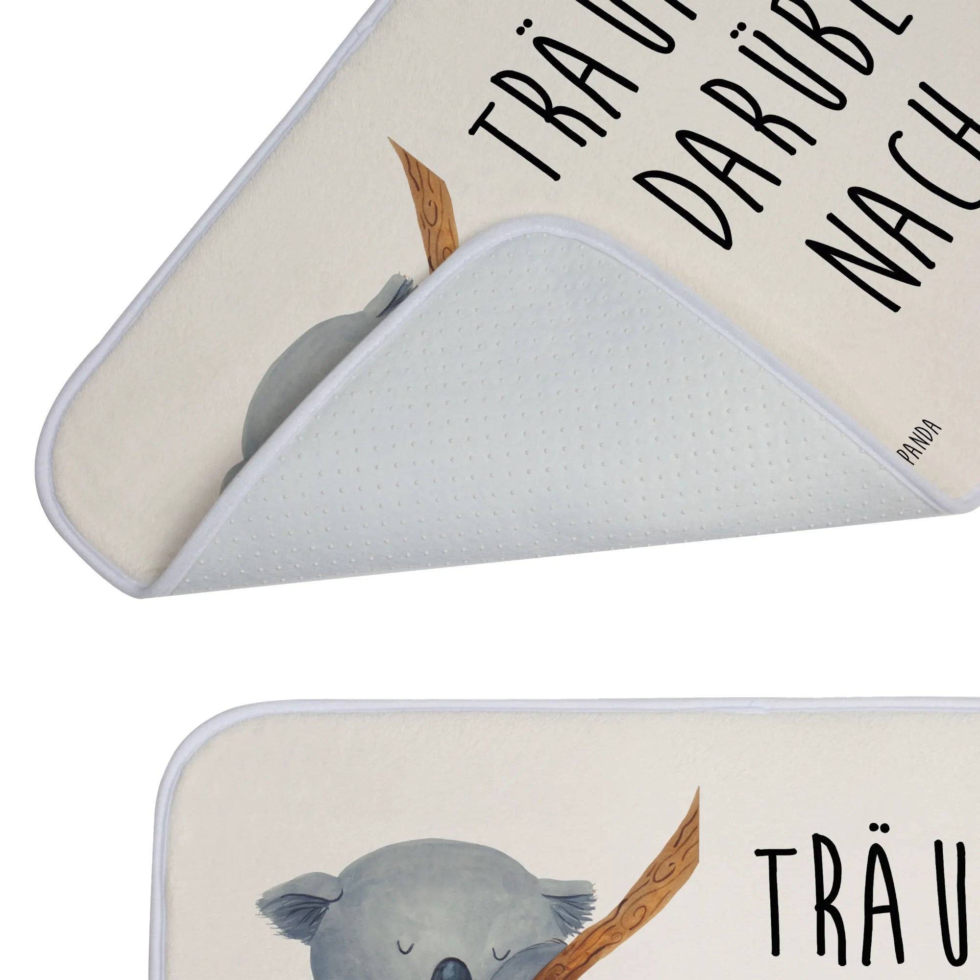 Der Badvorleger "Koalabär" von Mr. & Mrs. Panda ist nicht nur ein praktisches sondern auch ein absolut bezauberndes Accessoire für dein Badezimmer. Mit einer Größe von 590 mm x 400 mm wird er zum echten Eyecatcher und bringt gute Laune in jeden Raum. Die flauschige Premium Kunstfaser sorgt für ein besonders angenehmes Gefühl unter den Füßen und macht das Badezimmer zu einem Ort der Entspannung. Der niedliche Koalabär auf der Mattenoberfläche vermittelt ein Gefühl der Geborgenheit und lädt zum Träumen ein. Die Aufschrift "Träum mal darüber nach." ist ein schöner Zusatz und verwandelt die Badematte in einen kleinen Reminder, sich auch mal eine Auszeit zu gönnen.