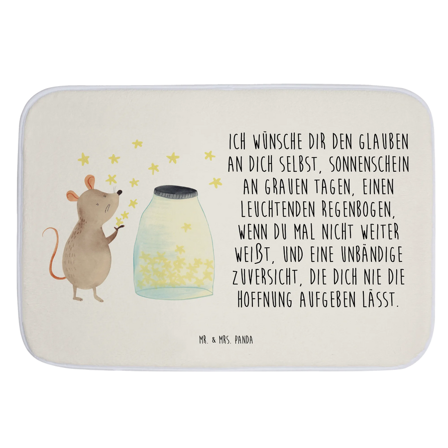 Der Badvorleger Maus Sterne von Mr. & Mrs. Panda bringt nicht nur Farbe, sondern auch Freude in dein Badezimmer! Mit seinem zauberhaften Design einer kleinen Maus, die von einem Glas voller leuchtender Sterne träumt, verwandelt dieser Badteppich jeden Raum in eine Oase der Gemütlichkeit.