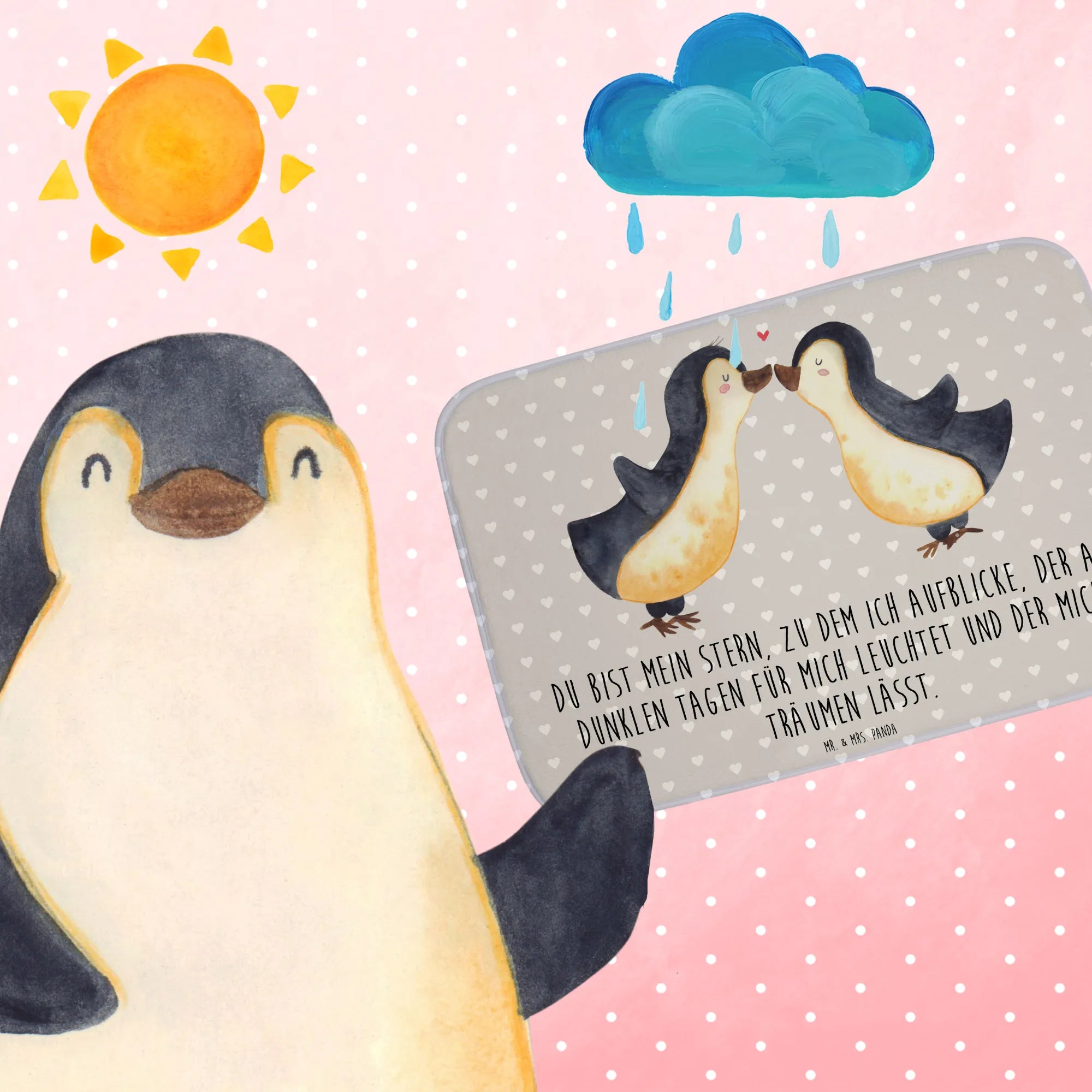 Geschenke voller Liebe sind immer etwas Besonderes, und dieser Badteppich von Mr. & Mrs. Panda ist da keine Ausnahme. Die Kollektion 'Liebe' umfasst zahlreiche Produkte, die ebenso liebevoll gestaltet sind, und die Pinguine stehen stellvertretend für das unendliche Glück und die Verbundenheit in einer Beziehung.