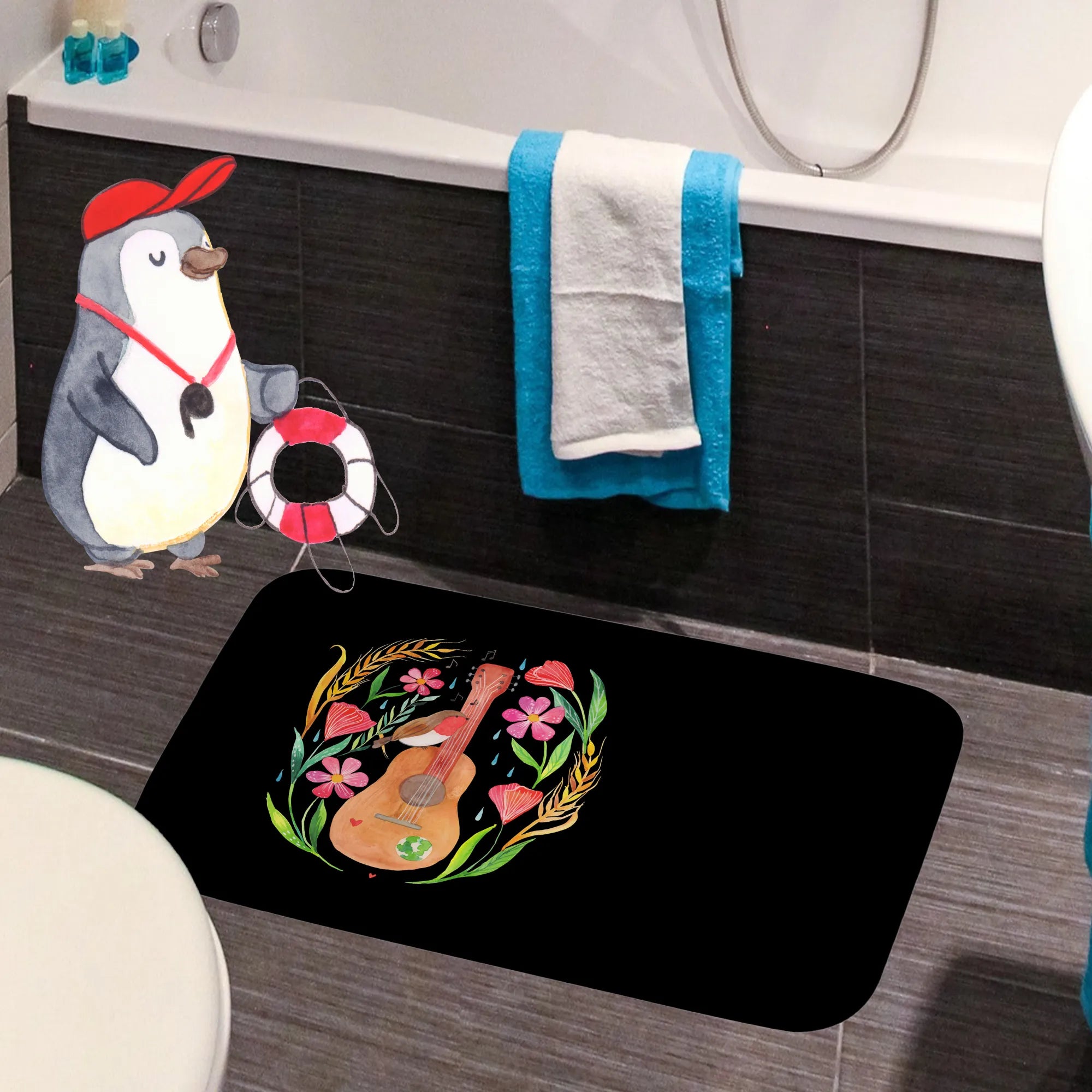 Dieses wunderschöne Design mit dem Rotkehlchen und der Gitarre bringt ein Stück Natur und Musik in dein Zuhause. Die Botschaft, dass "Musik wie eine gute Beziehung ist. Sie lässt dein Herz Sprünge machen, findet in jeder Situation die richtigen Worte und lässt dich vergnügt durchs Leben tanzen." wird dich immer begleiten und ein Lächeln auf dein Gesicht zaubern. Jeder Schritt auf diesem flauschigen Badvorleger ist ein Genuss, während die Anti-Rutsch Gummibeschichtung dafür sorgt, dass du sicher stehst, egal wie nass der Boden ist.