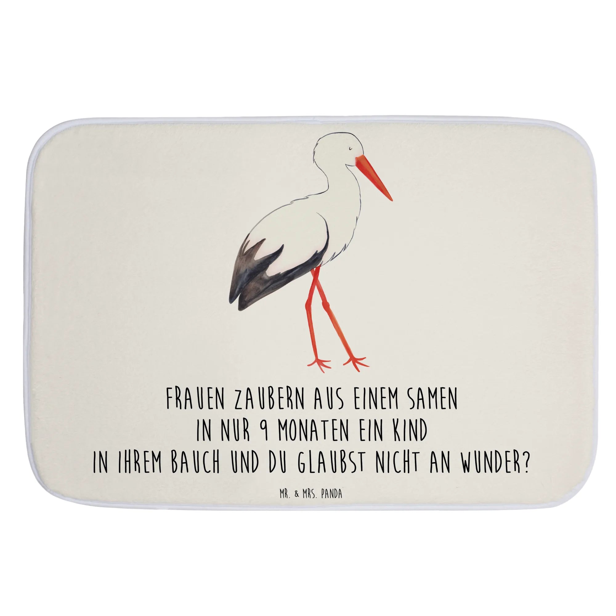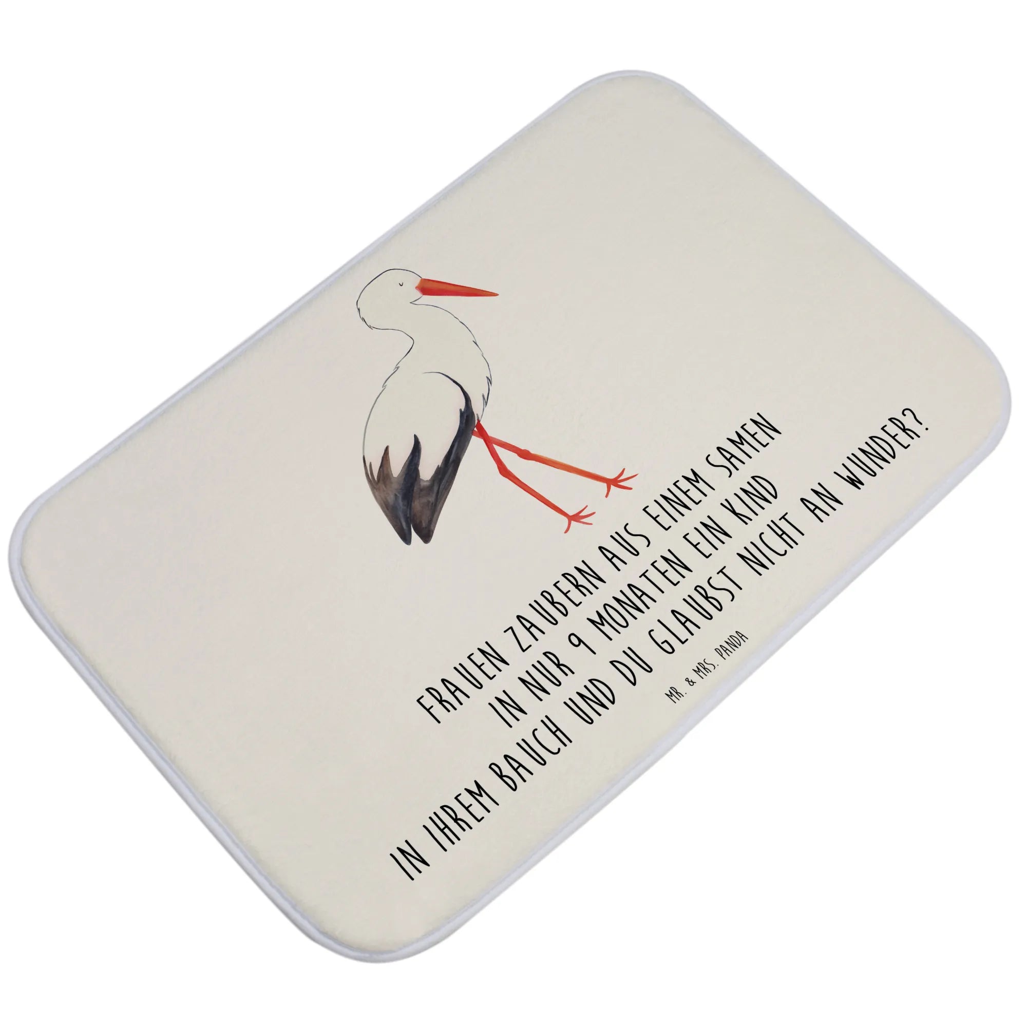 Mit seinem süßen Motiv, das einen Storch zeigt, der ein Baby in einem Tuch trägt, bringt er Freude und Farbe in jeden Raum. Dank des liebevoll handgezeichneten Designs von Mrs. Panda strahlt der Badvorleger pure Lebensfreude aus.