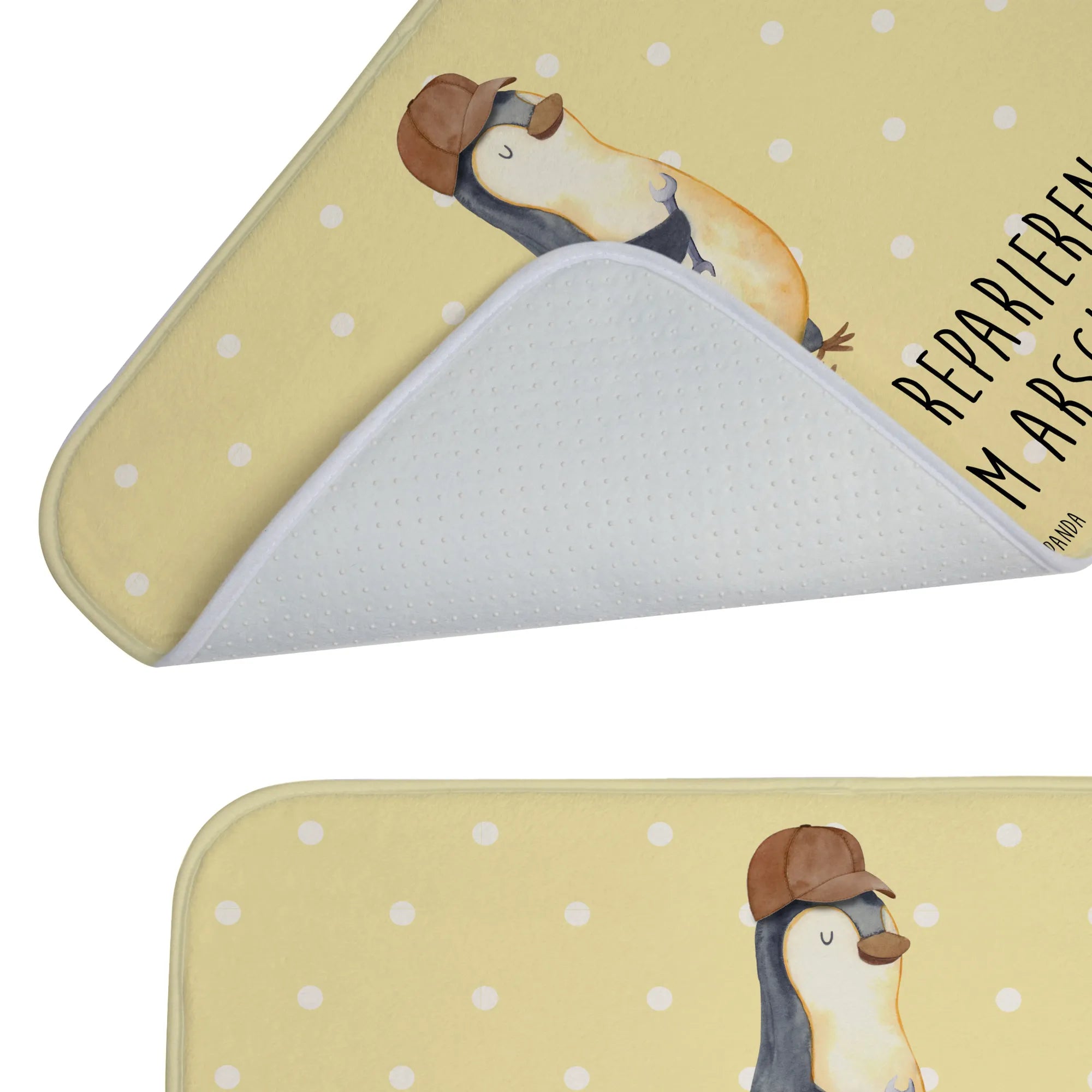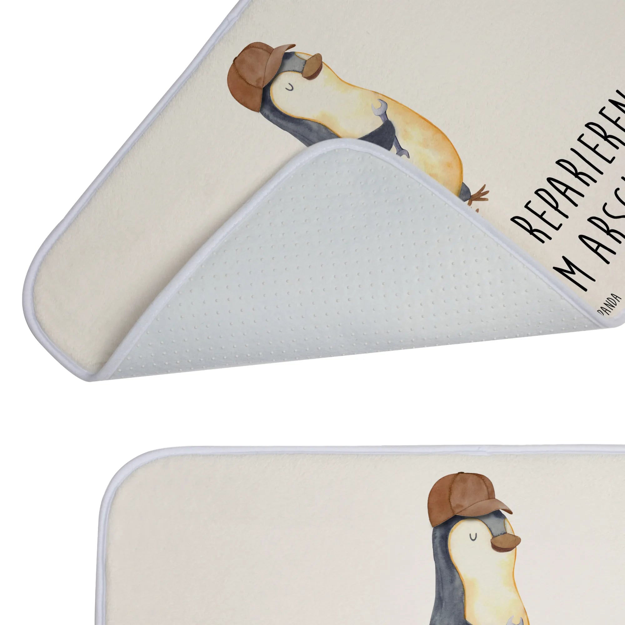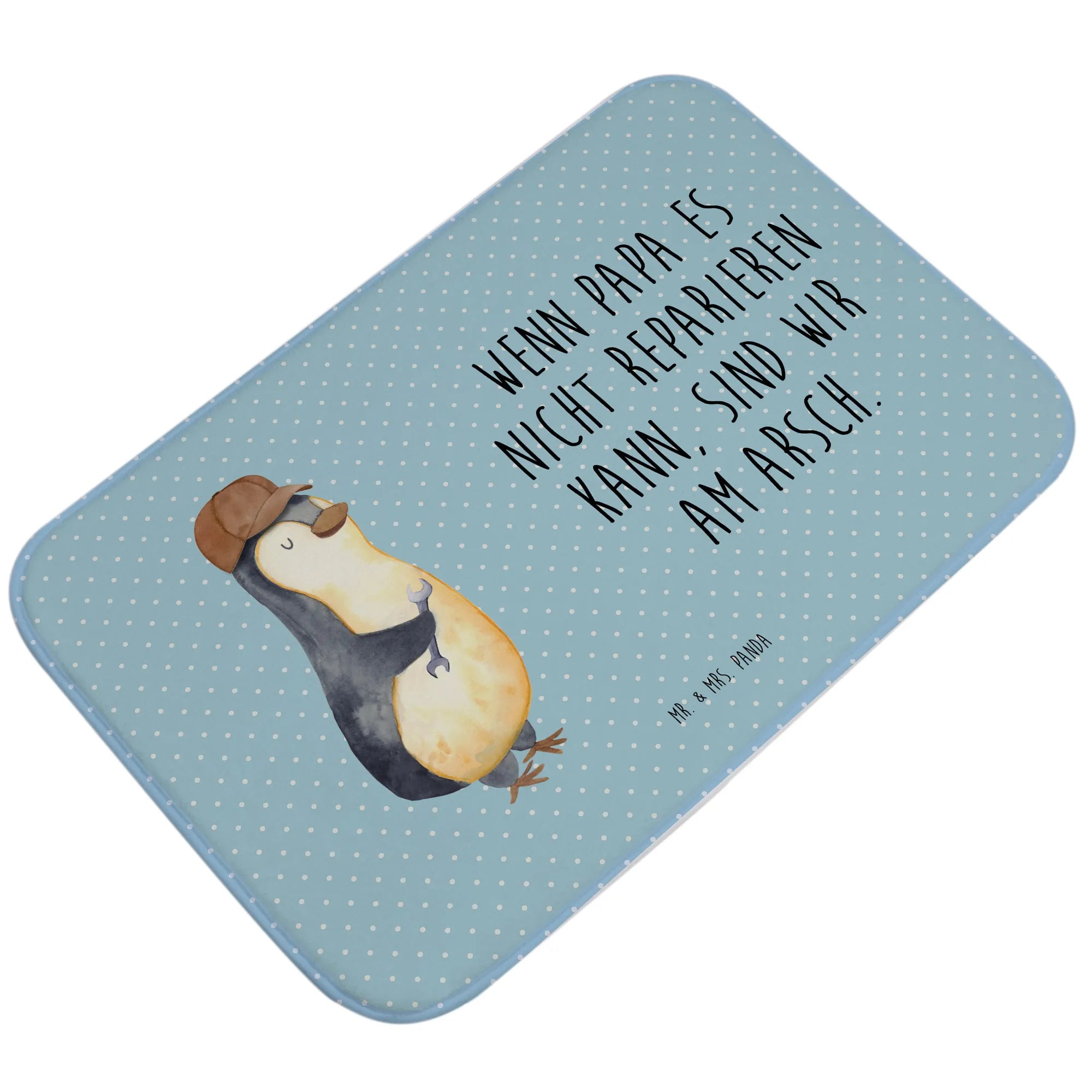 Der Badvorleger ist bedruckt mit einem sympathischen Pinguin, der mit einem Schraubenschlüssel in der Hand für handwerkliches Geschick steht. Der dazugehörige Spruch zeigt auf humorvolle Weise, dass Papa als Problemlöser immer gefragt ist. Das macht den Badvorleger nicht nur zu einem witzigen Blickfang, sondern auch zu einem tollen Gesprächsthema!