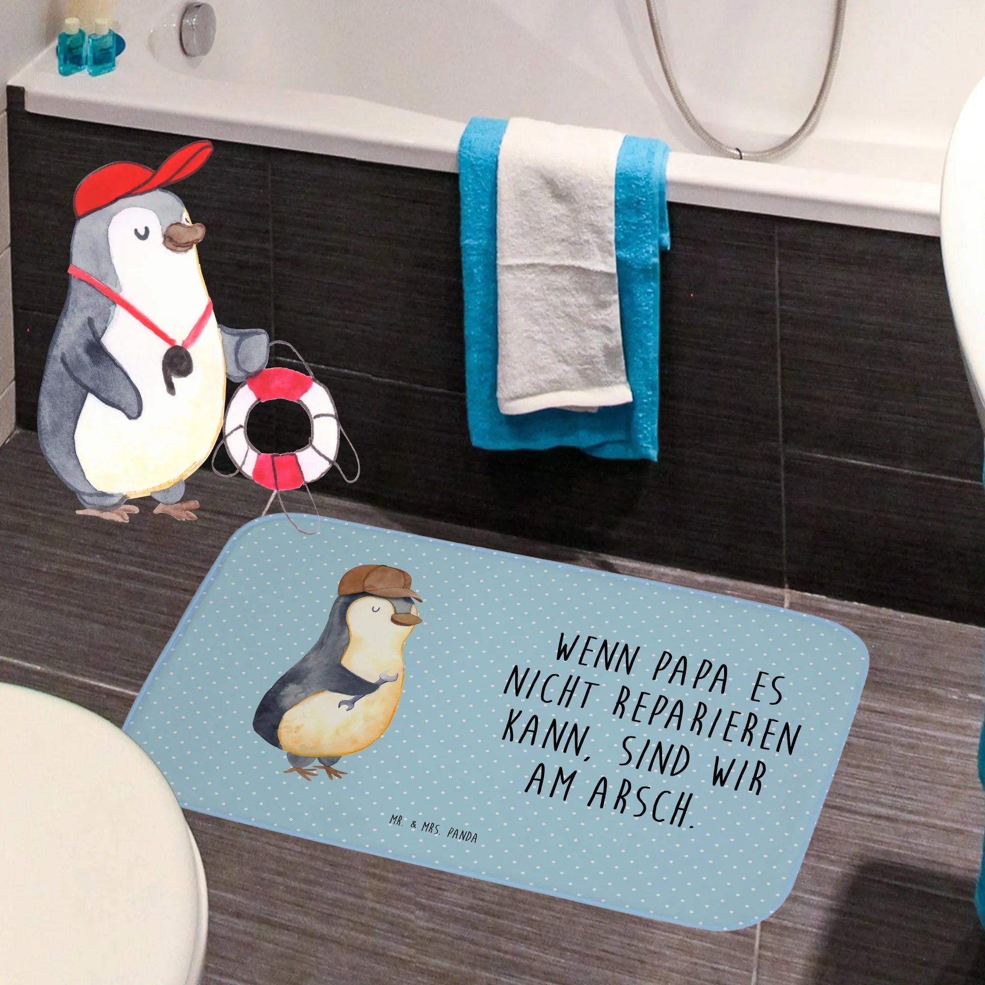 Der humorvolle Pinguin auf dem Teppich, der mit einem stilisierten Schraubenschlüssel in der Flosse posiert, ist nicht nur ein Augenzwinkern an alle Papas, die gerne reparieren, sondern macht das Badezimmer auch ganz individuell und einladend.