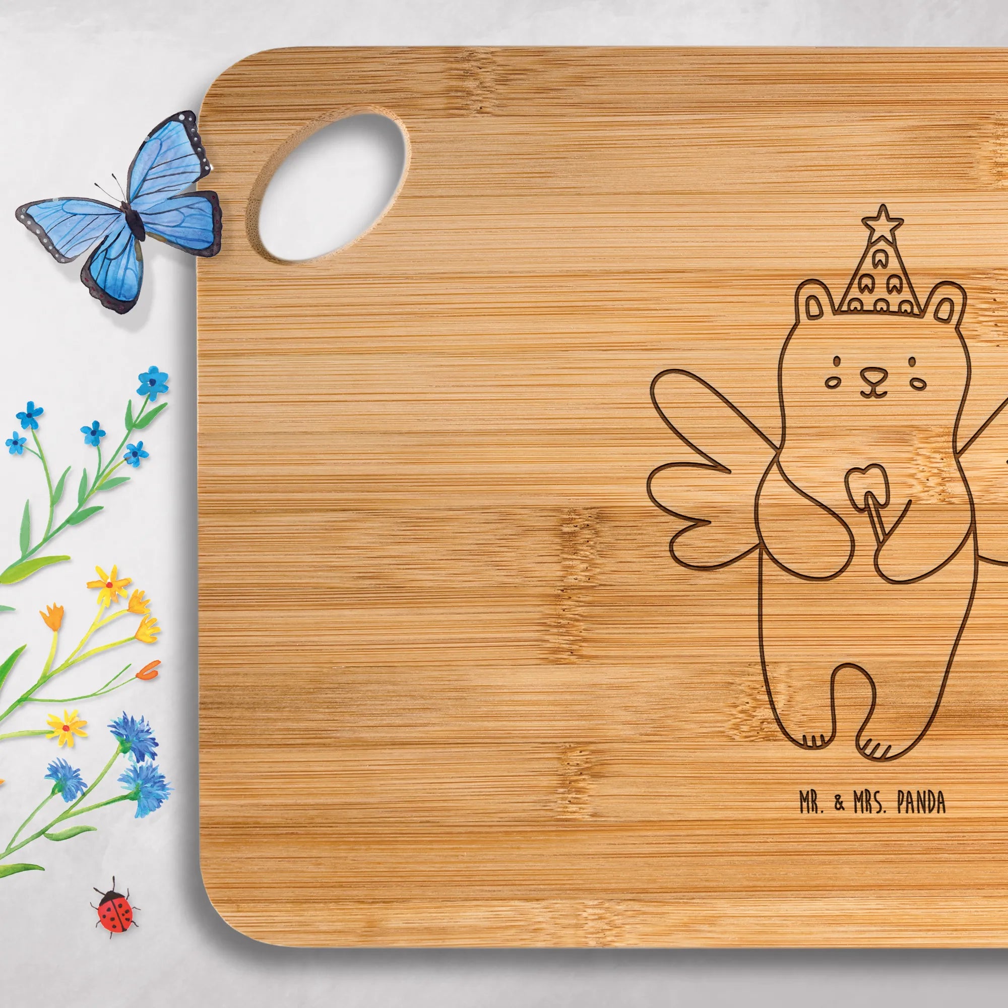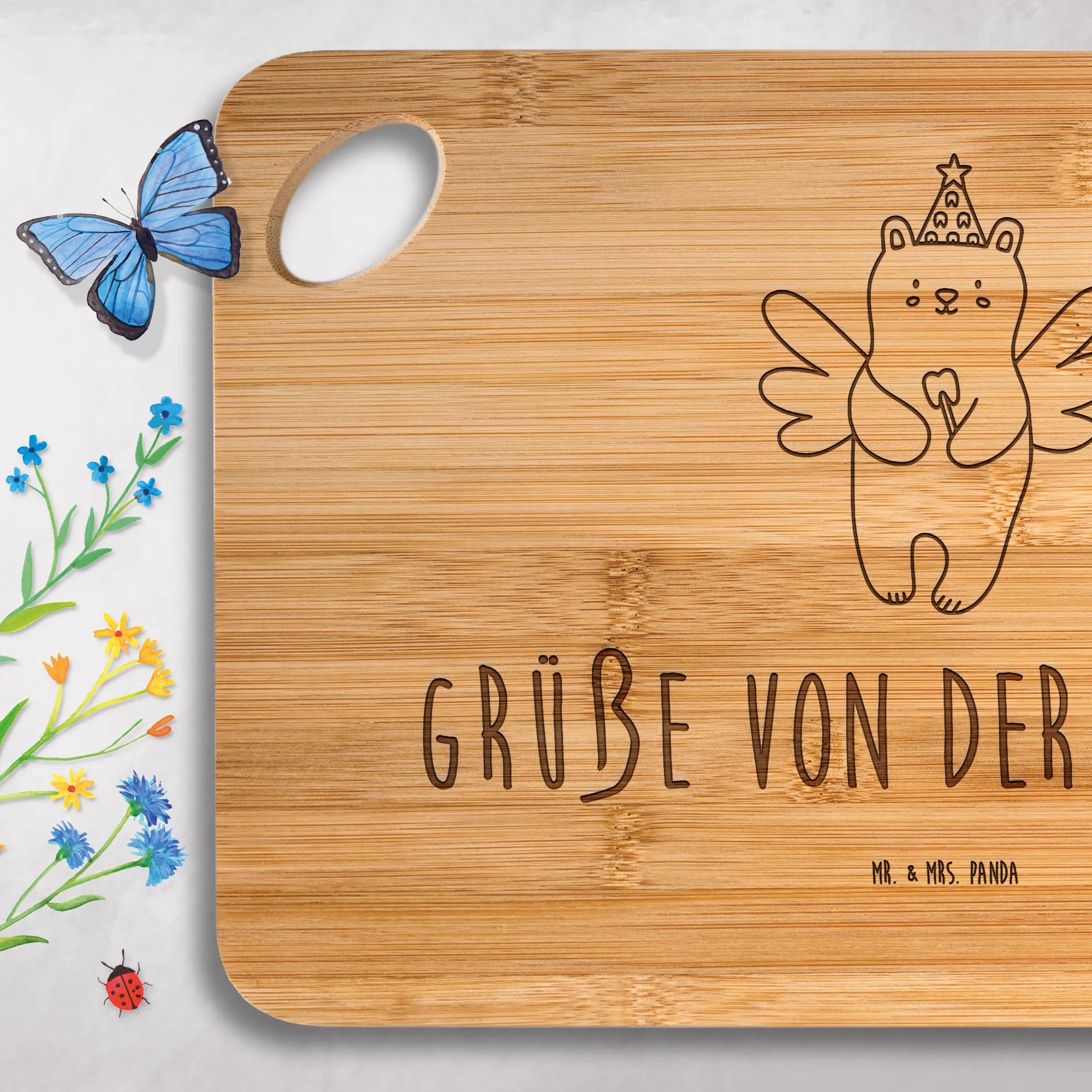 Dieses liebevoll gestaltete Bambus-Schneidebrett «Zahnfee Bär» aus der Bär-Kollektion von Mr. & Mrs. Panda bringt Magie an deinen Frühstückstisch. Die süße Zahnfee-Bärin mit Feenhütchen, Flügeln und Zauberstab wurde von Mrs. Panda liebevoll gezeichnet und als langlebige Lasergravur auf das Brett gebracht. Der Schriftzug „Grüße von der Zahnfee“ macht das Holzbrett zum perfekten Geschenk zum ersten Milchzahn oder zur Babyparty.
