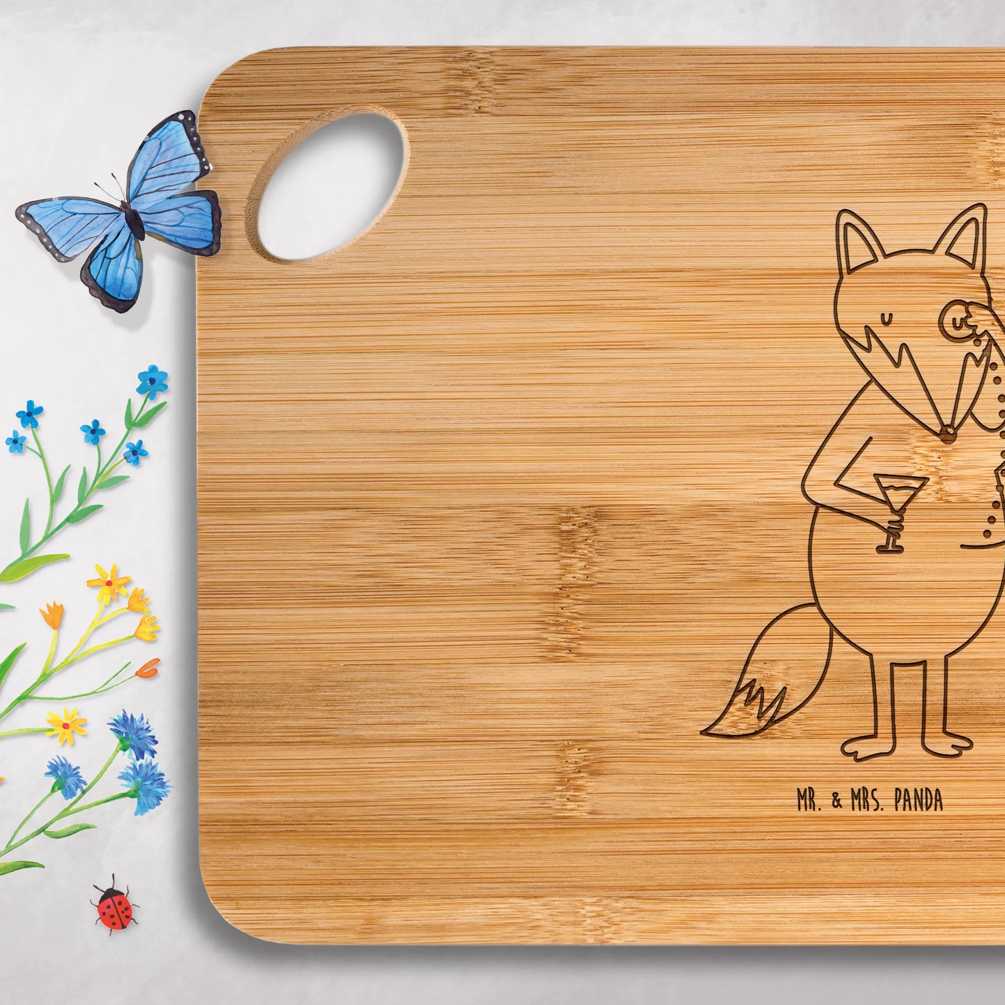 Besondere Merkmale: Nicht personalisierbar, langlebige Lasergravur, aus der Fuchs Kollektion von Mr. & Mrs. Panda. Ein Holzschneidebrett, das Design und Funktion verbindet und in keiner Küche fehlen sollte.