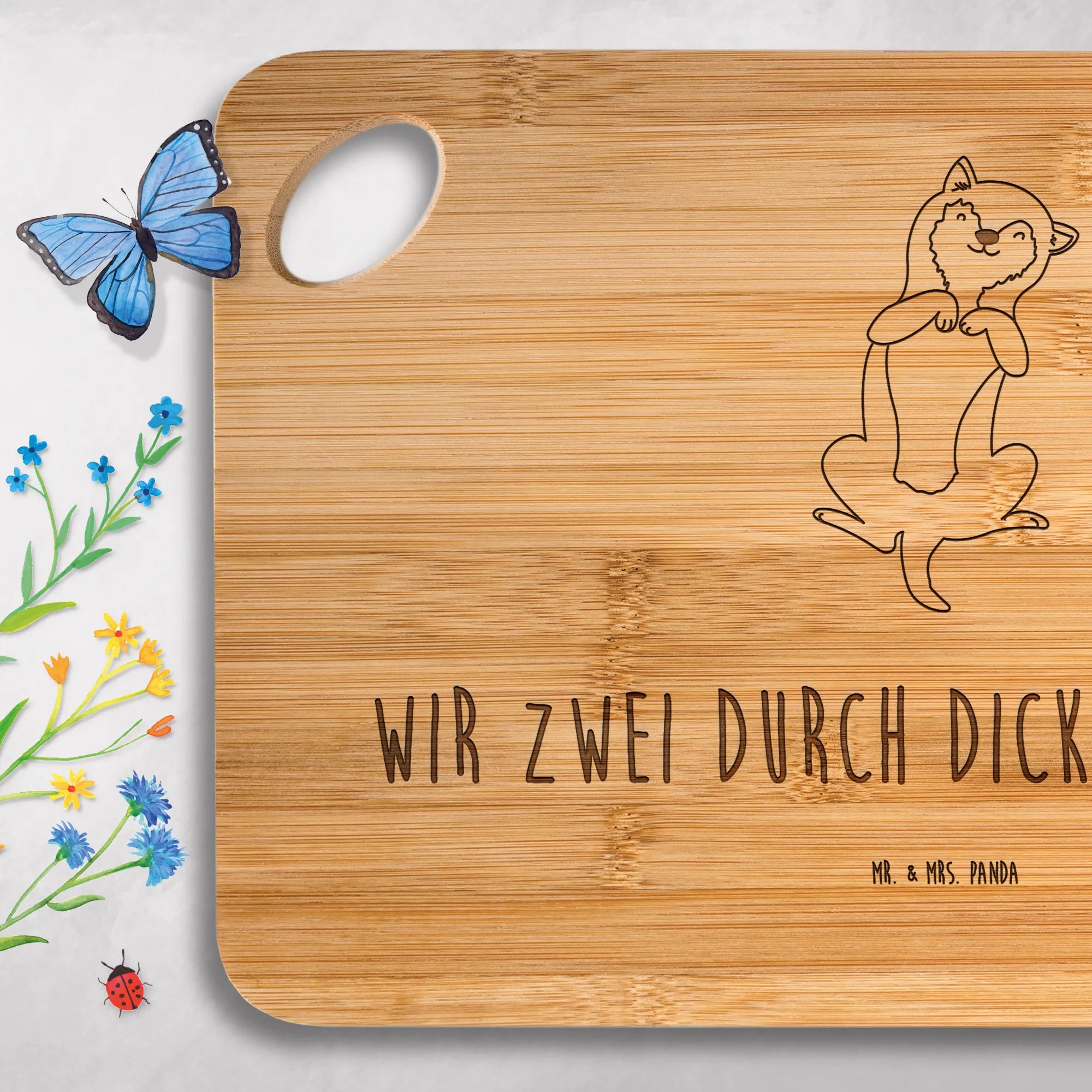 Mr. & Mrs. Panda Schneidebrett „Hund Bauchkraulen“ – ein liebevoll gestaltetes Frühstücksbrett aus der Hunde Kollektion, das Hundeliebhaber sofort ins Herz trifft. Das fröhliche Motiv zeigt einen Hund, der sich auf den Rücken legt und nach Bauchkrauler verlangt. Der eingravierte Spruch „Wir zwei durch dick und dünn...“ macht das Holzbrett zu einem persönlichen Geschenk für Hundebesitzer und Tierfreunde.