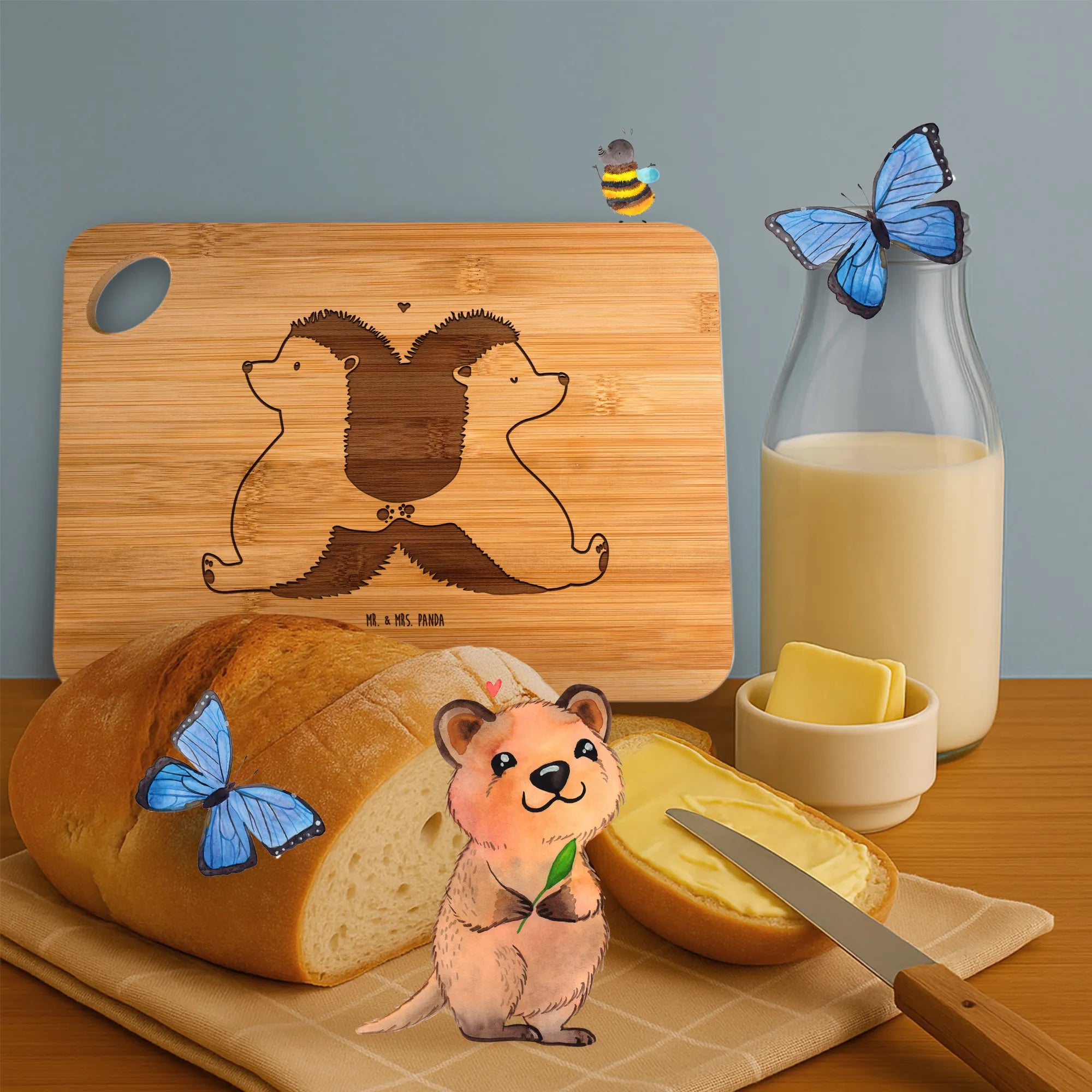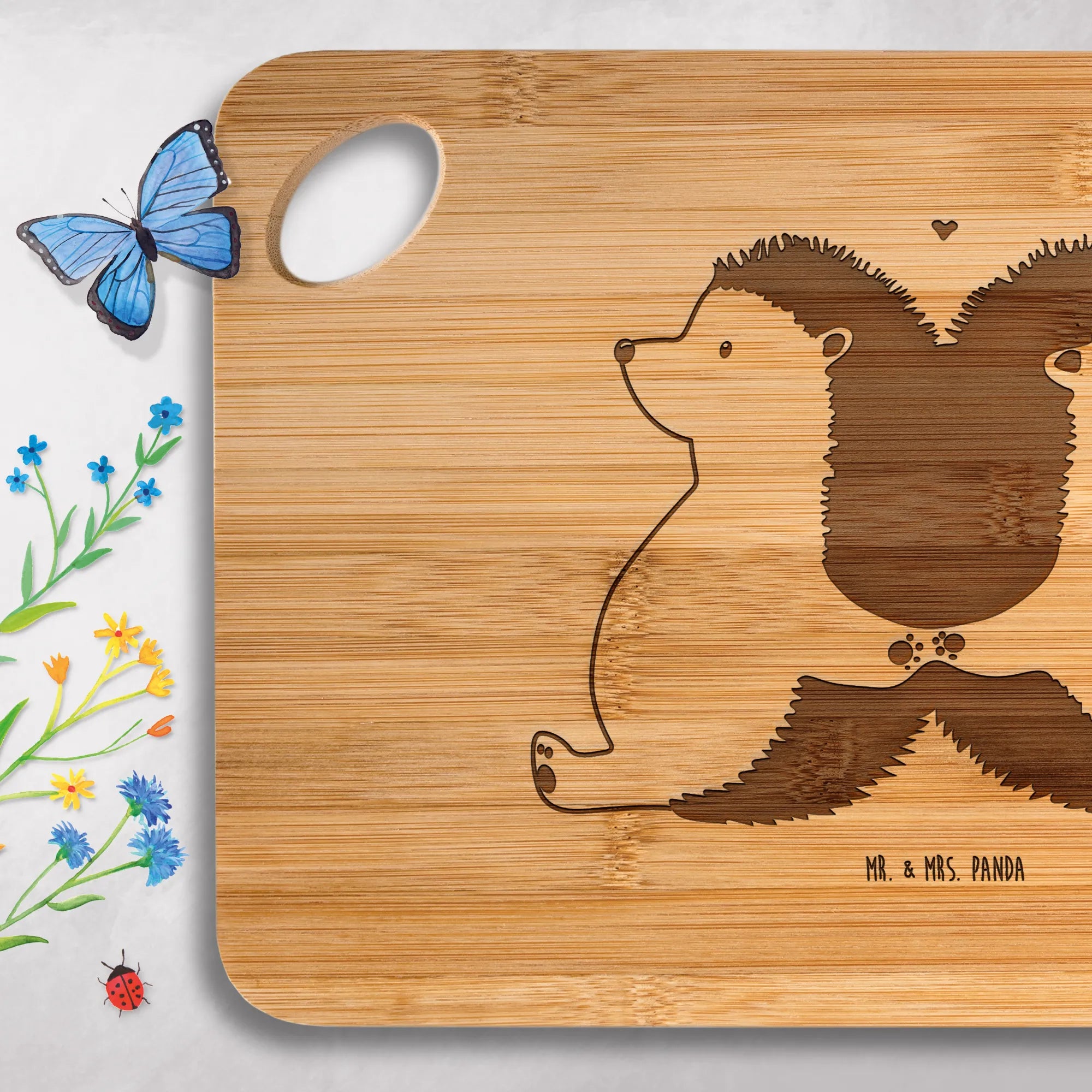 Das Bambus-Schneidebrett mit dem süßen Motiv der händchenhaltenden Igel aus der Liebe Kollektion von Mr. & Mrs. Panda ist das perfekte Geschenk für Verliebte und alle, die die kleinen Momente der Zweisamkeit schätzen. Mit seinen Maßen von 225 mm x 145 mm ist es ideal als Frühstücksbrett oder für die Vorbereitung deiner leckersten Speisen.