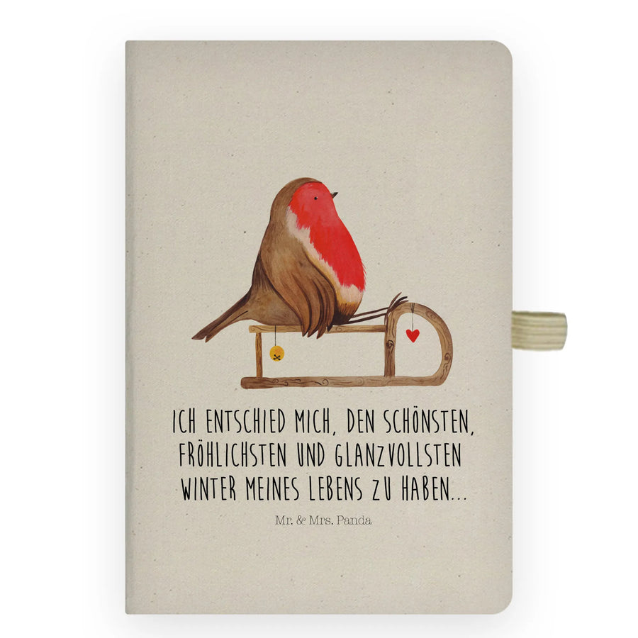 Entdecke das bezaubernde DIN A5 Baumwoll Notizbuch mit dem niedlichen Motiv Rotkehlchen auf dem Schlitten aus der Winter Kollektion von Mr. & Mrs. Panda!