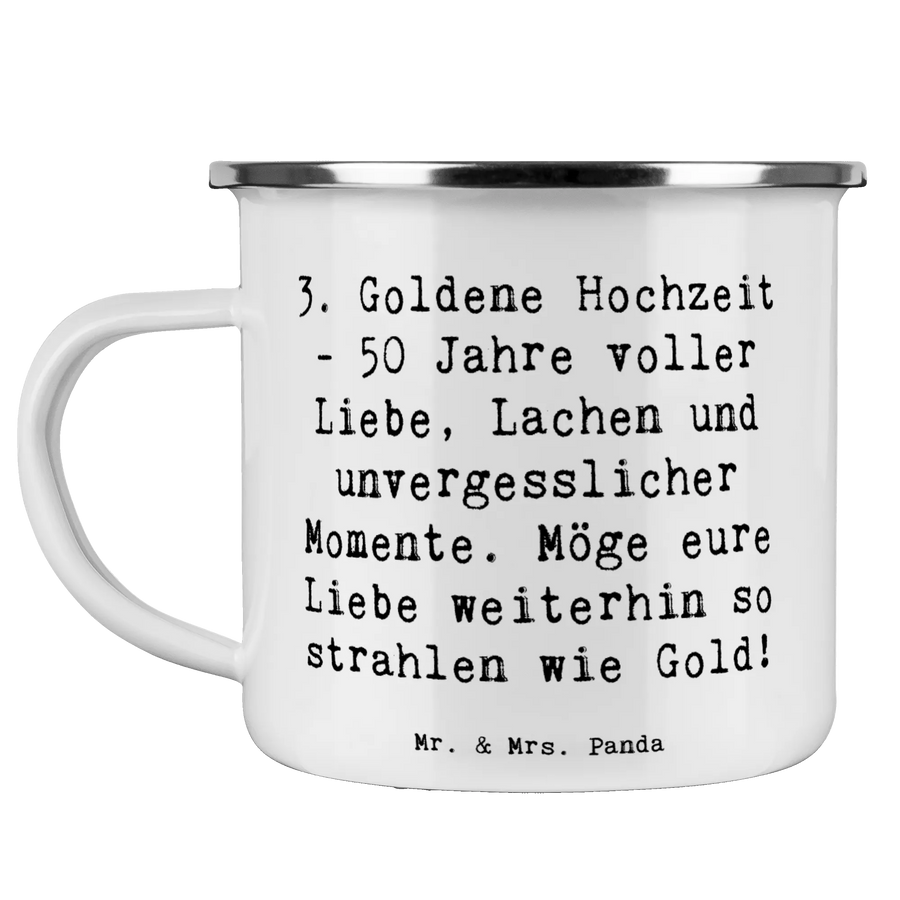 Unsere Camping Emaille Tasse „50. Hochzeitstag – Goldene Hochzeit“ von Mr. & Mrs. Panda verbindet Herz und Alltag: bedruckt mit dem liebevollen Spruch „3. Goldene Hochzeit - 50 Jahre voller Liebe, Lachen und unvergesslicher Momente. Möge eure Liebe weiterhin so strahlen wie Gold!" ist sie ein warmherziges Geschenk für Jubiläen, Familienfeste oder besondere Überraschungen.
