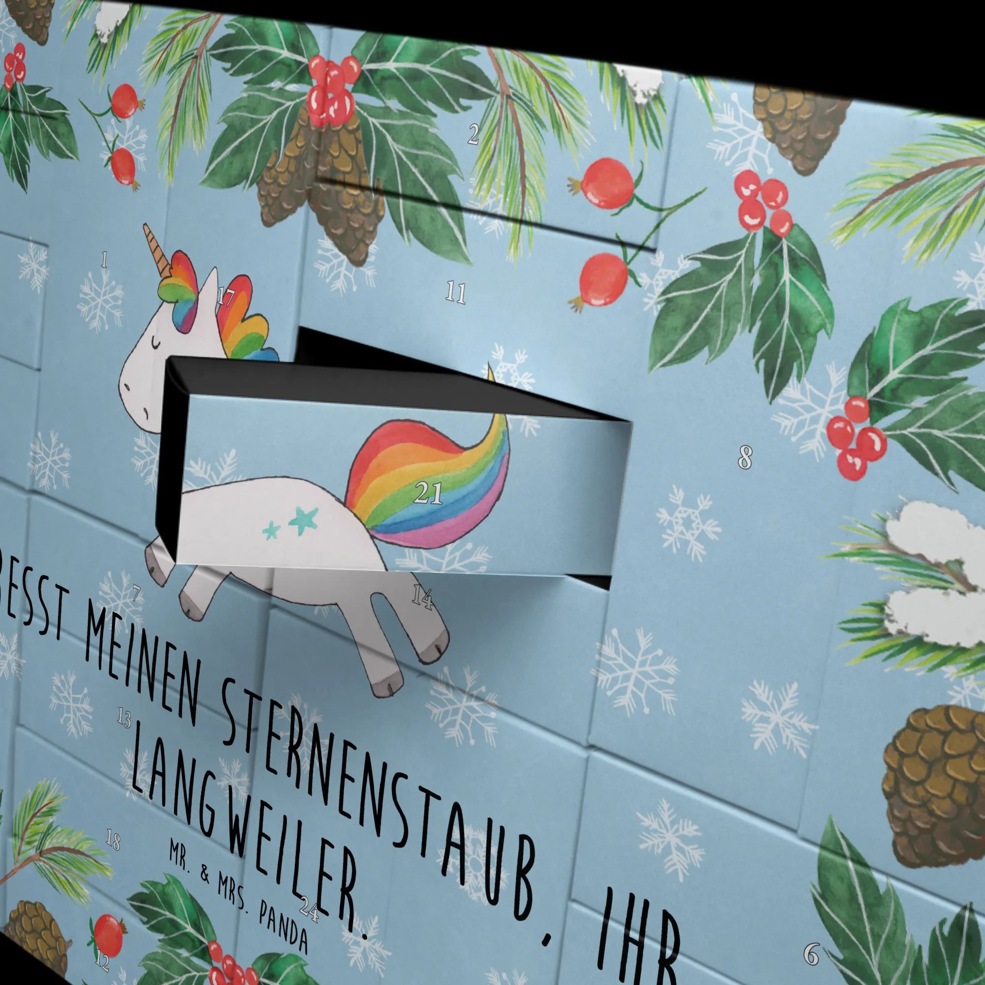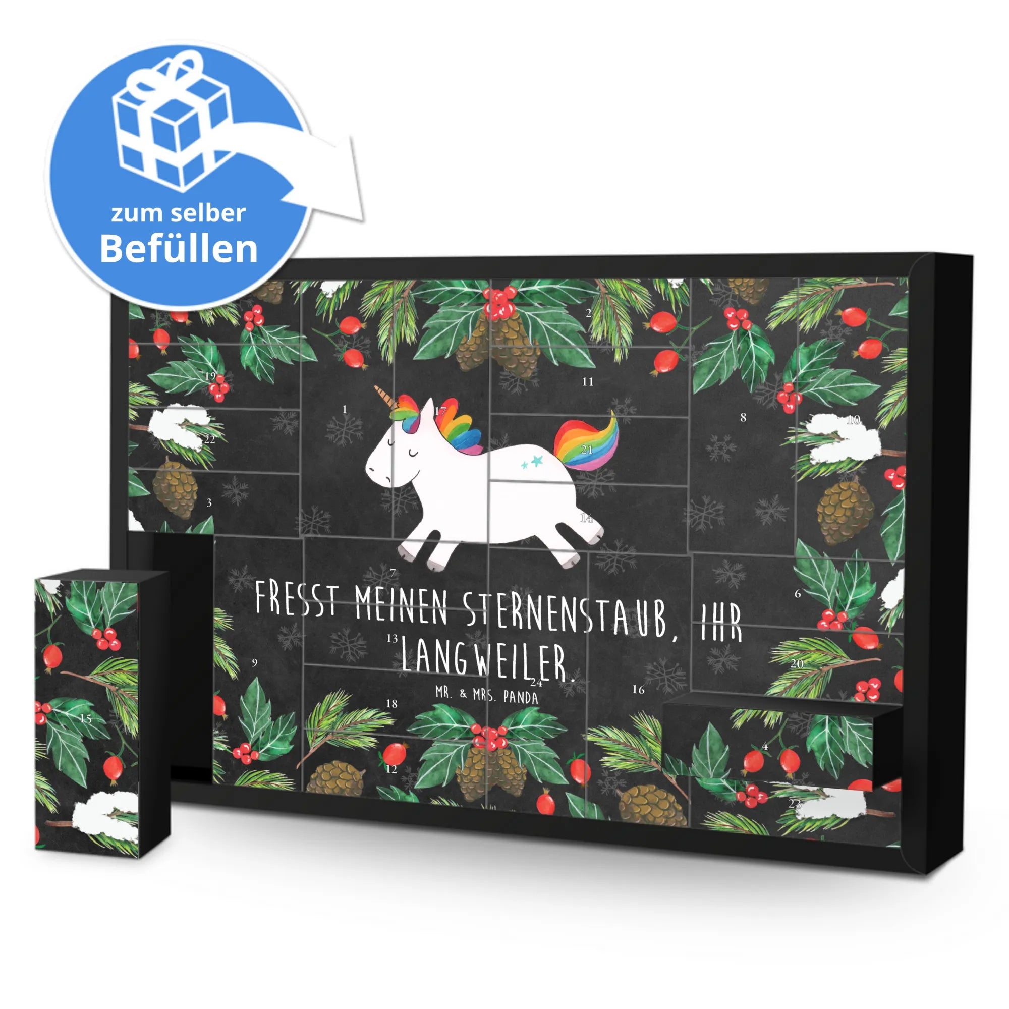 Jeden Morgen ein kleines Türchen öffnen und ein Lächeln schenken – das geht am besten mit unserem Adventskalender zum selbst befüllen aus der Einhorn - Kollektion von Mr. & Mrs. Panda. Das niedliche Einhorn mit Regenbogen-Mähne strahlt pure Lebensfreude aus und wird durch den frechen Spruch „Fresst meinen Sternenstaub, ihr Langweiler.“ zum echten Hingucker in der Vorweihnachtszeit.