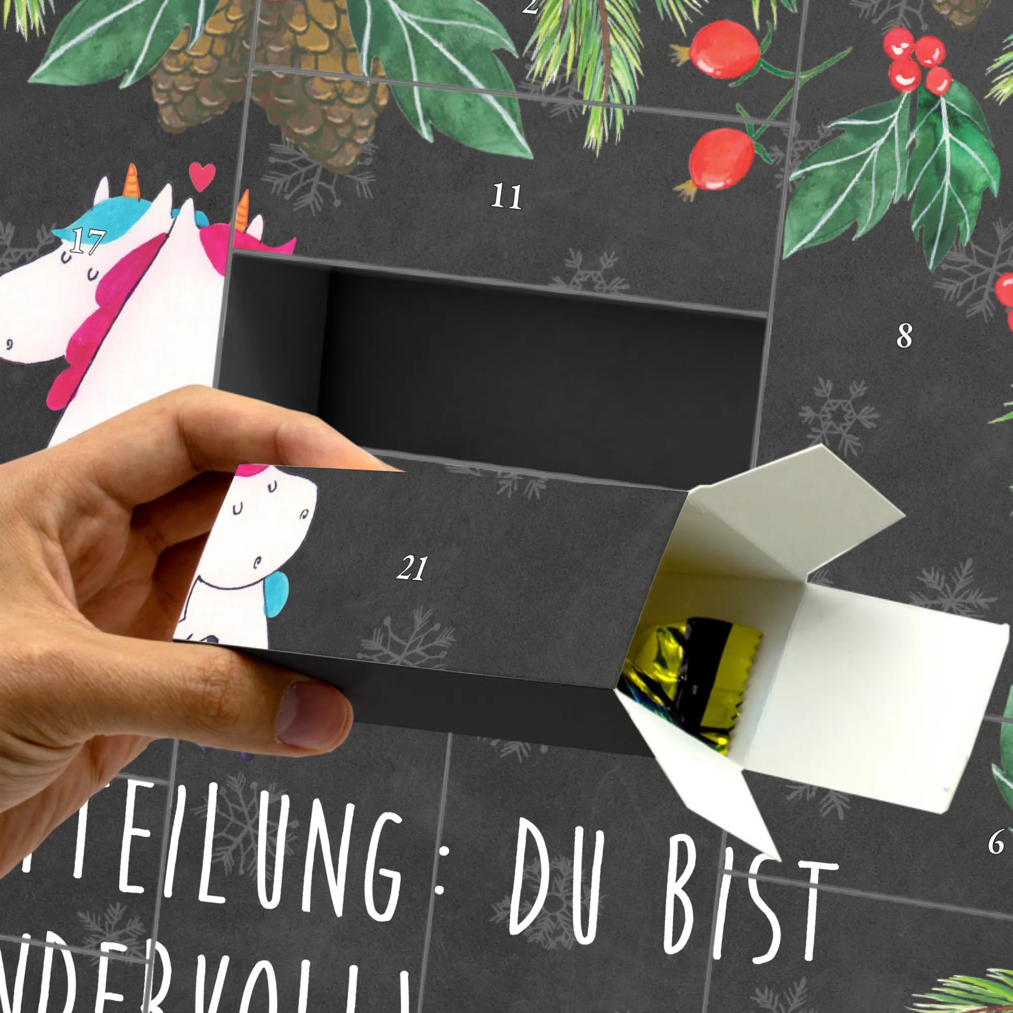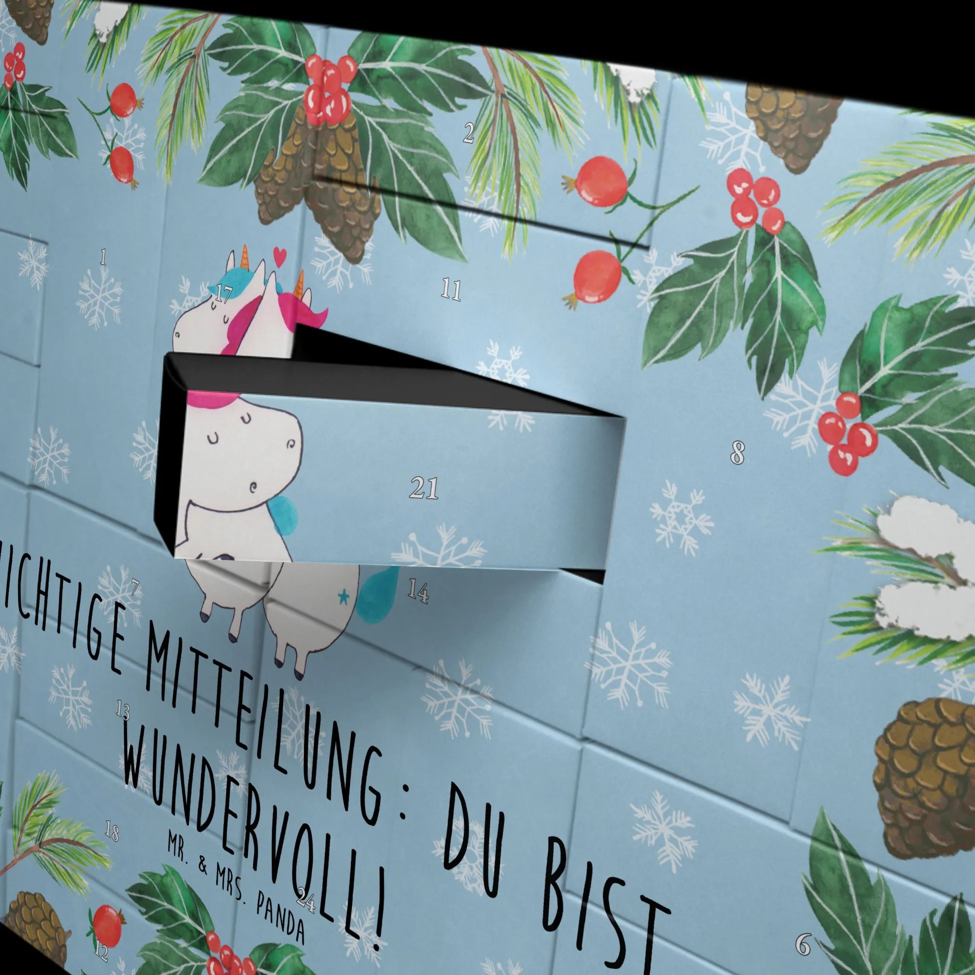 Der wunderschöne befüllbare Adventskalender von Mr. & Mrs. Panda mit dem zauberhaften Einhorn-Motiv ist das perfekte Geschenk für jeden Einhornliebhaber! Ob für Deinen Partner, Deine beste Freundin oder als liebevolle Überraschung für Dich selbst - dieser Adventskalender verbreitet Freude und Weihnachtsstimmung.
