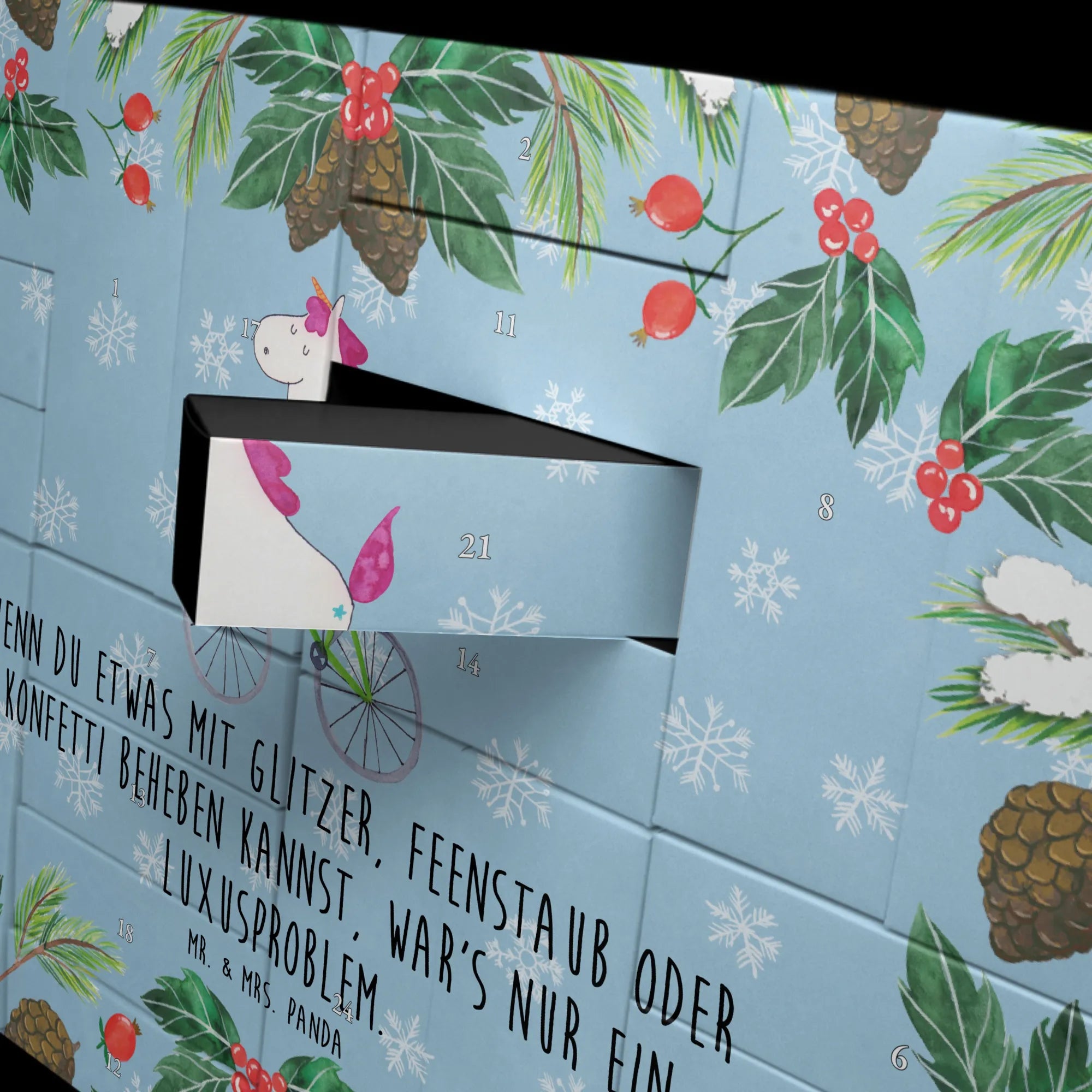 Wenn Du also auf der Suche nach einem liebevollen und persönlichen Geschenk bist, sei es für Weihnachten, einen Geburtstag oder einfach so, dann ist dieser befüllbare Adventskalender mit dem Einhorn-Motiv die perfekte Wahl. Überrasche Deine Liebsten und bring ein Lächeln in ihr Gesicht! Mit dem Einhorn Radfahrer aus der Einhorn-Kollektion von Mr. & Mrs. Panda bringst Du ein Stückchen Magie in die Vorweihnachtszeit. Lass die Vorfreude beginnen und erfülle die Adventszeit mit Unikaten voller Liebe und Freude.
