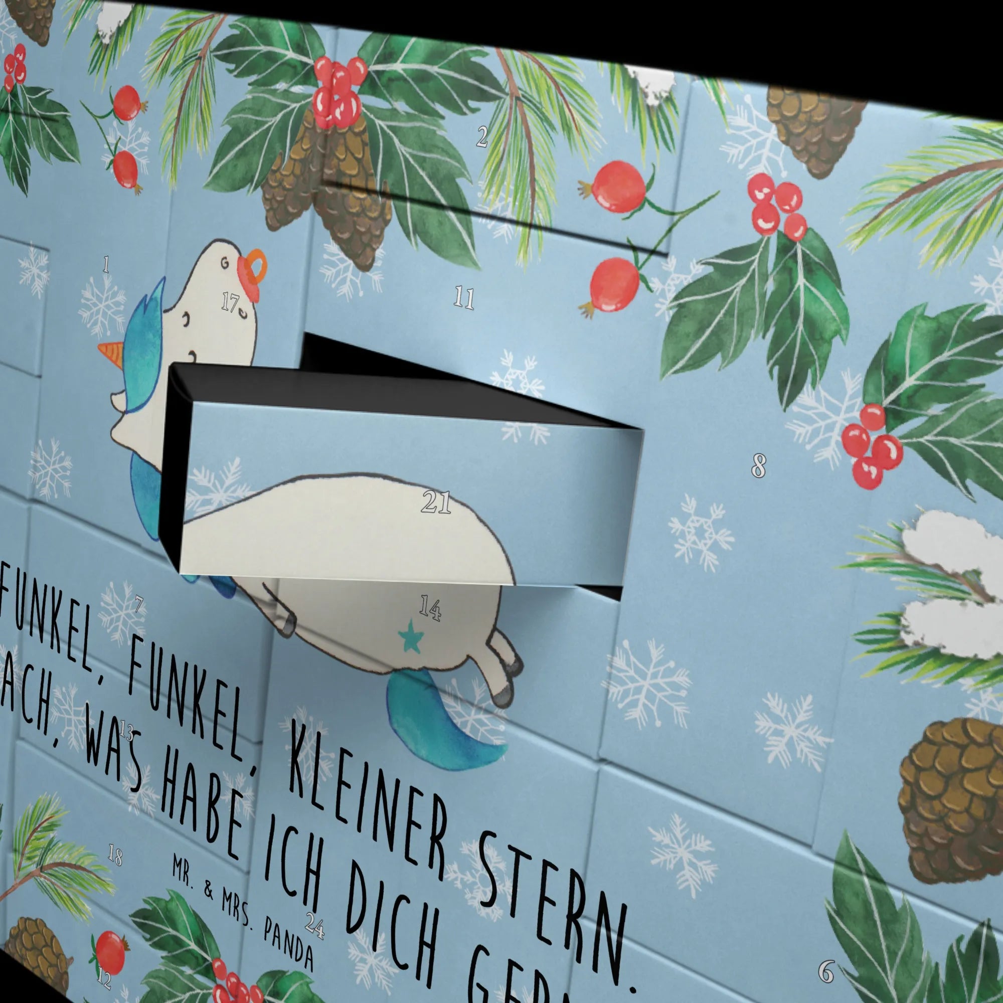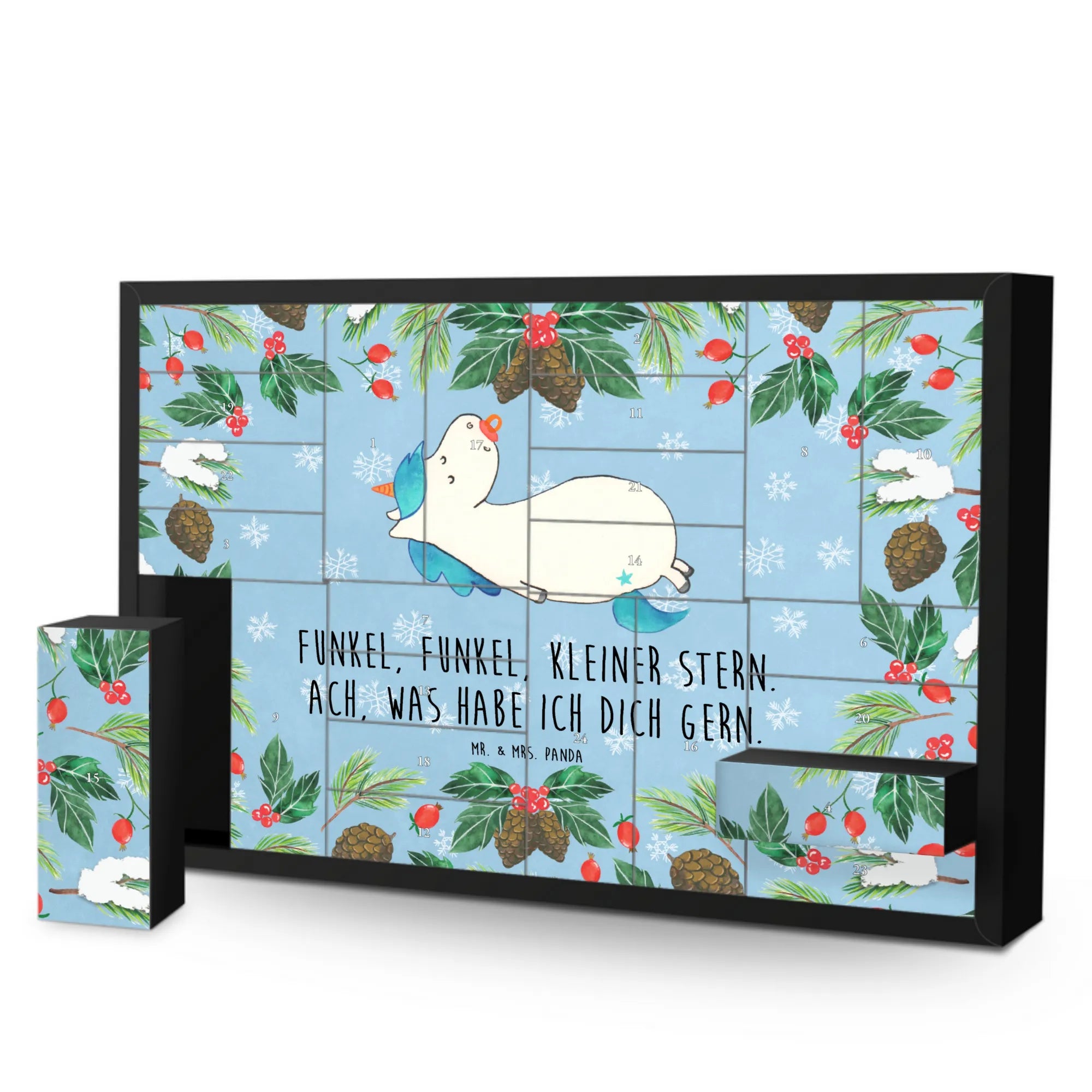 Der befüllbare Adventskalender Einhorn Schnullie von Mr. & Mrs. Panda ist das perfekte Geschenk für kleine Einhorn-Fans und zur Adventszeit! Mit liebevollen, handgezeichneten Motiven von Mrs. Panda und dem tollen Spruch "Funkel, Funkel, kleiner Stern. Ach, was habe ich dich gern." bringt dieser Kalender nicht nur Freude, sondern auch eine zauberhafte Atmosphäre in jedes Zuhause.