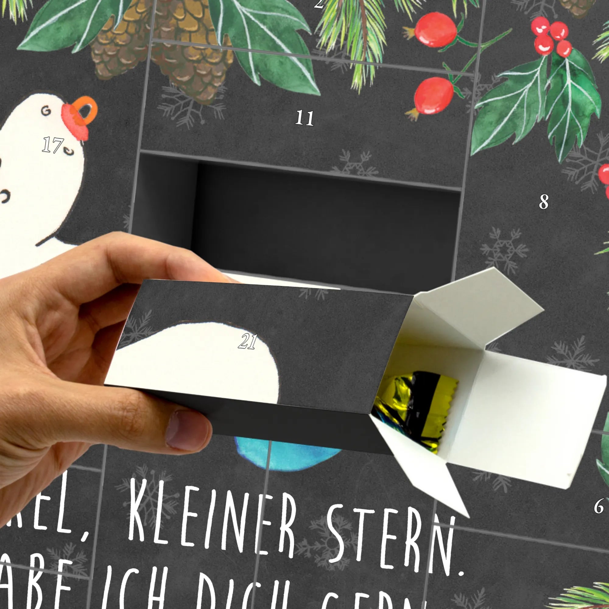 Unser Adventskalender zum Befüllen von Mr. & Mrs. Panda macht das Warten aufs Christkind noch schöner! Der Adventskalender zum Befüllen ist liebevoll gestaltet, mit zauberhaften Motiven und warmen Sprüchen bedruckt – typisch Mr. & Mrs. Panda. Auf der Frontseite findest du eine niedliche Zeichnung von Mrs. Panda, die sofort ein Lächeln schenkt. Der Kalender besteht aus stabilem Adventskalender Karton und verfügt über 24 praktische Schachteln zum individuellen Bestücken. Die Druckqualität ist brillant, die Oberfläche seidenmatt und fühlt sich edel an. Eine integrierte Aufstellvorrichtung sorgt dafür, dass der Kalender dekorativ steht, zum Beispiel auf dem Sideboard oder der Fensterbank. Wichtig: Der Kalender ist nicht personalisierbar und wird ohne Inhalt geliefert, damit du ihn ganz nach deinem Geschmack befüllen kannst. Maße: Breite: 619 mm, Höhe: 405 mm, Tiefe: 50 mm. Ob für Kinder, Freunde oder dich selbst – dieser Adventskalender zum Befüllen bringt jeden Tag eine kleine Freude und ist gleichzeitig ein hübsches Deko-Objekt in der Vorweihnachtszeit.