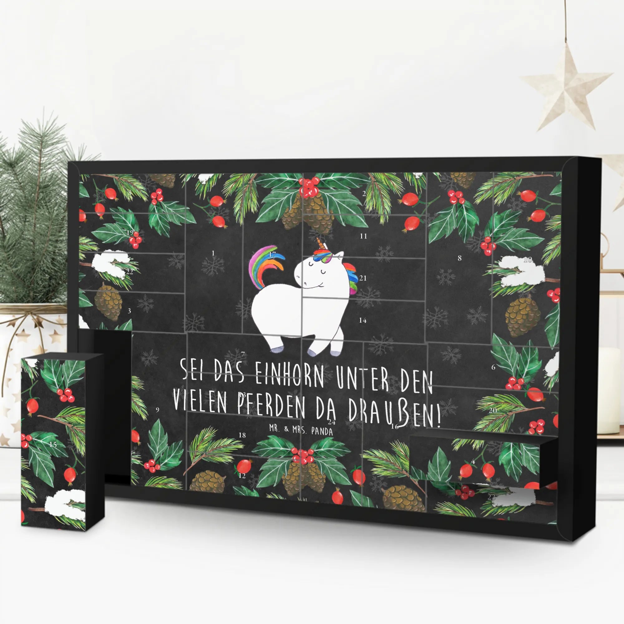Der wunderschöne Befüllbare Adventskalender mit dem zauberhaften Motiv "Einhorn stolzierend" aus der Einhorn-Kollektion von Mr. & Mrs. Panda ist das perfekte Geschenk für alle Einhornliebhaber!