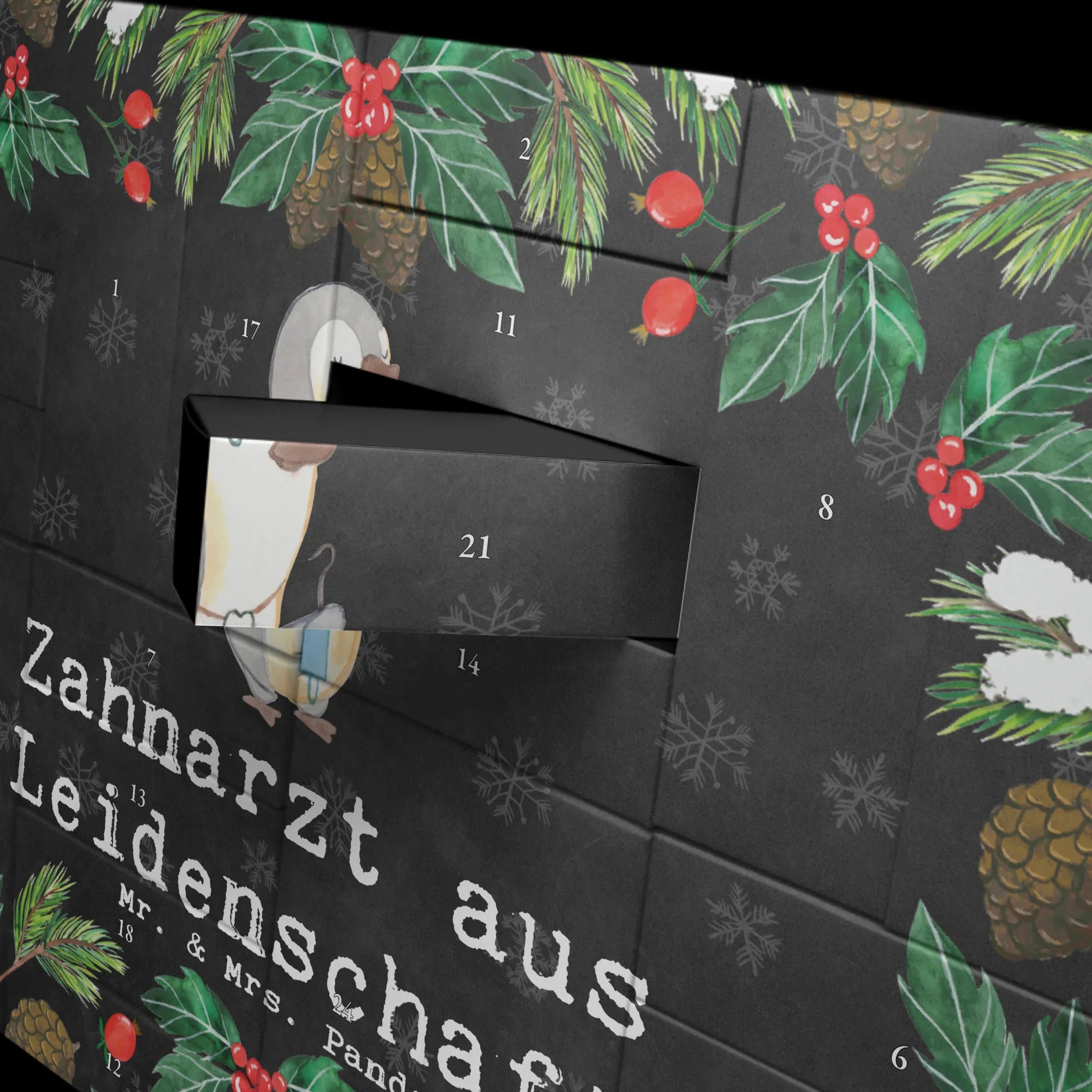 Mit 24 Schachteln, die Du nach Herzenslust befüllen kannst, lädst Du zu täglichen Überraschungen ein. Die liebevolle Zeichnung von Mrs. Panda zeigt einen süßen Pinguin, der als Zahnärztin auftritt, und wird jeden Tag ein Lächeln ins Gesicht zaubern. Durch die brillante Druckqualität mit seidenmatter Oberfläche wirkt das Design lebendig und ansprechend.