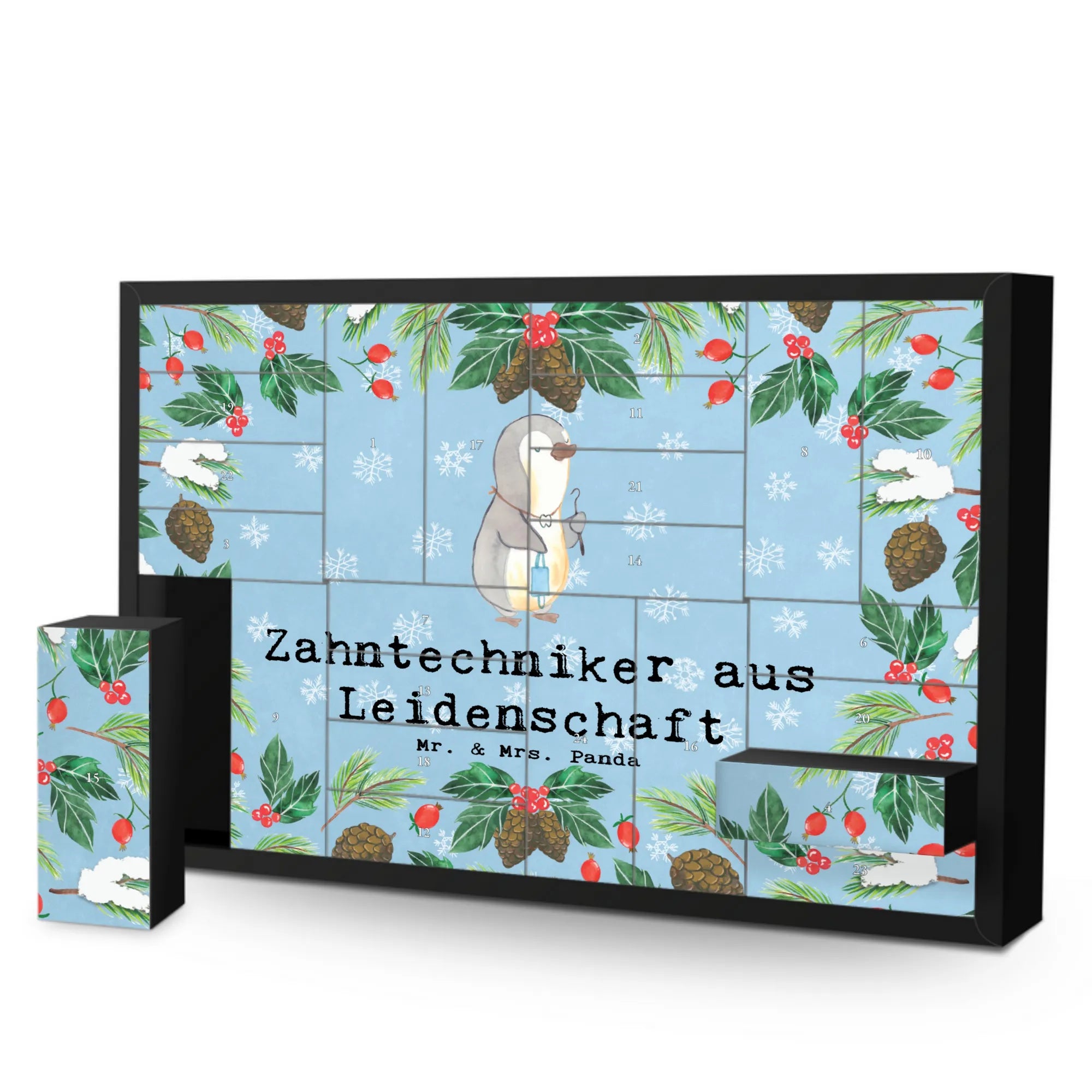 Er ist nicht nur ein schöner Blickfang, sondern bietet mit seinen 24 Schachteln ausreichend Platz für kleine Leckereien oder persönliche Überraschungen. Die liebevolle Zeichnung von Mrs. Panda zeigt einen süßen Pinguin, der ein Zahn hält – einfach perfekt für Zahntechniker! Mit diesem Kalender weihnachtliche Vorfreude ins Büro bringen.