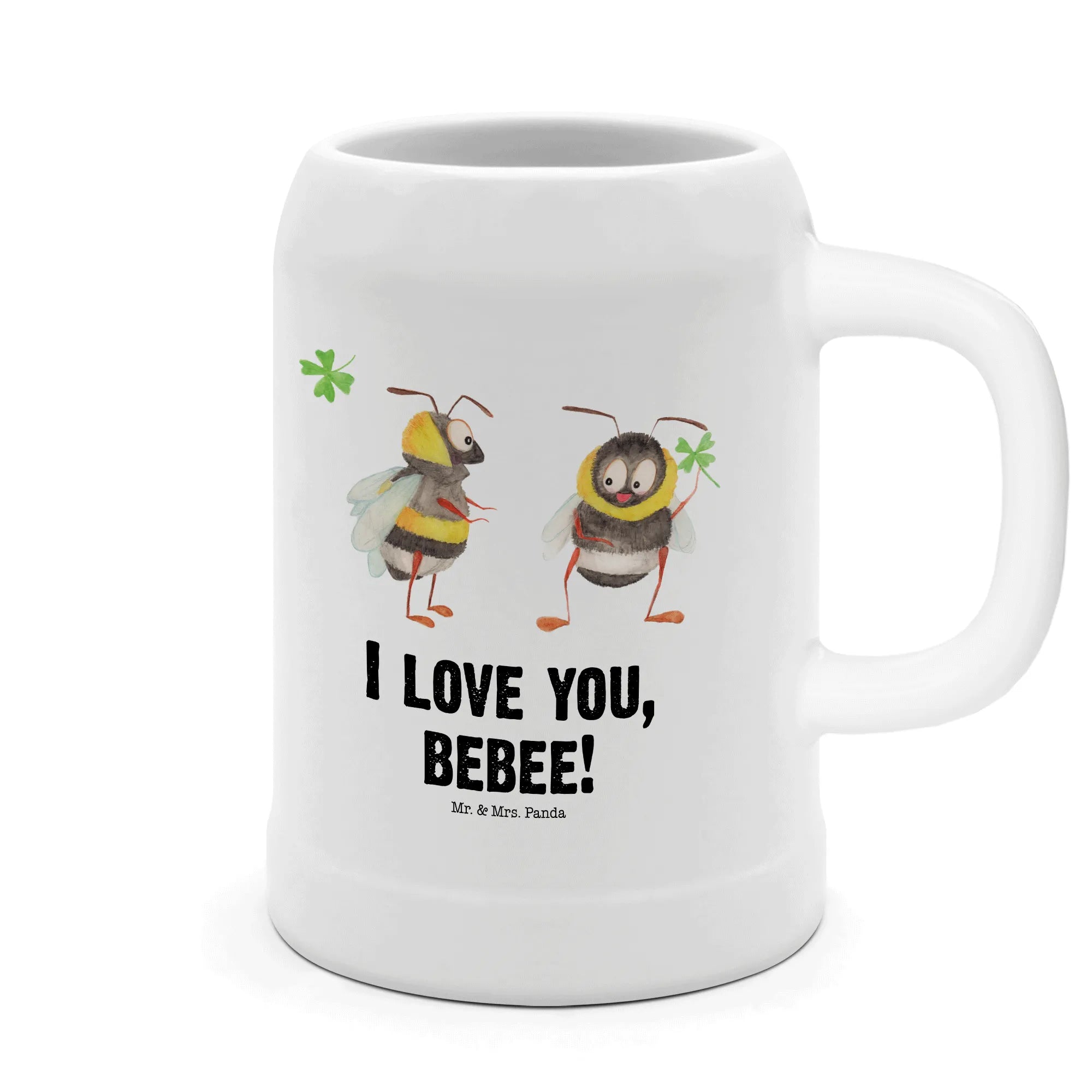 Mit einem niedlichen Motiv von zwei verliebten Bienen, die sich anblicken und ein vierblättriges Kleeblatt halten, ist dieser Krug ein echter Hingucker. Die Bienen strahlen Freude und Verbundenheit aus und sind im verspielten, charmanten Stil gehalten. Ideal, um deinen Liebsten zu zeigen, dass du an sie denkst! Der Spruch "I love you, bebee!" bringt zusätzlich eine süße Liebesbotschaft mit, die an besonderen Anlässen wie Valentinstag, Jahrestag oder Hochzeitstag für Schmetterlinge im Bauch sorgt.