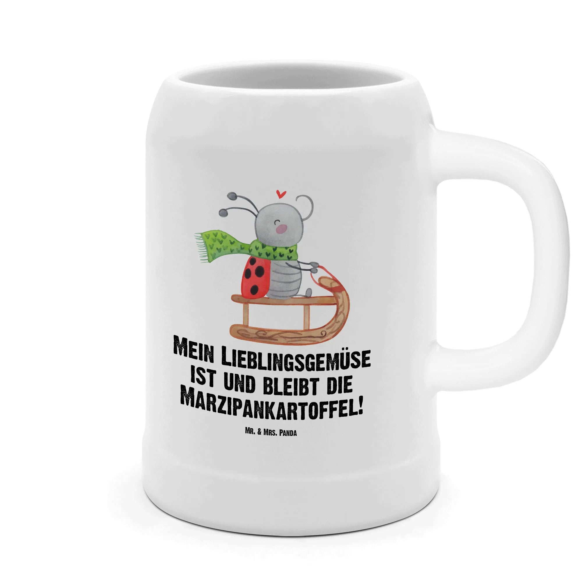 Das fröhliche Design mit einem lächelnden Marienkäfer auf seinem Schlitten, der einen grünen Schal trägt, sorgt für gute Laune und passt perfekt zu jeder winterlichen Feier. Ob beim Weihnachtsmarkt, bei der Adventsfeier oder einfach gemütlich zu Hause – dieser Krug macht bei jeder Gelegenheit eine gute Figur. Der Spruch „Mein Lieblingsgemüse ist und bleibt die Marzipankartoffel!“ bringt zusätzlich einen Schmunzler auf die Lippen.