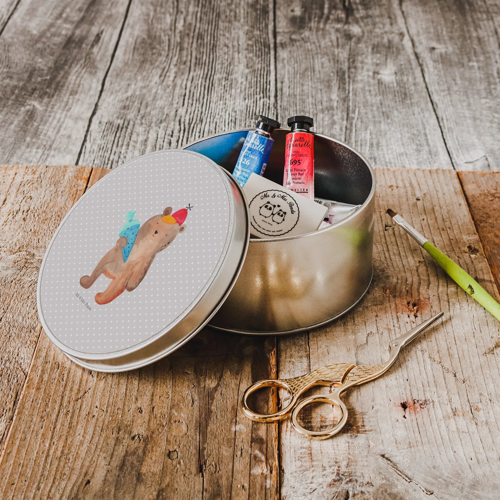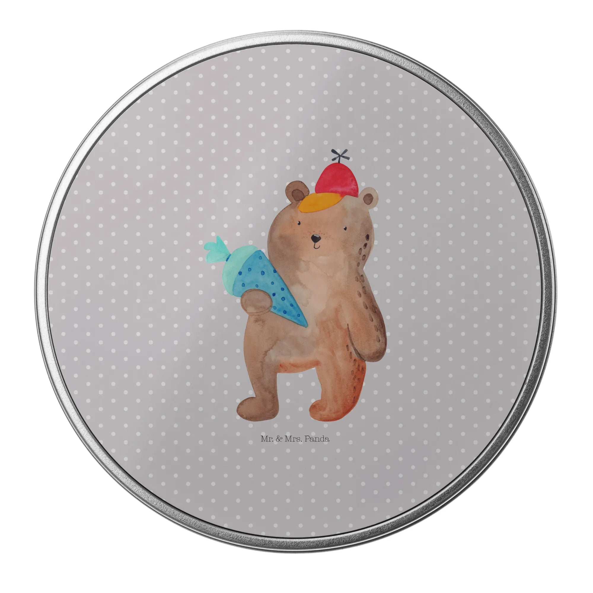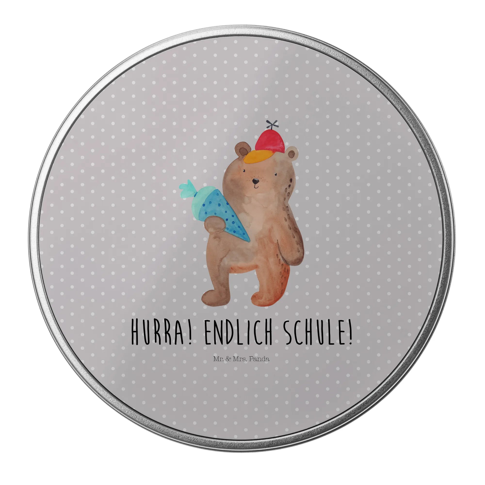 Die runde Blechdose von Mr. & Mrs. Panda mit dem süßen Bär mit Schultüte Motiv ist das perfekte Geschenk für den aufregenden ersten Schultag!