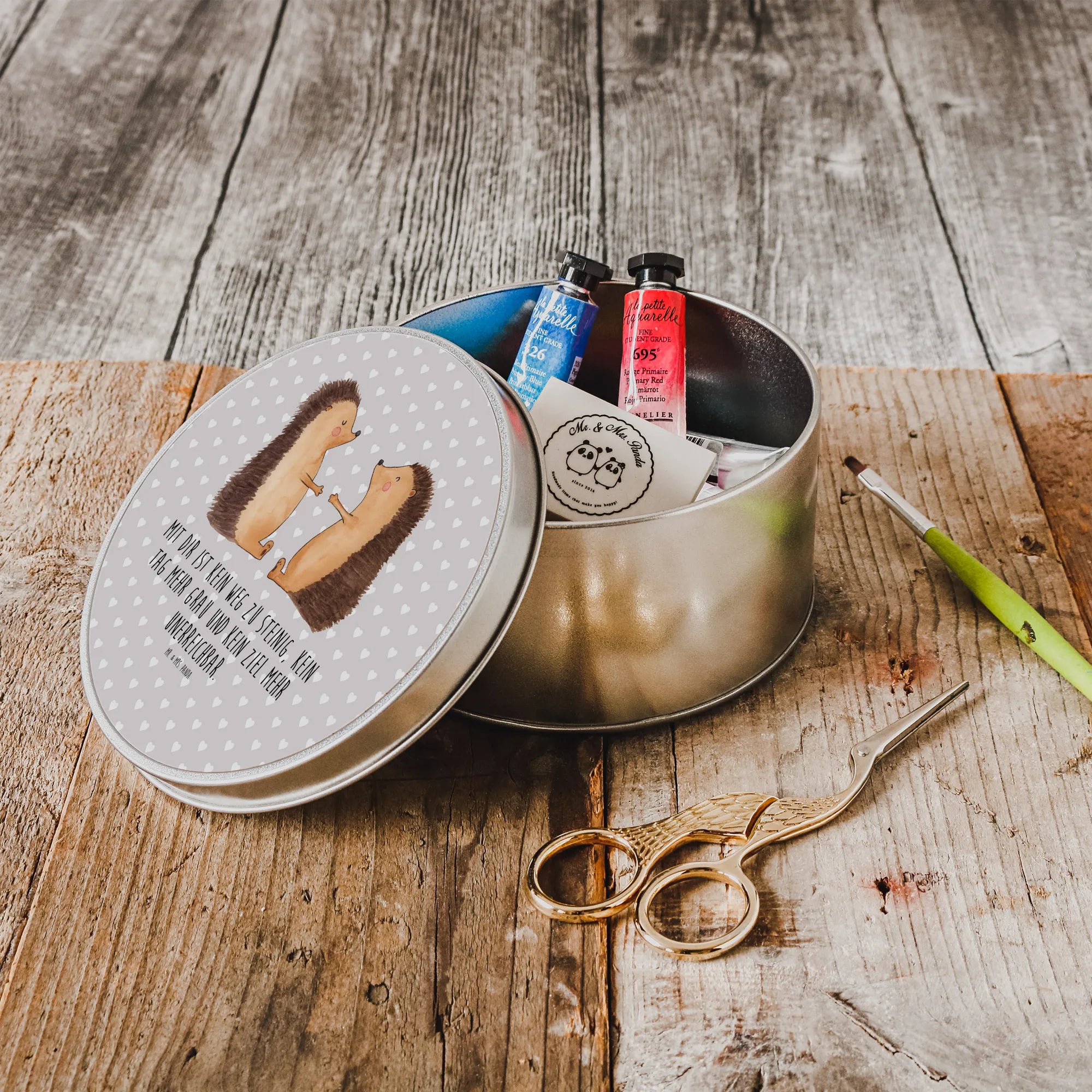 Mit der runden Blechdose "Igel Liebe" von Mr. & Mrs. Panda schaffst Du nicht nur Ordnung, sondern verschenkst auch ein Stück Liebe. Glückliche Geschenke, die glücklich machen und für Schmetterlinge im Bauch sorgen – genau das ist es, was diese Dose ausmacht.