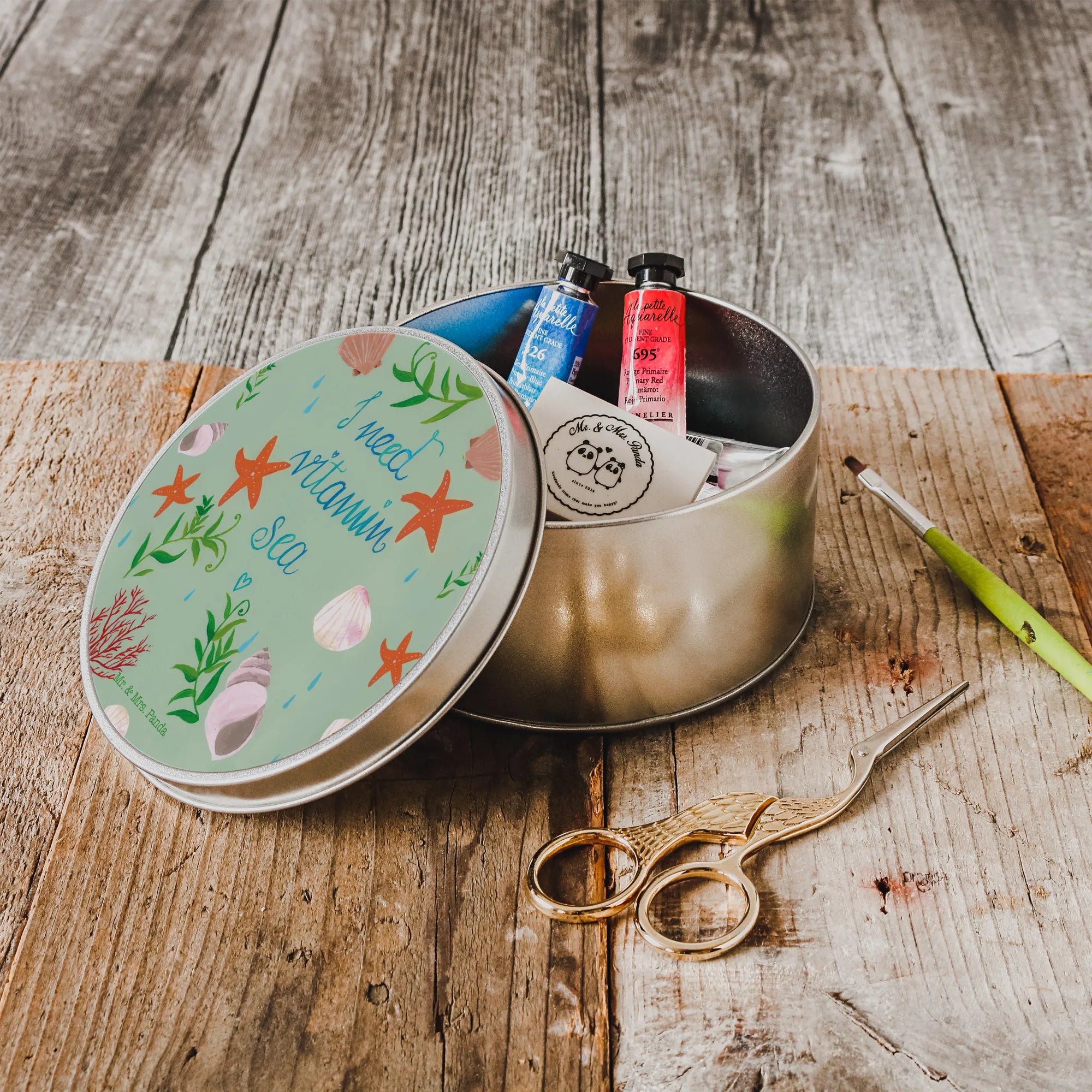 Entdecke die runde Blechdose "Vitamin Sea" aus der Collection Wild & Free von Mr. & Mrs. Panda. Diese wunderschöne Aufbewahrungsbox aus hochwertigem Metall hat einen Durchmesser von 150 mm und eine Höhe von 150 mm. Ideal für die Aufbewahrung von Keksen, Süßigkeiten oder kleinen Erinnerungen, bringt sie ein Stück Strandfeeling in dein Zuhause.