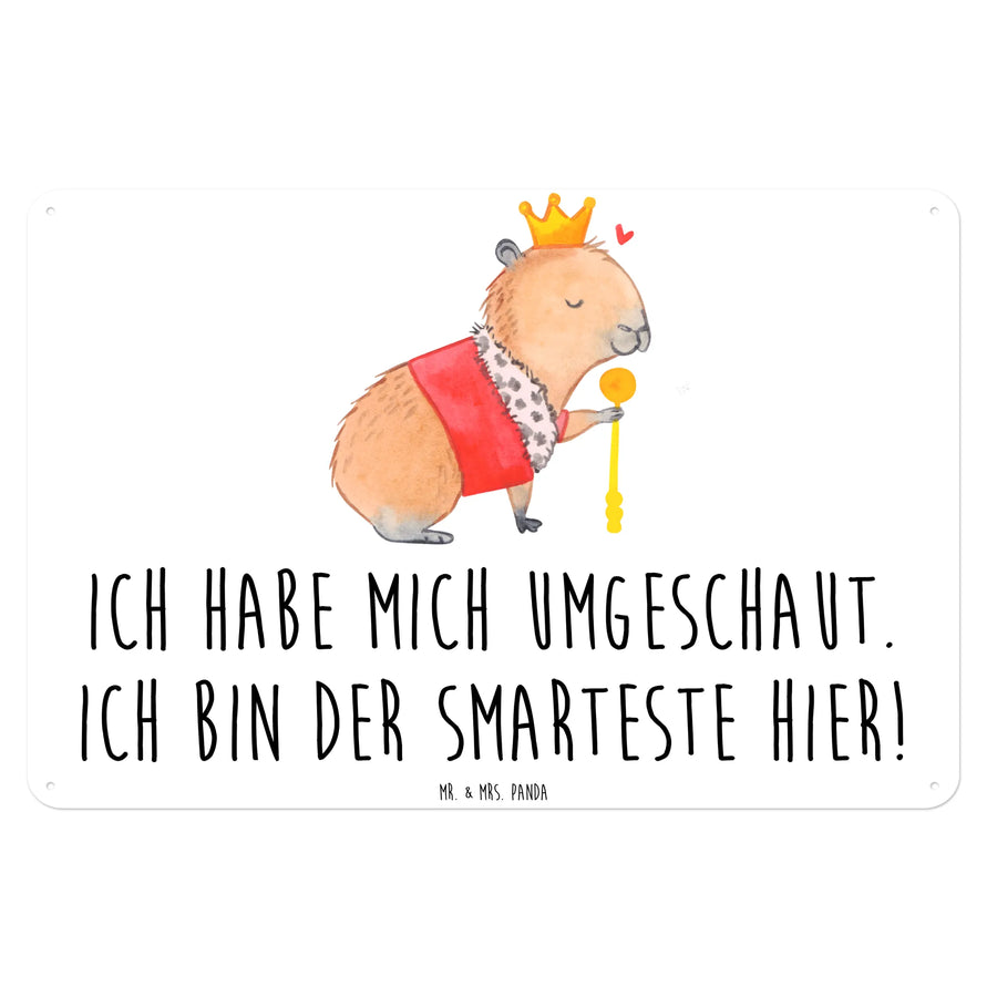 Das handgezeichnete Motiv zeigt ein majestätisches Capybara, das mit einer goldenen Krone und einem purpurroten Mantel ausgestattet ist. Die liebevollen Details, wie das kleine Herzchen über dem Kopf des Capybaras, verleihen diesem Schild eine besondere Note. Der Spruch "Ich habe mich umgeschaut. Ich bin der Smarteste hier!" bringt jeden zum Schmunzeln und ist perfekt für Jung und Alt.