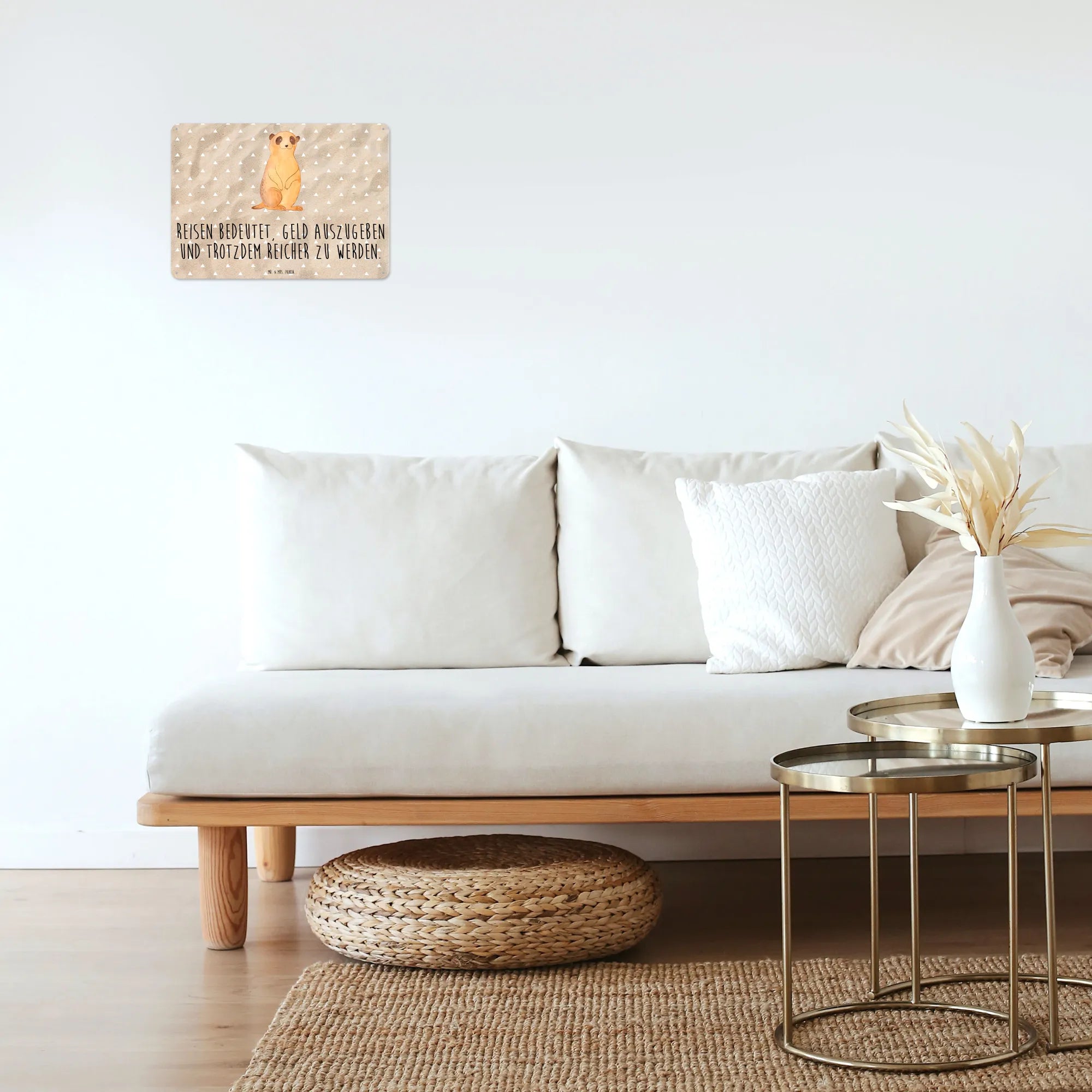 Es ist nicht nur schick, sondern auch ein perfektes Geschenk für Reisen-Enthusiasten und Naturliebhaber. Mit einem niedlichen, neugierigen Erdmännchen und dem Spruch 'Reisen bedeutet, Geld auszugeben und trotzdem reicher zu werden', zaubert dieses Schild jedem ein Lächeln ins Gesicht.