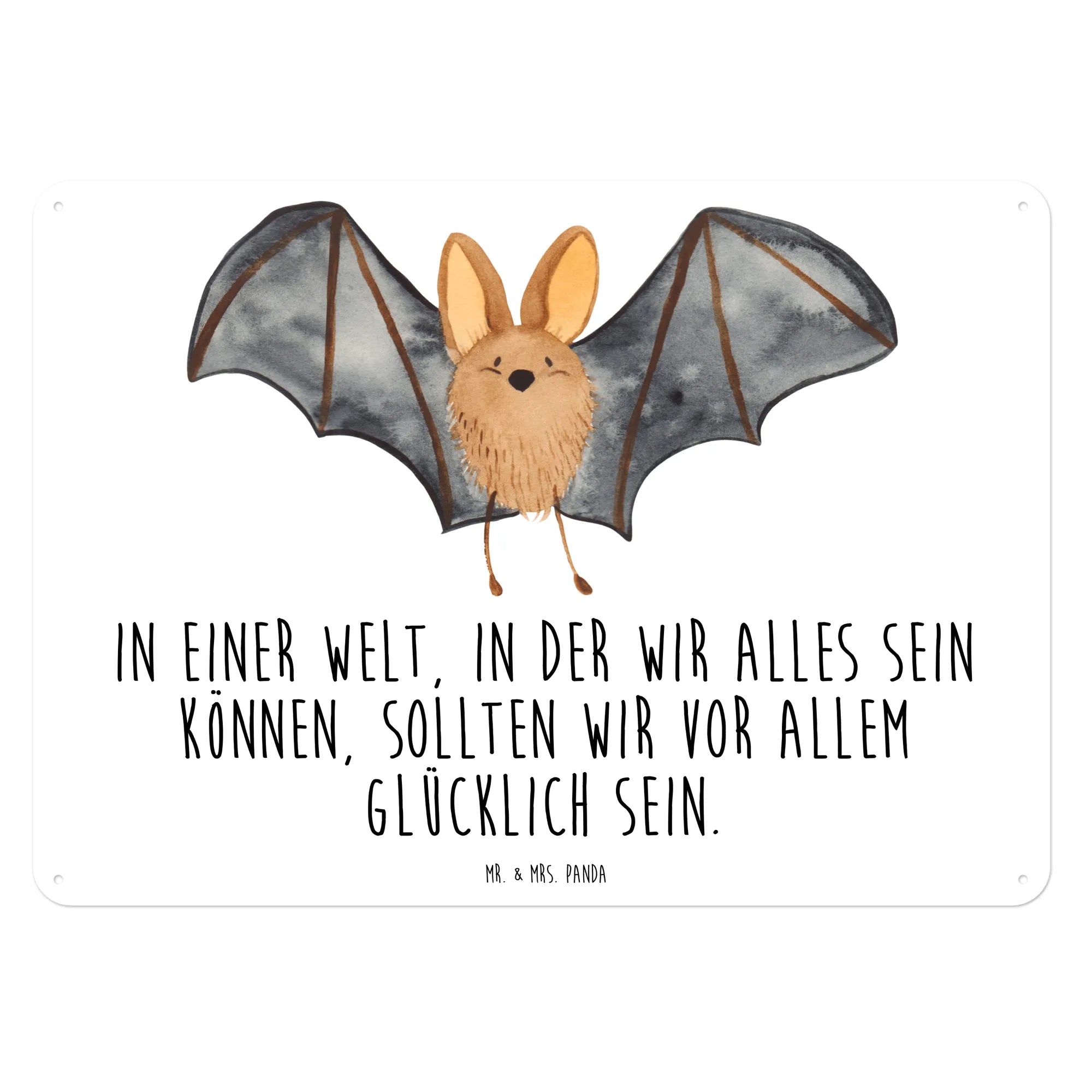 Das edle Blechschild Fledermaus Flügel aus der Small World Kollektion von Mr. & Mrs. Panda ist das perfekte Geschenk für alle, die das Besondere lieben und Freude an einzigartiger Deko haben. Mit einem zauberhaften Design, das eine niedliche, fliegende Fledermaus zeigt und dem inspirierenden Spruch 'In einer Welt, in der wir alles sein können, sollten wir vor allem glücklich sein.', bringt es gute Laune in jeden Raum.