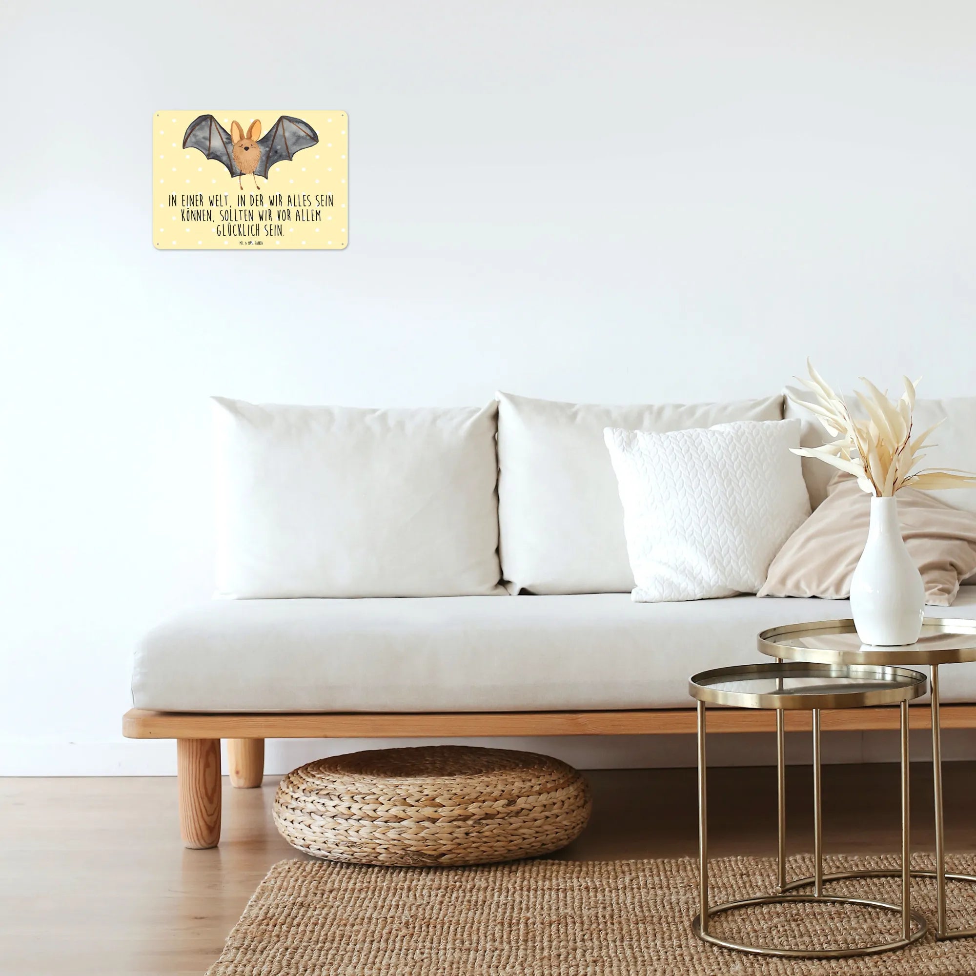 Das bezaubernde Blechschild "Fledermaus Flügel" aus der einzigartigen Small World Kollektion von Mr. & Mrs. Panda ist ein wunderbares Accessoire für dein Zuhause. Dieses Schild, das eine nostalgische Anmutung hat, zeigt eine charmante Fledermaus, die durch die Luft fliegt und dabei die Botschaft vermittelt: "In einer Welt, in der wir alles sein können, sollten wir vor allem glücklich sein."